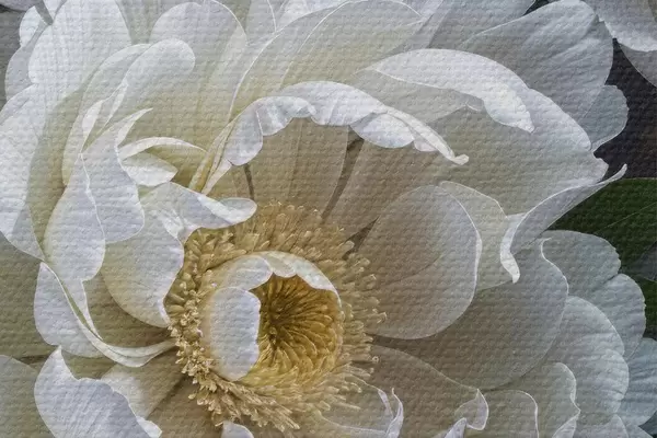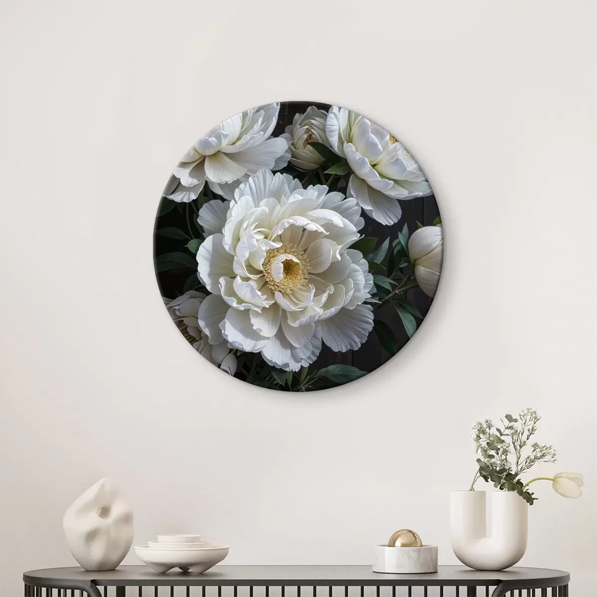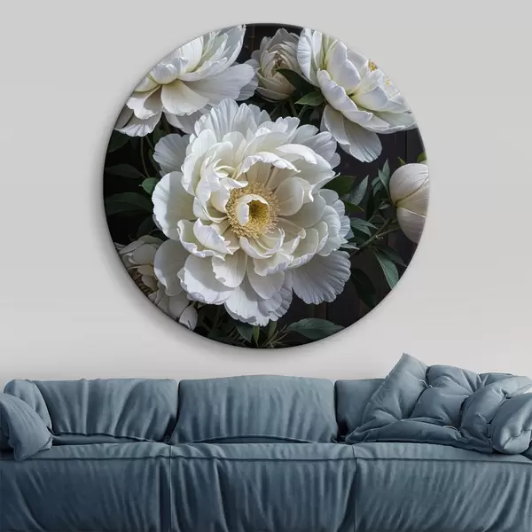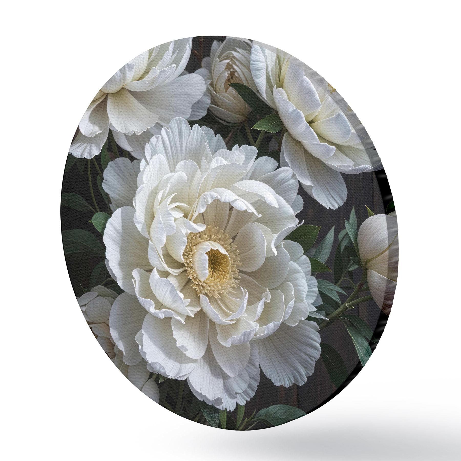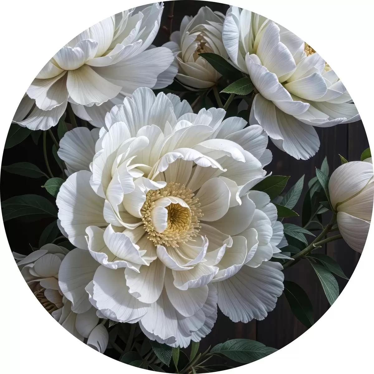 Runde Gemälde Weiße Pfingstrose Blumen mit gelben Zentren blühen im Garten auf einem dunklen Hintergrund r40600