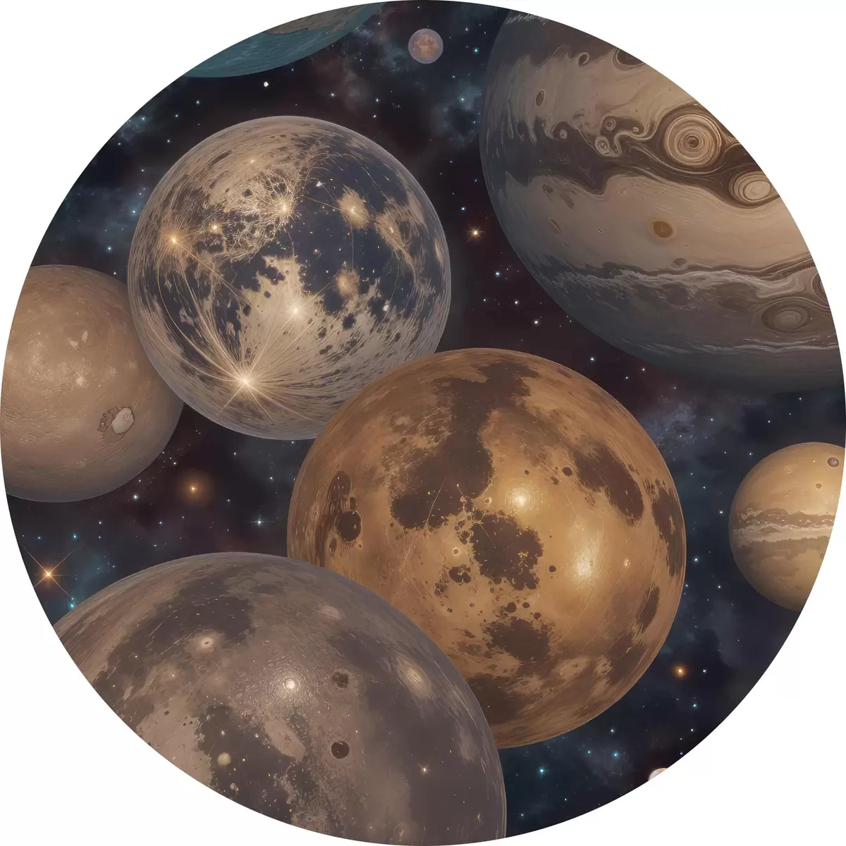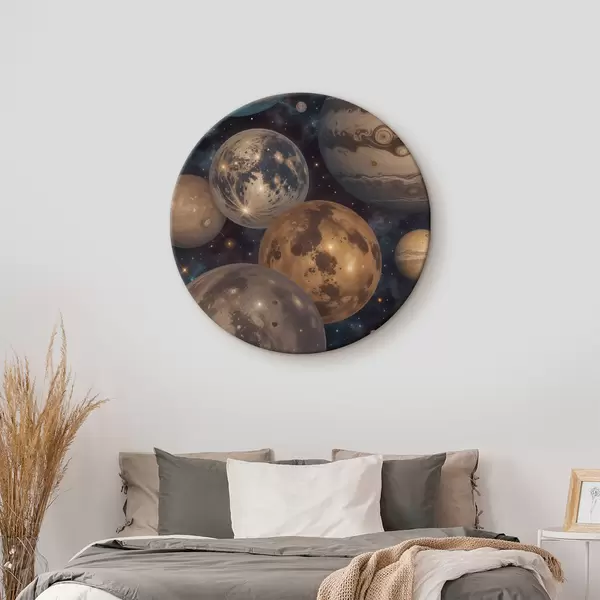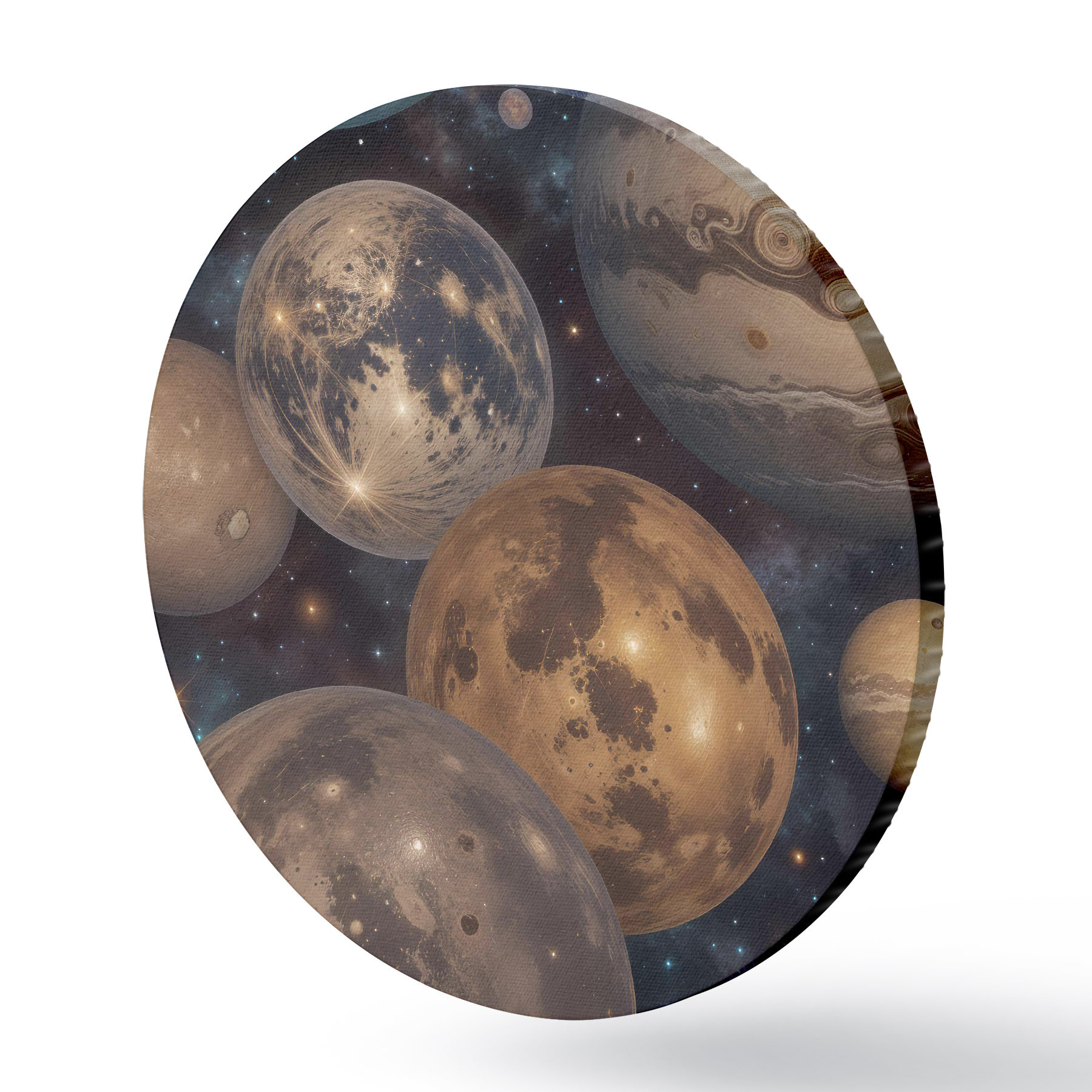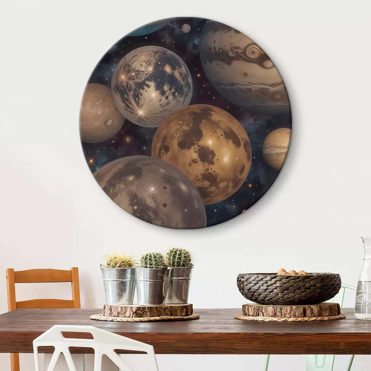 Runde Gemälde Abstrakter Weltraumdruck mit bunten Planeten und Monden, die im nächtlichen Sternenhimmel schweben r40607