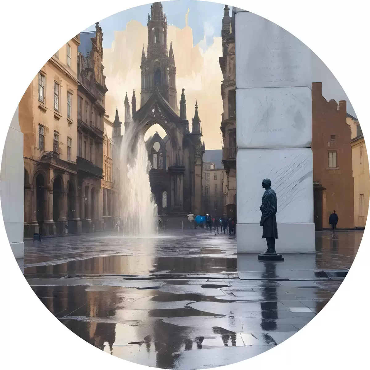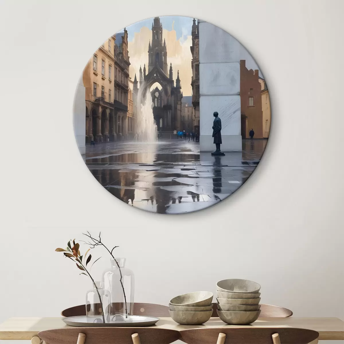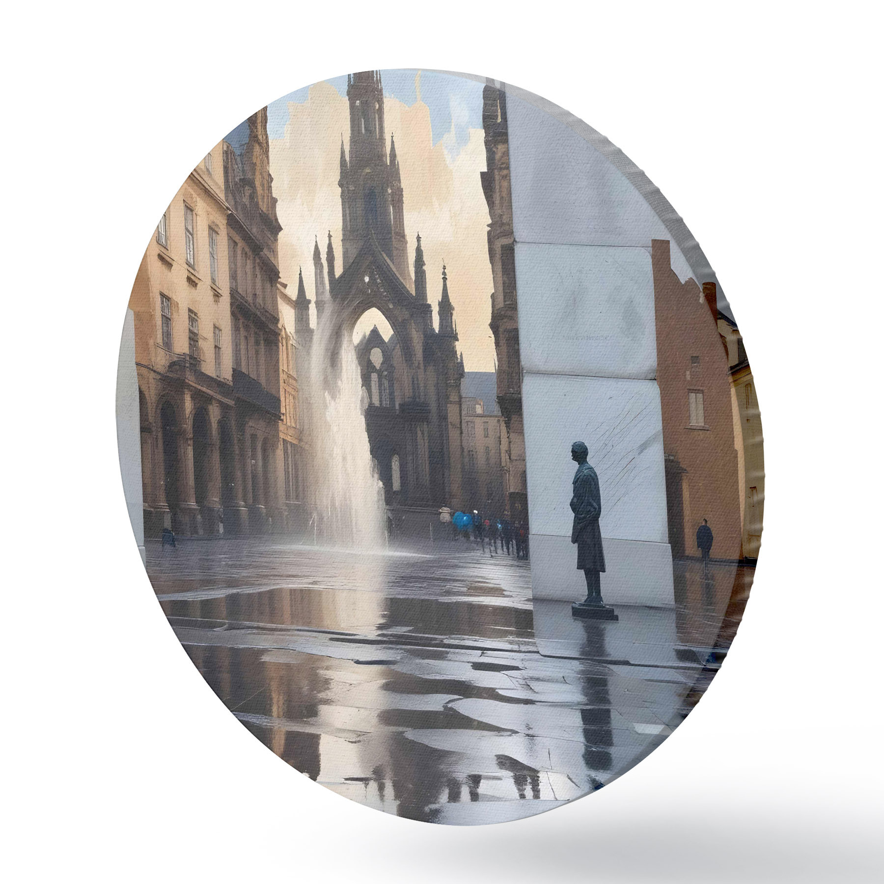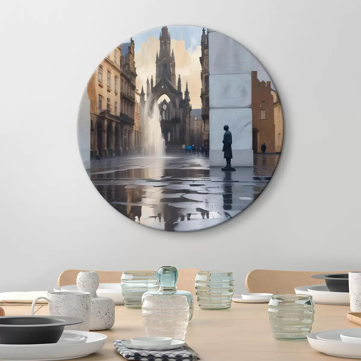 Runde Gemälde Im Hintergrund steht eine mittelalterliche Kathedrale mit gotischer Architektur, deren Türme in den Himmel ragen r40611