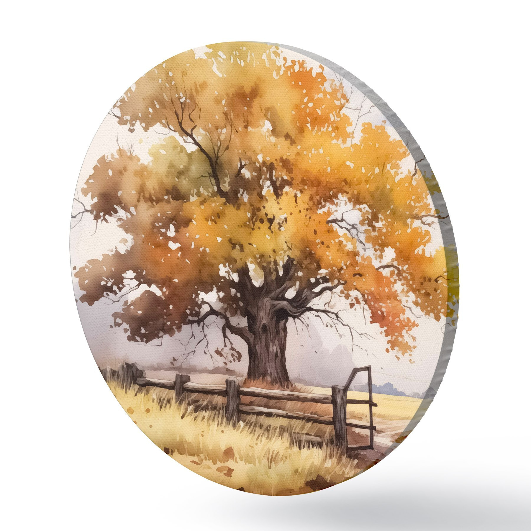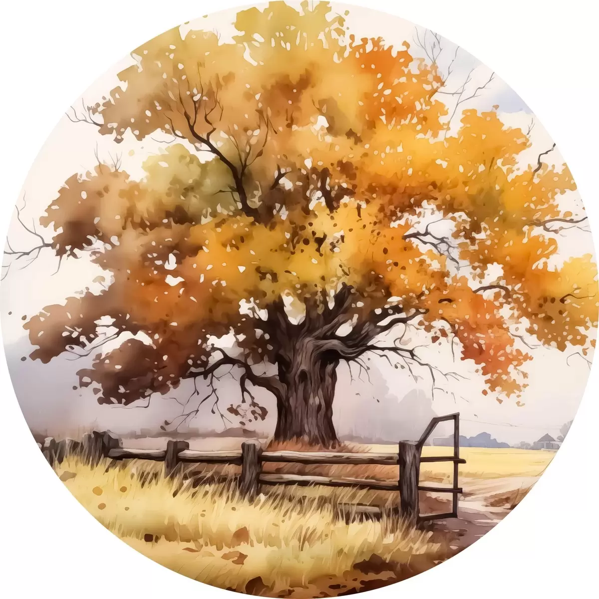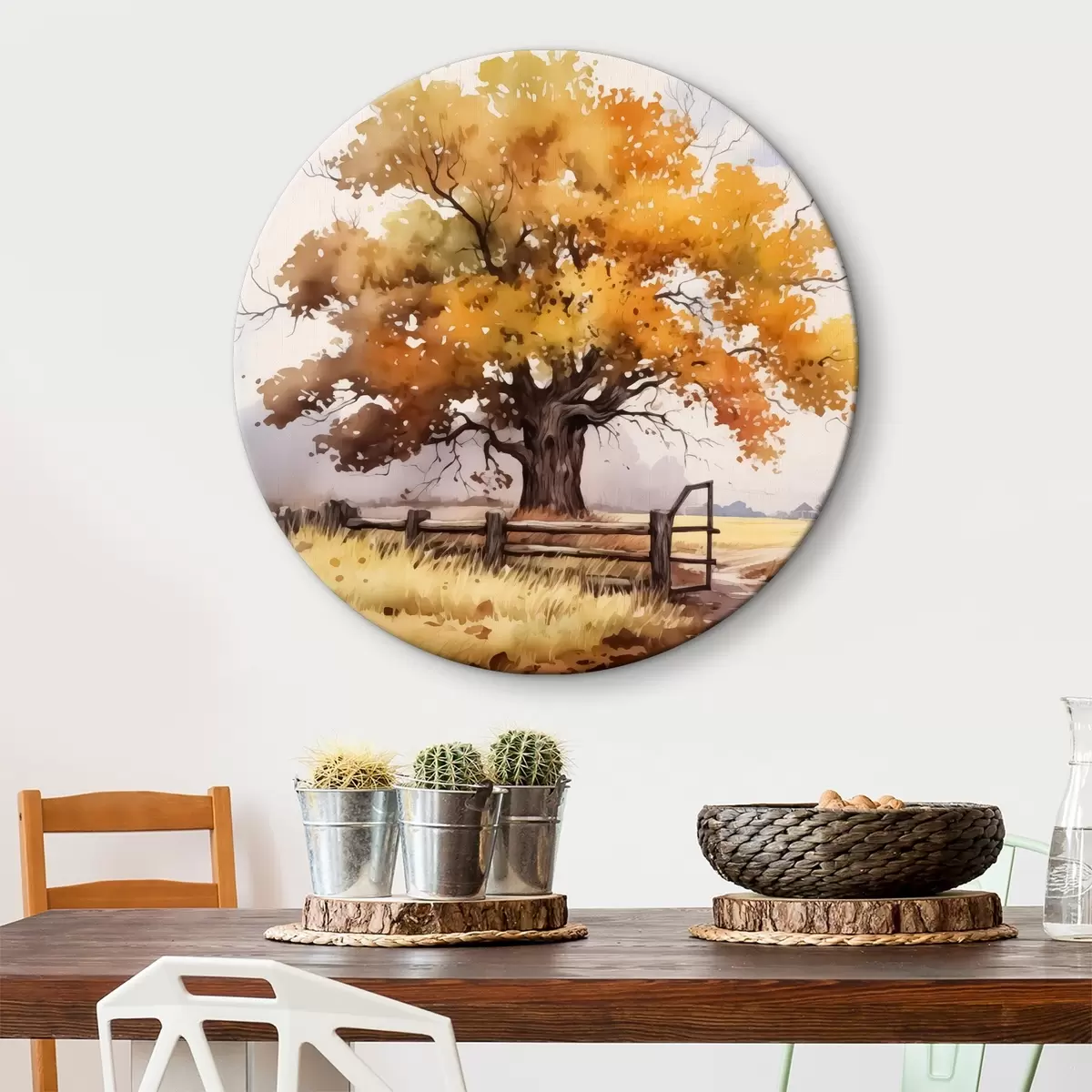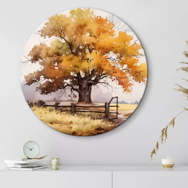 Runde Gemälde Baum auf dem Feld in der Nähe des Zauns mit vergilbten Blättern, Herbstlandschaft r40680