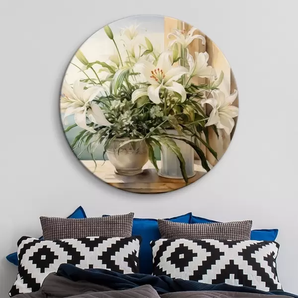 Runde Gemälde Weiße Lilien in einer Vase auf dem Balkon mit Blick auf das Meer und die Berge Aquarell r40682