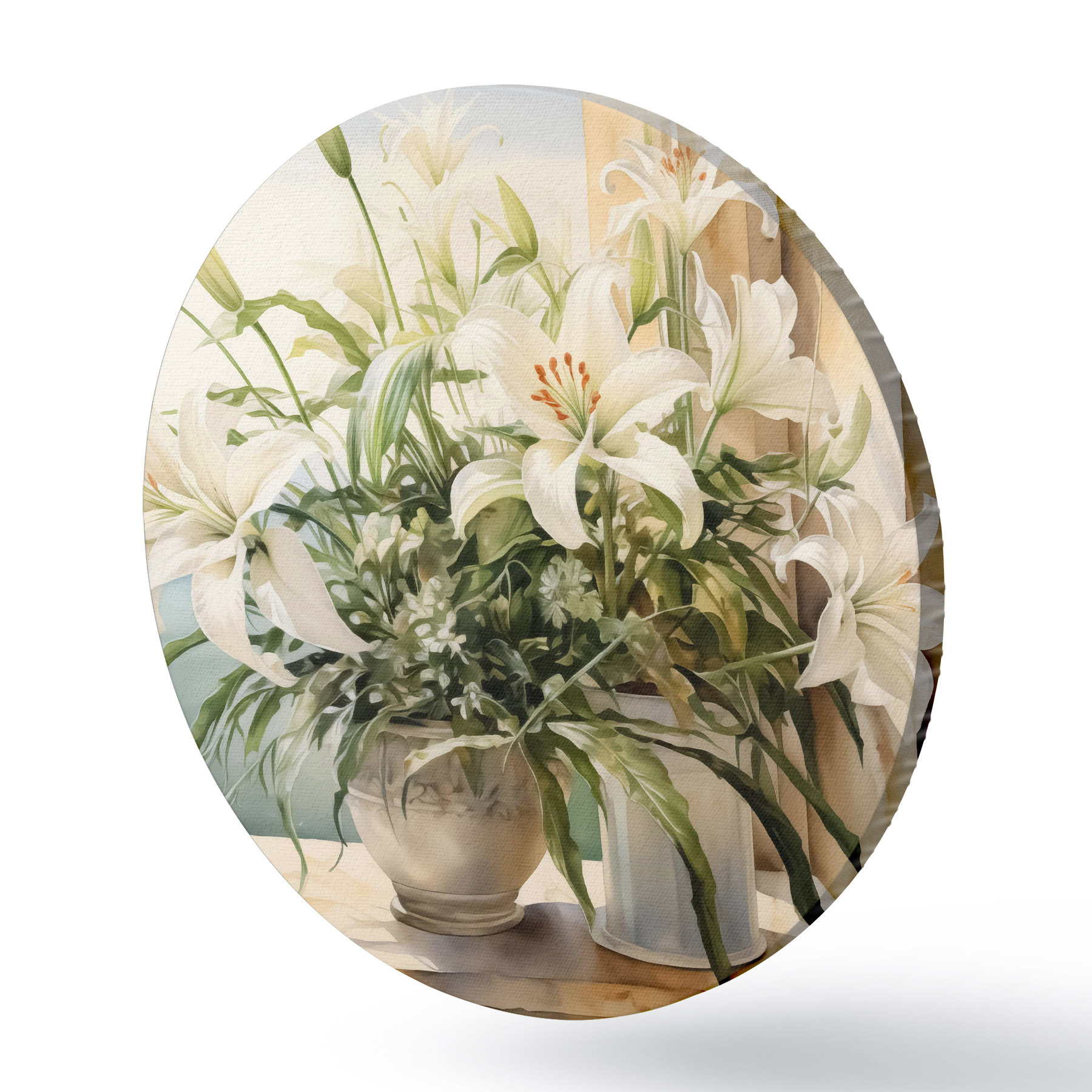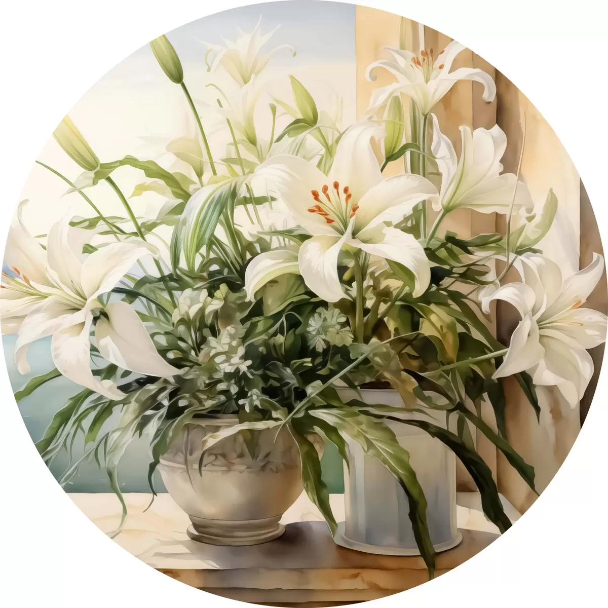 Runde Gemälde Weiße Lilien in einer Vase auf dem Balkon mit Blick auf das Meer und die Berge Aquarell r40682