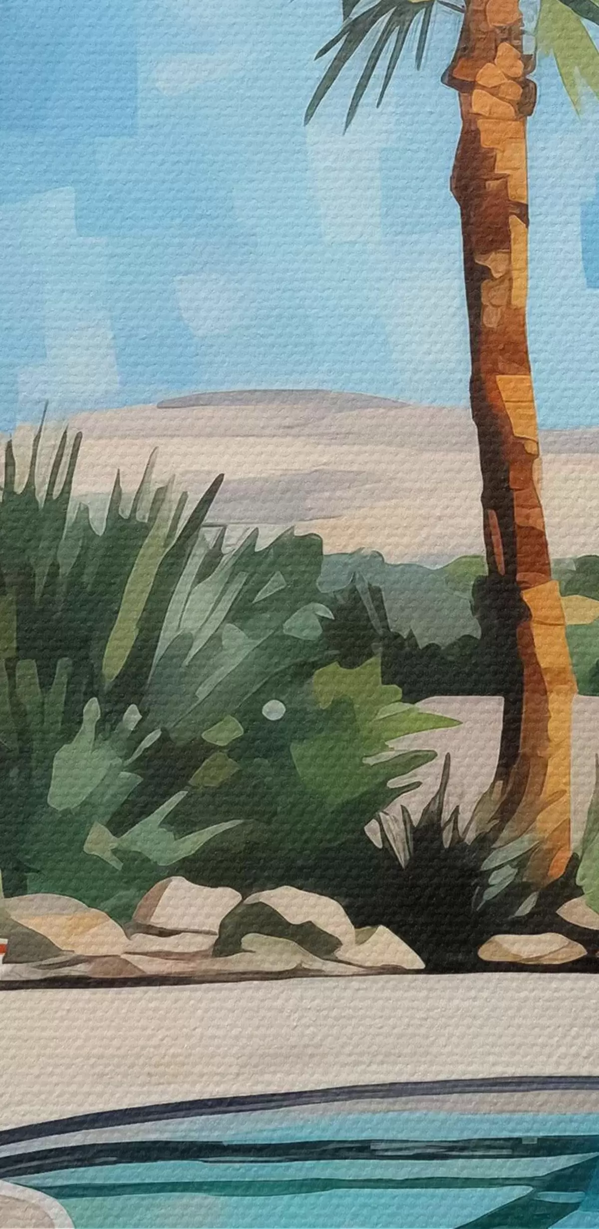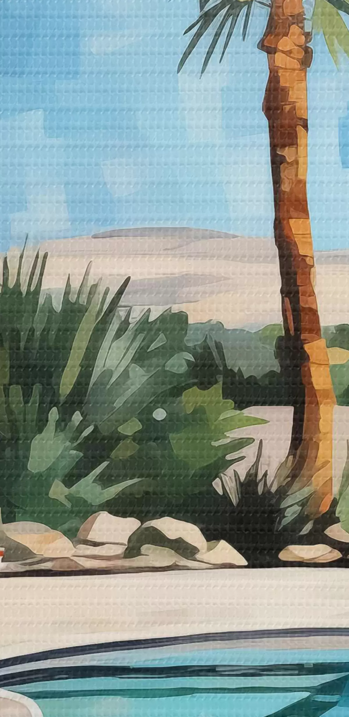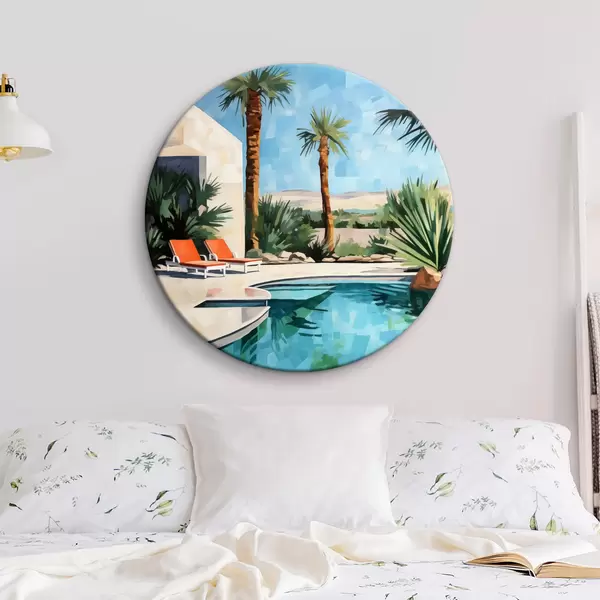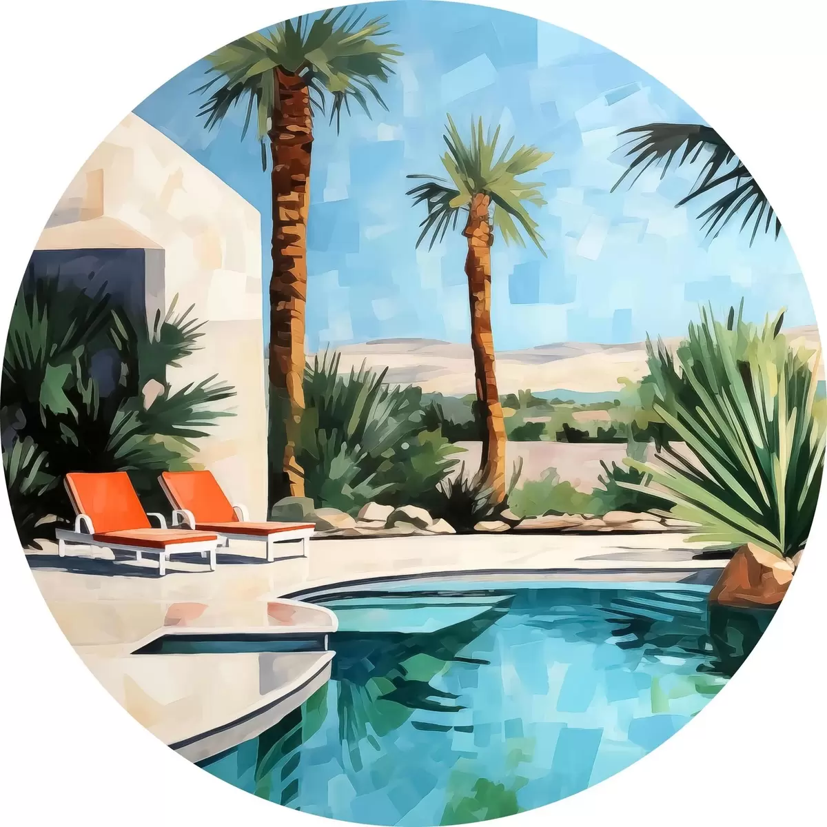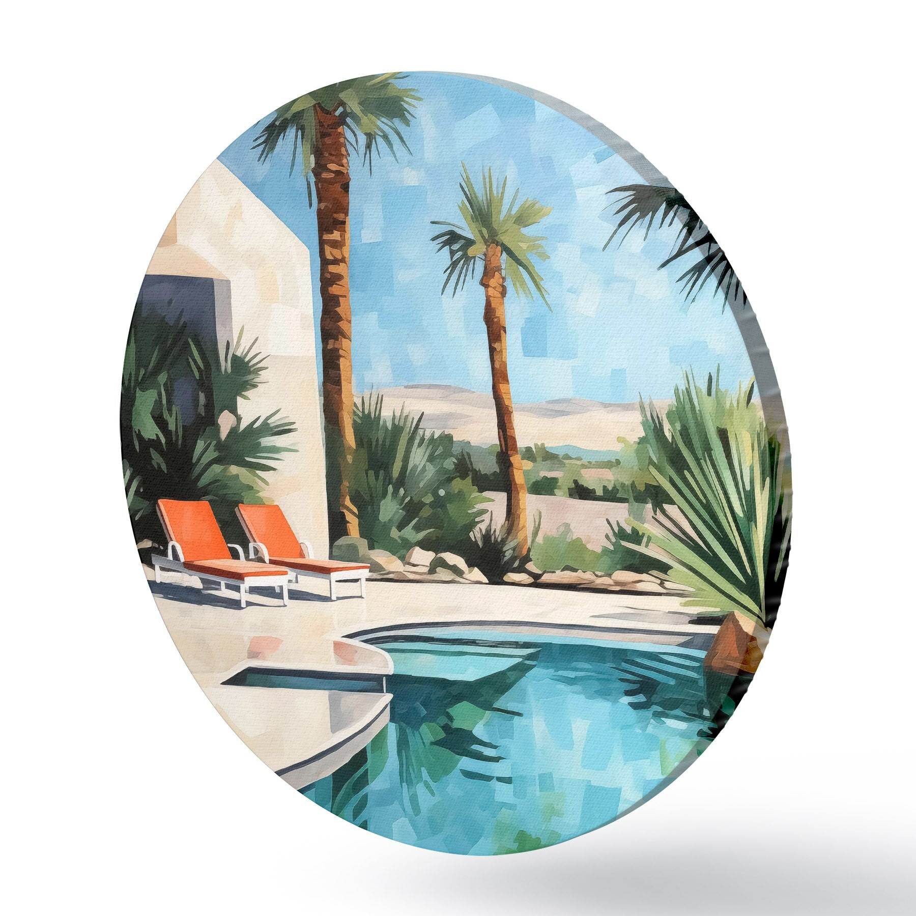 Runde Gemälde Palmen in der Nähe des Hotels mit einem Schwimmbad in der Nähe der Felsen, blau, grün, rot Farben r40748