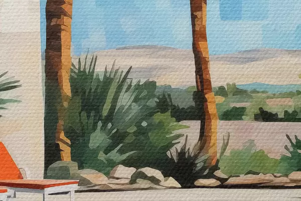 Bild Palmen in der Nähe des Hotels mit einem Schwimmbad in der Nähe der Felsen, blau, grün, rot Farben Nr r40748