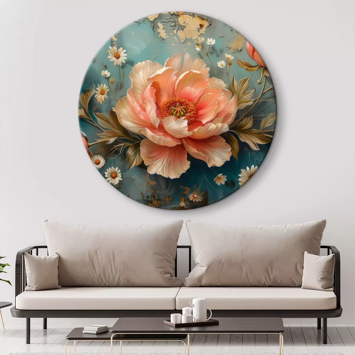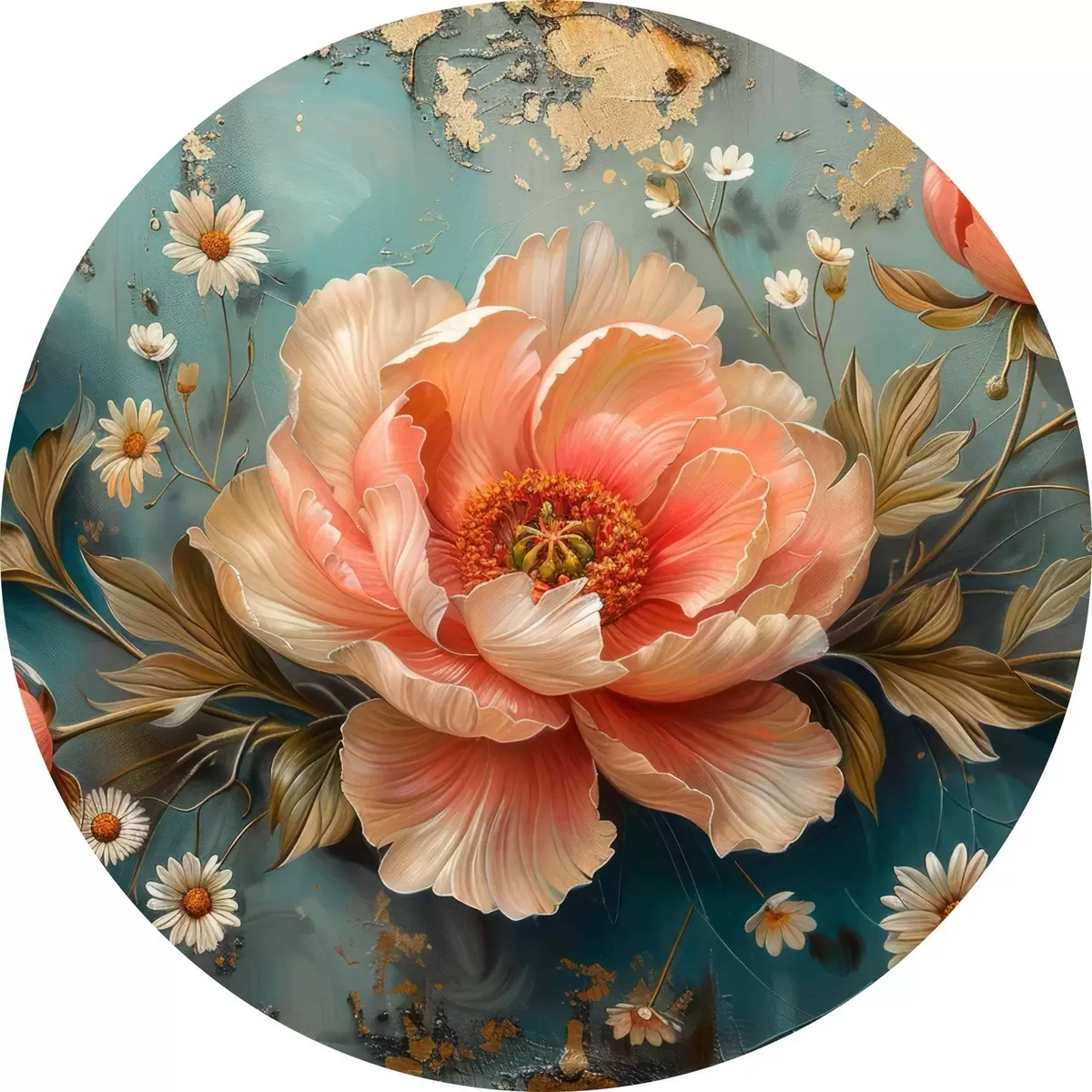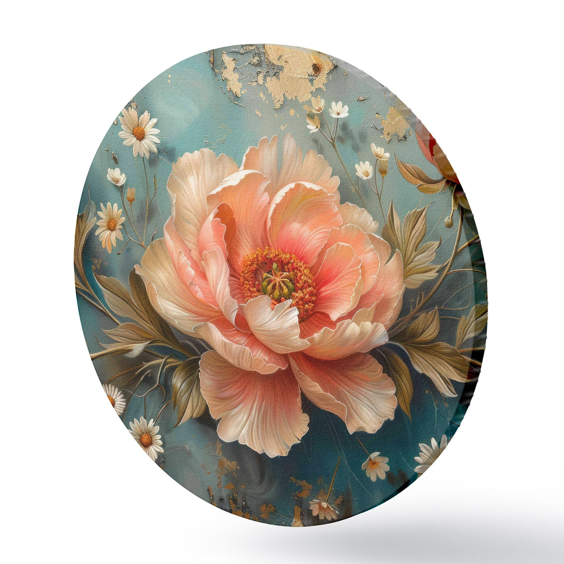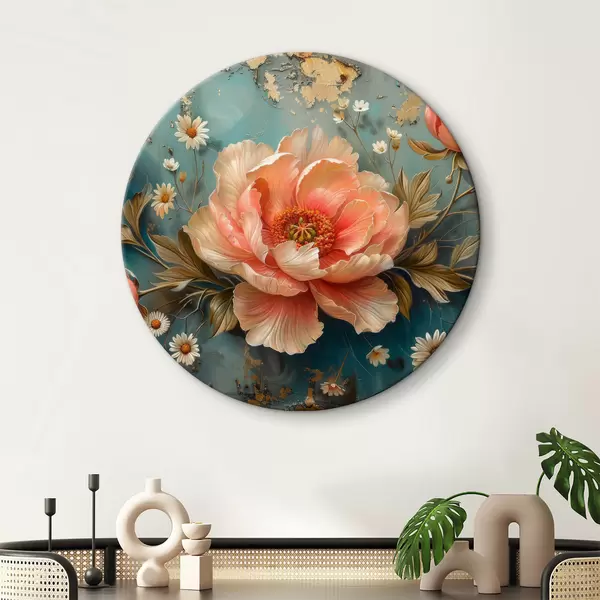 Runde Gemälde Rose, türkisfarbener Hintergrund, kleine Blumen r40781