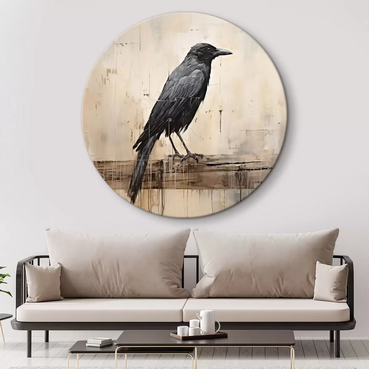 Runde Gemälde Schwarzer Rabe auf einem Baumstamm sitzend auf einem abstrakten Hintergrund r40808