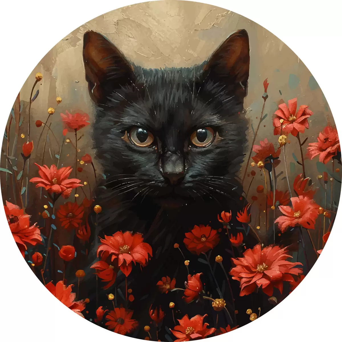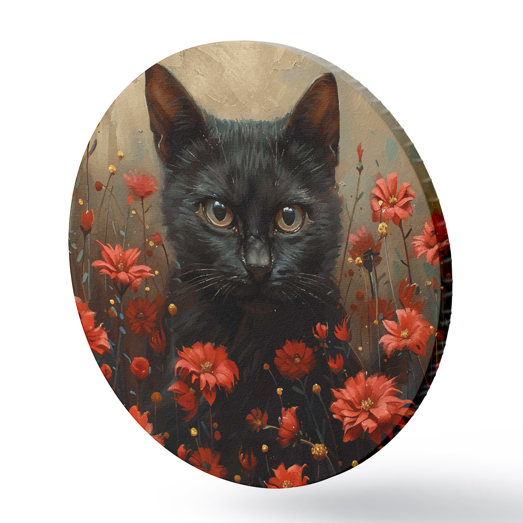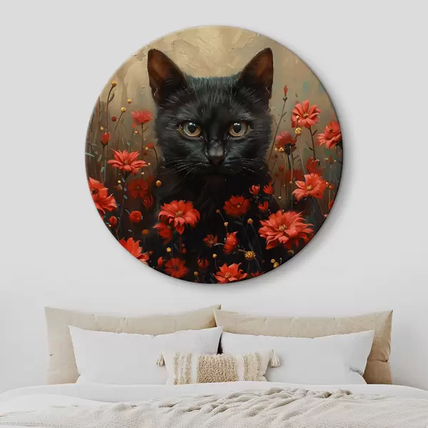 Runde Gemälde Katze, Blumen, schwarze Katze r40839