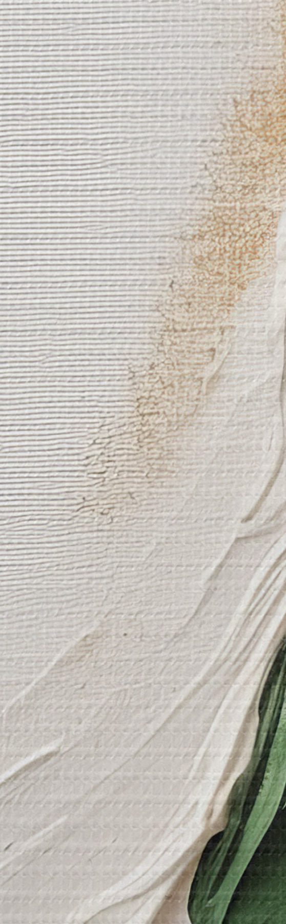 Das Bild kann vorsichtig mit einem trockenen, weichen Tuch oder Schwamm abgewischt werden; es wird nicht empfohlen, feuchte Produkte zu verwenden. Die Verwendung eines feuchten Schwamms ist nur zulässig, wenn das Bild lackiert wurde.
