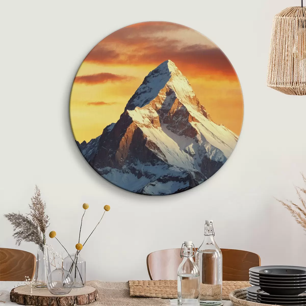 Runde Gemälde Schneebedeckter Berg und orangefarbener Himmel r40852