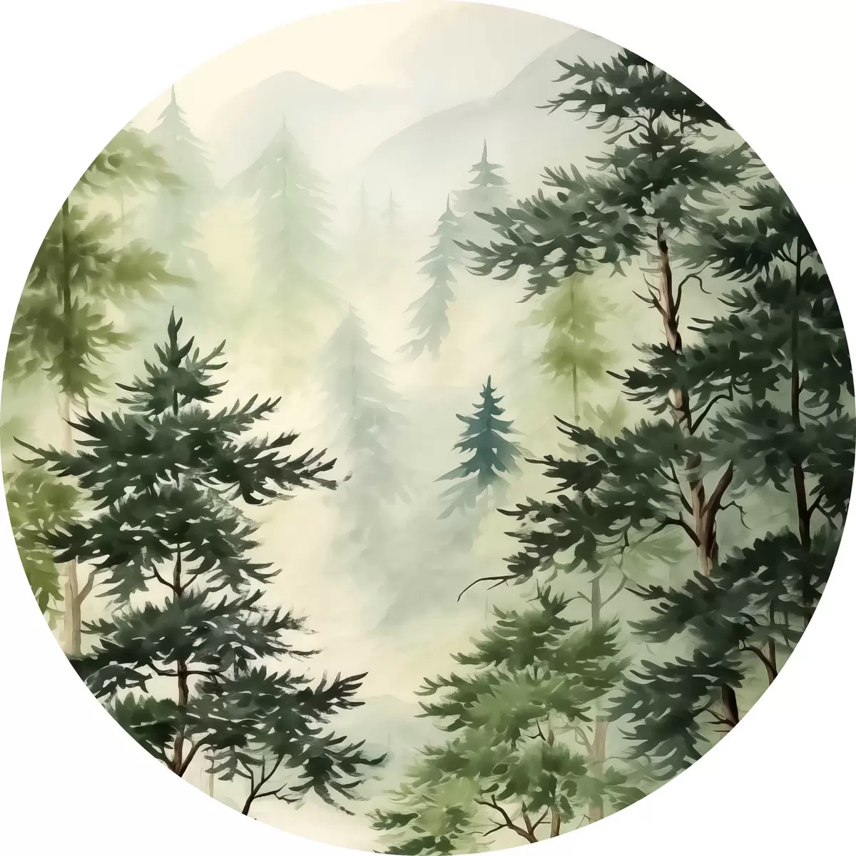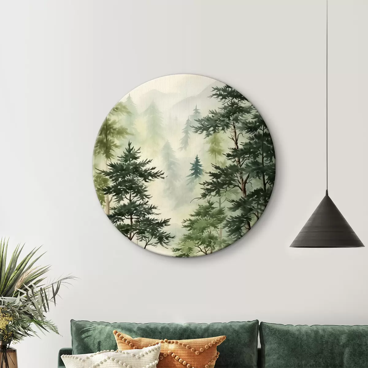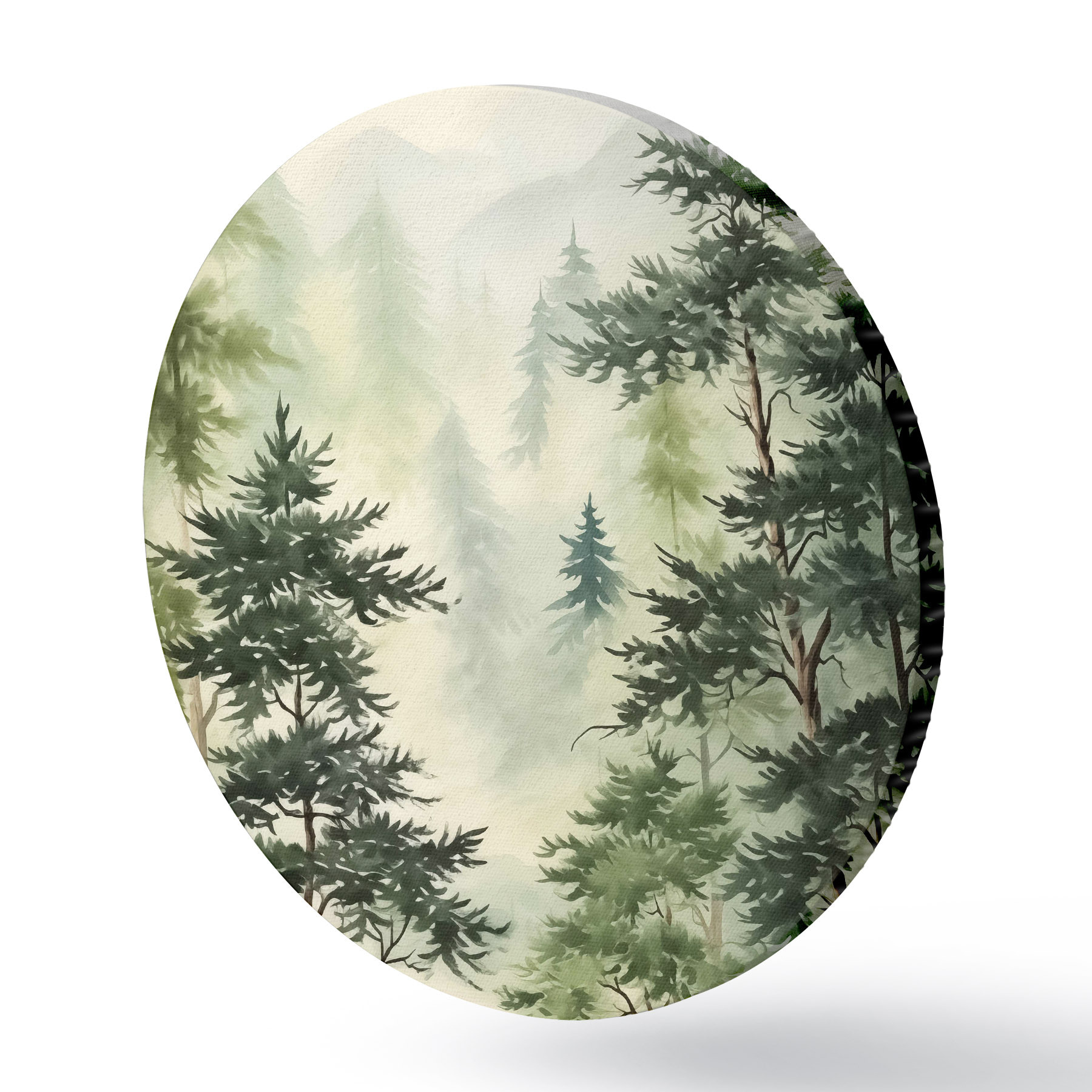 Runde Gemälde Tannenbäume im Wald vor dem Hintergrund der Berge, Aquarell, grün r40889