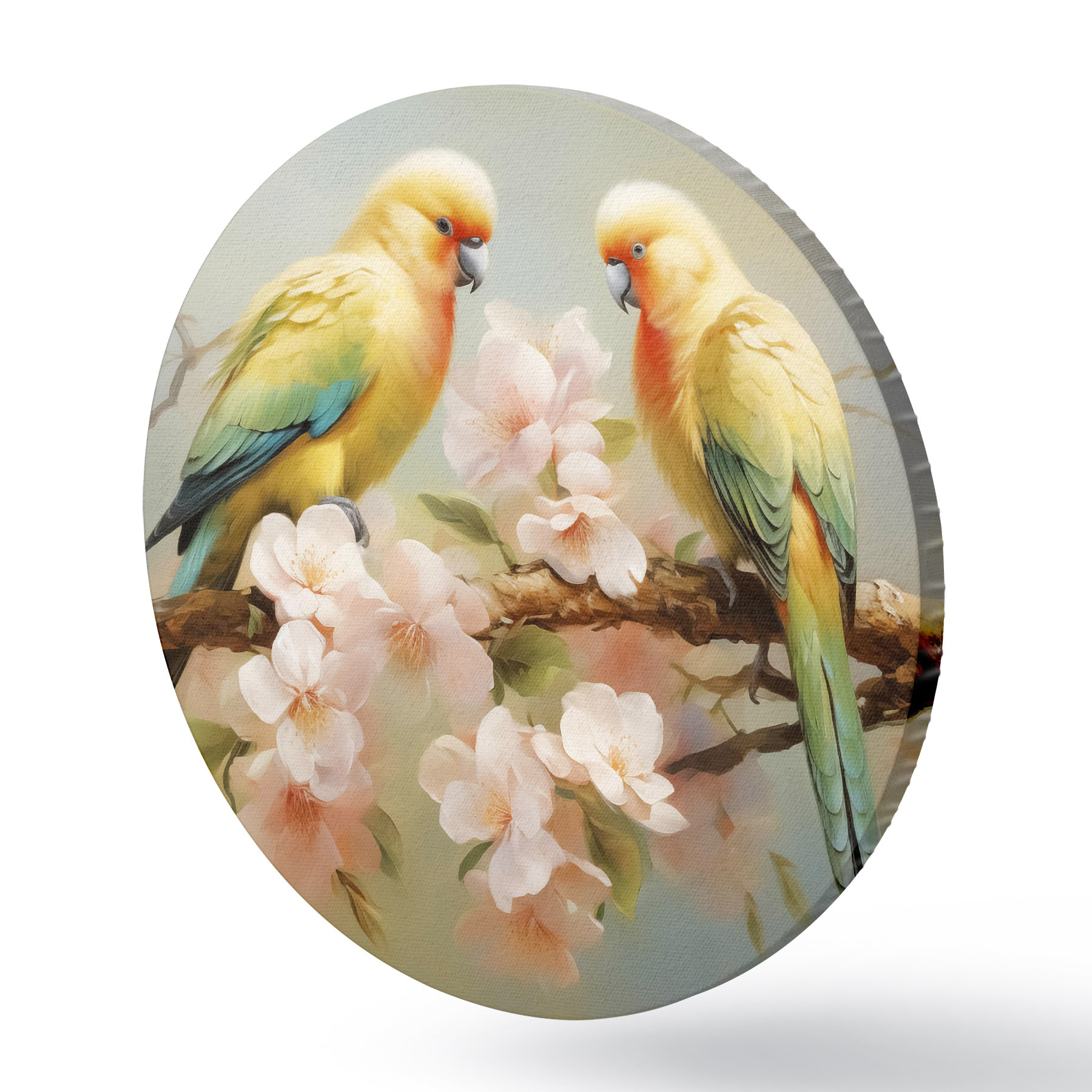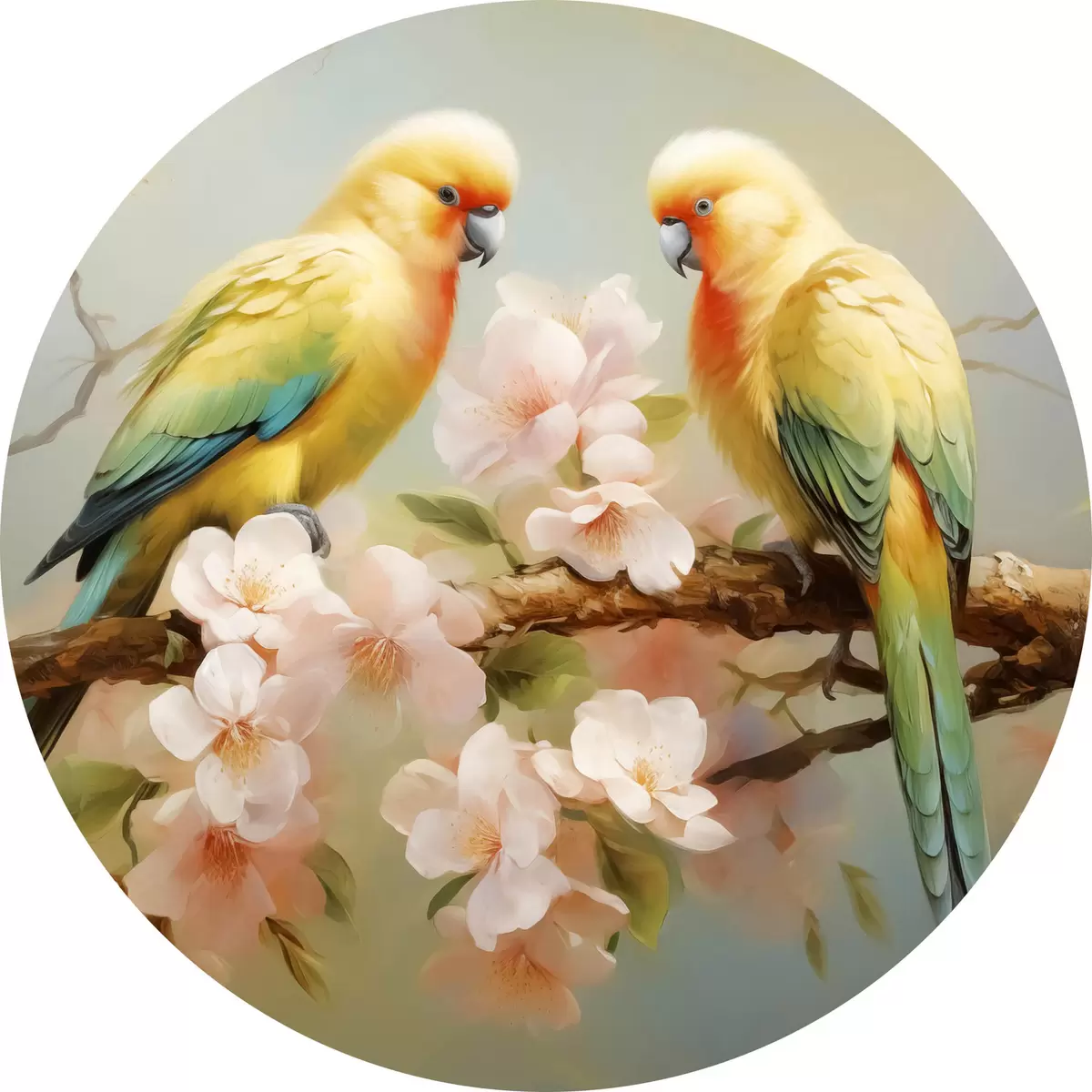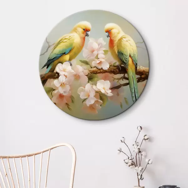 Runde Gemälde Papageien sitzen auf einem blühenden Zweig Aquarell r40892