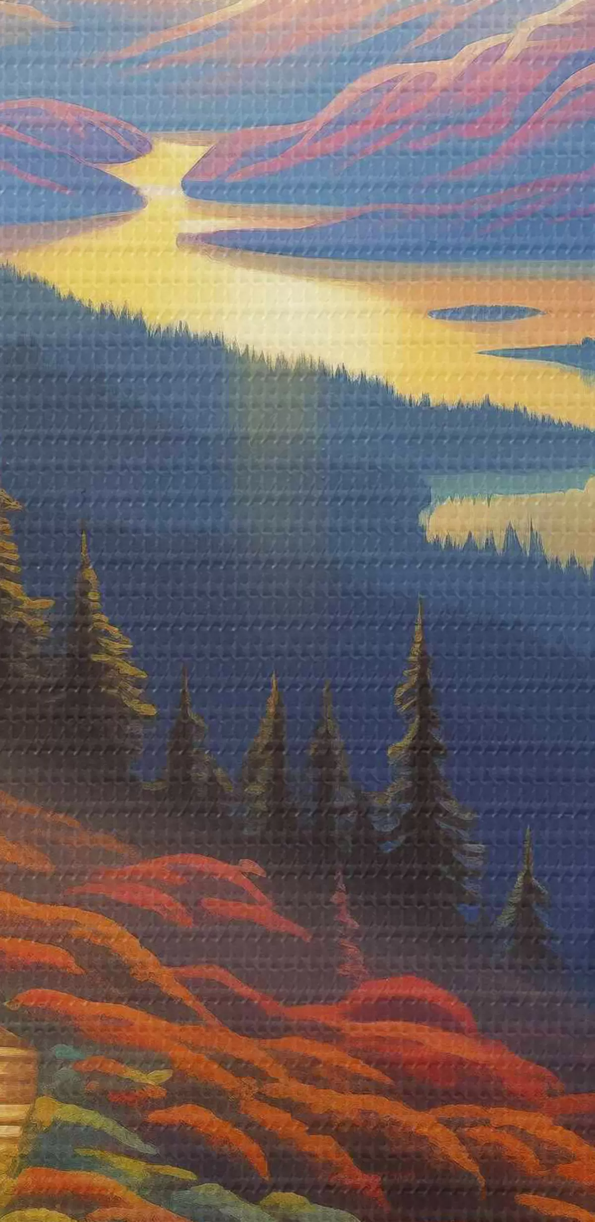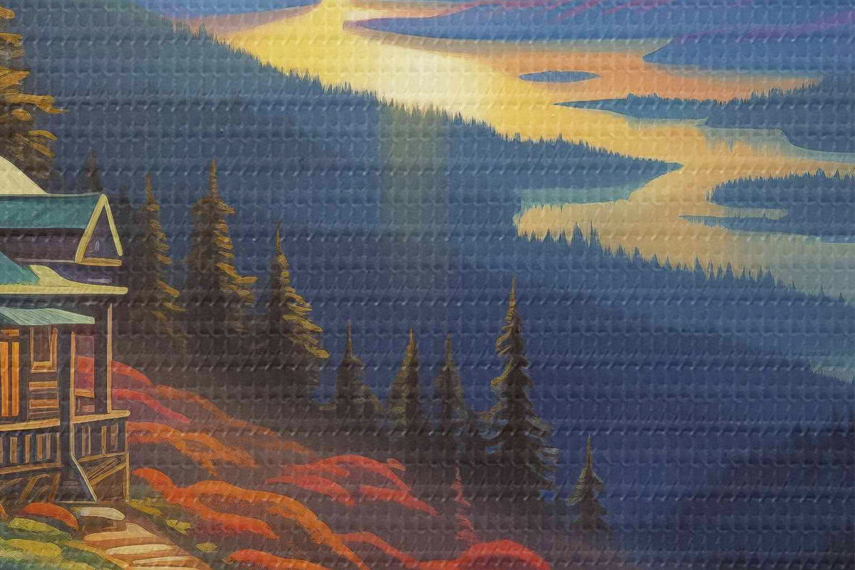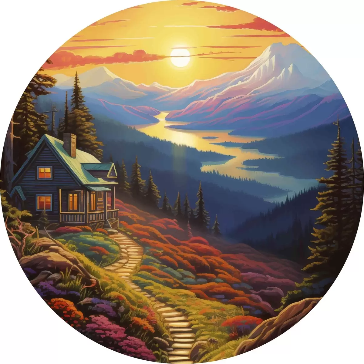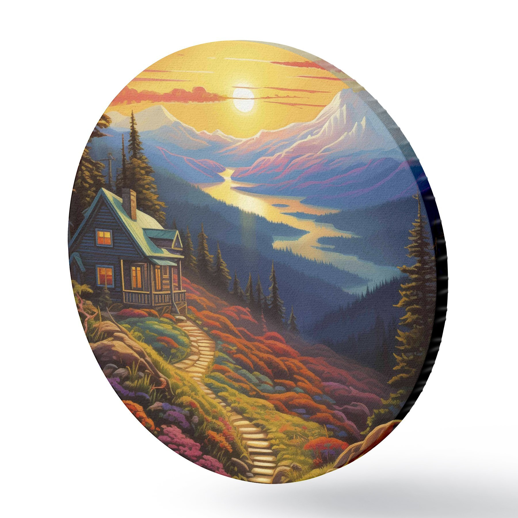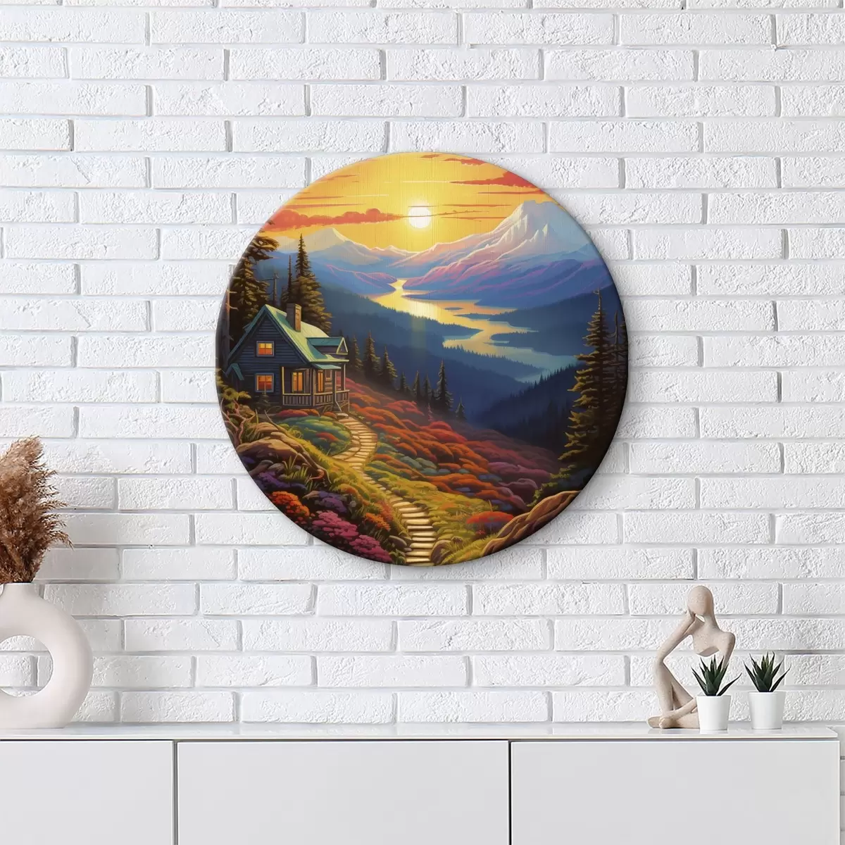 Runde Gemälde Bunte Landschaft mit Bergen und Holzhaus, Sonnenuntergang Farben r40941