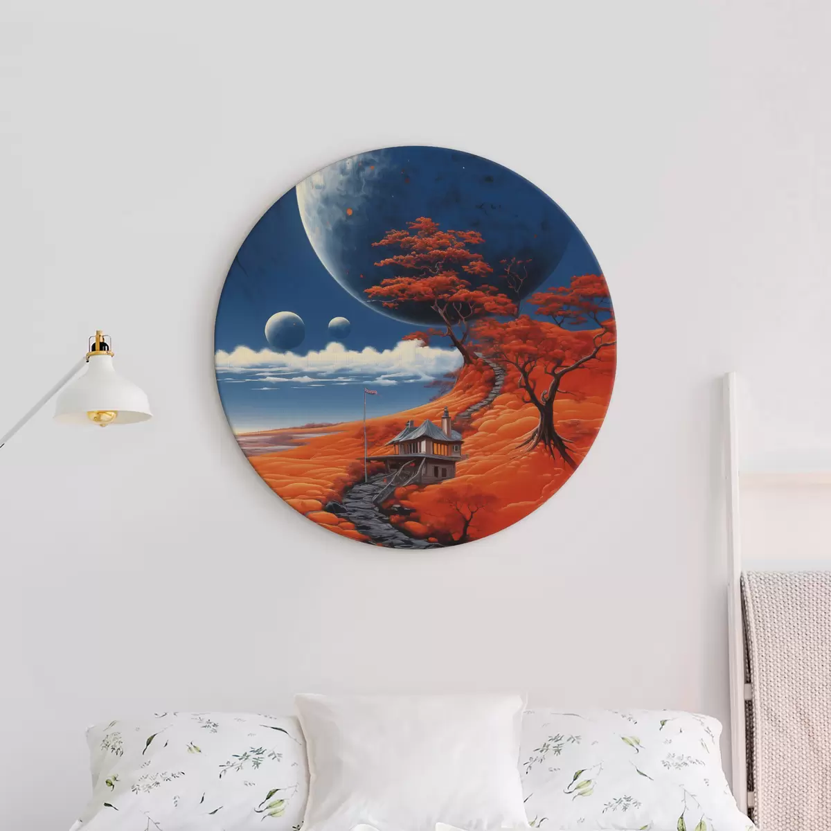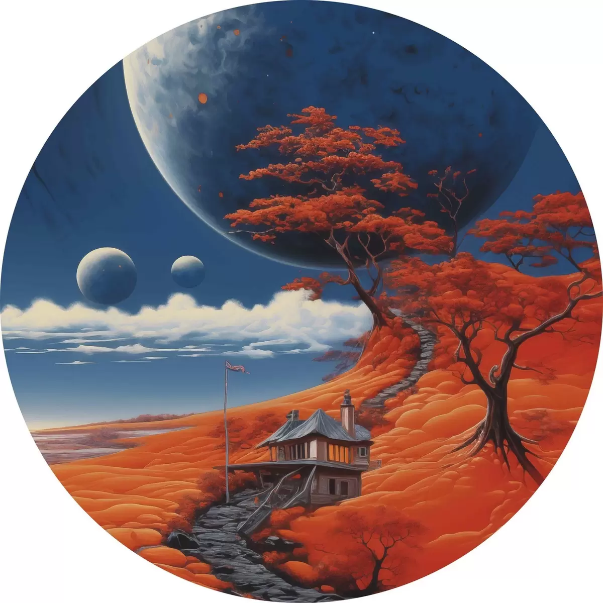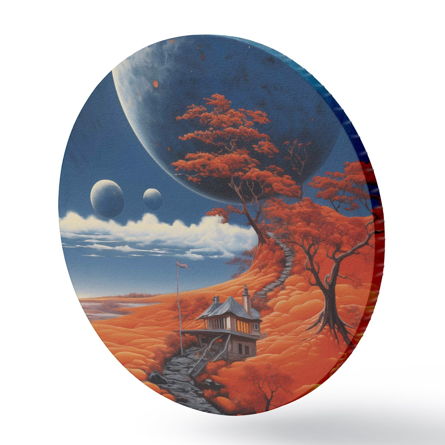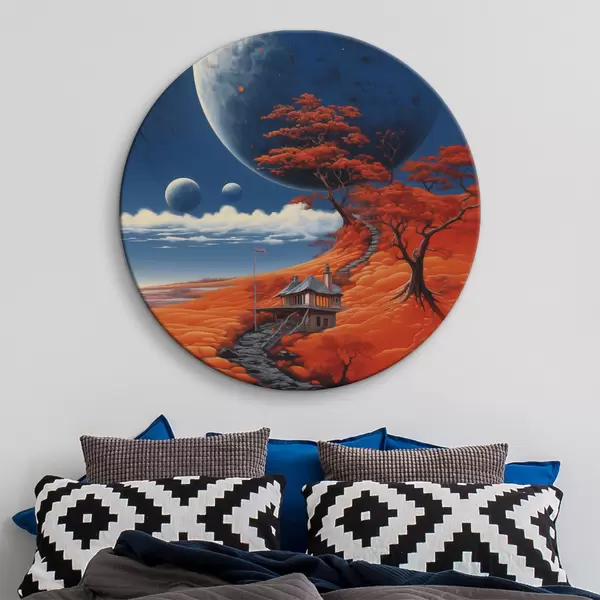 Runde Gemälde Space Illustration, Planeten, blauer Himmel, Haus auf dem Hügel, Bäume r40946