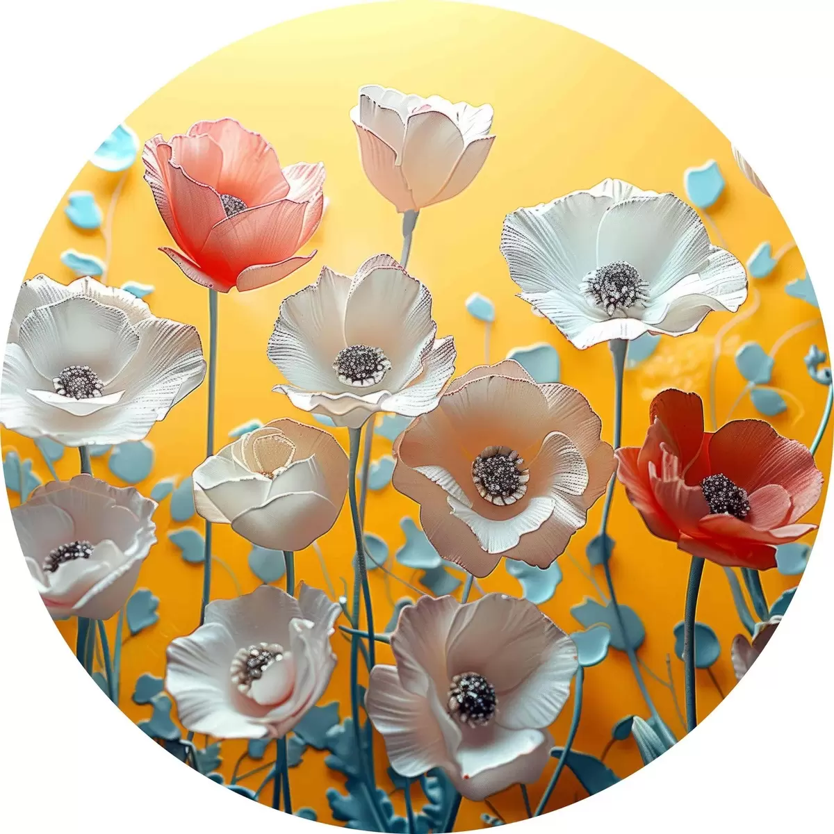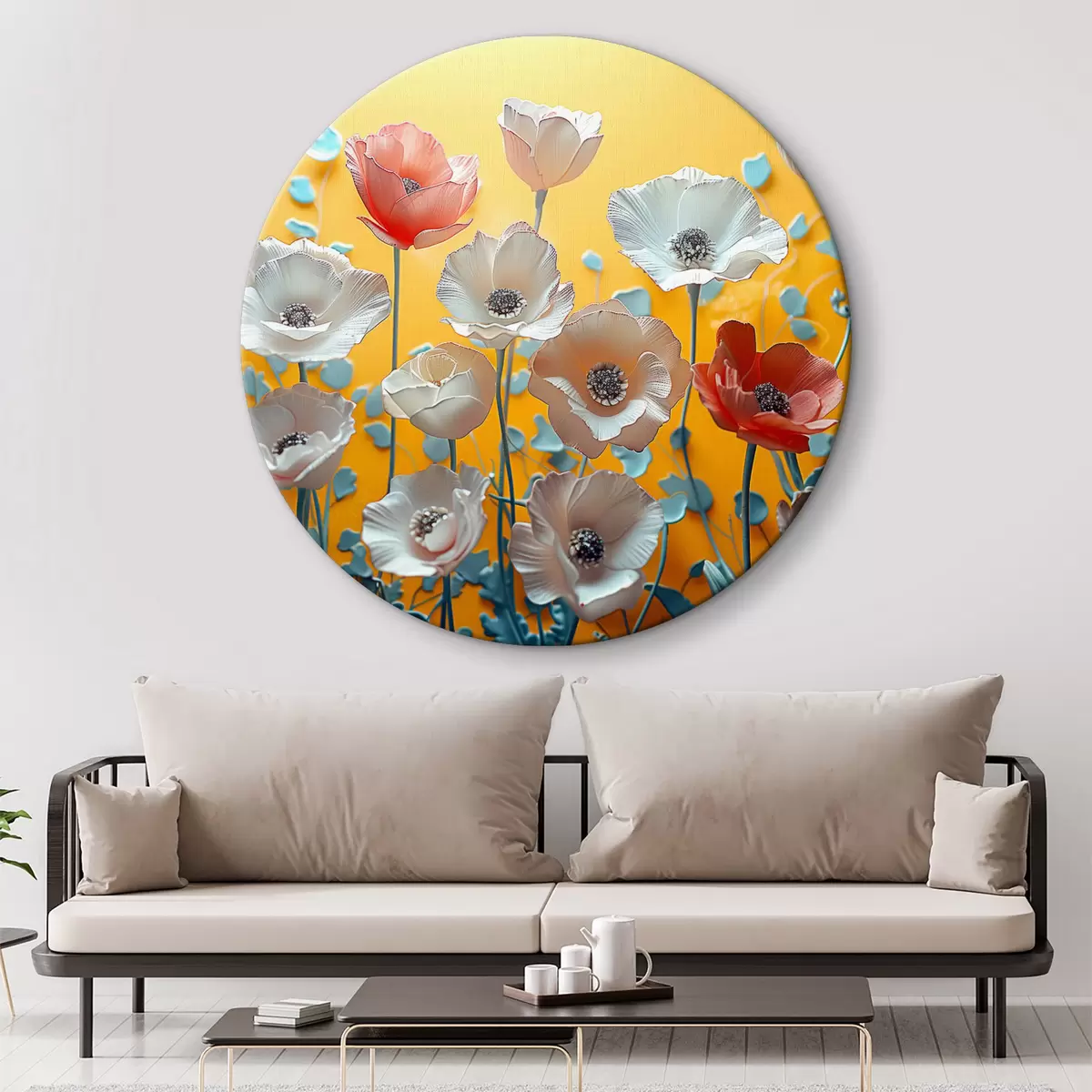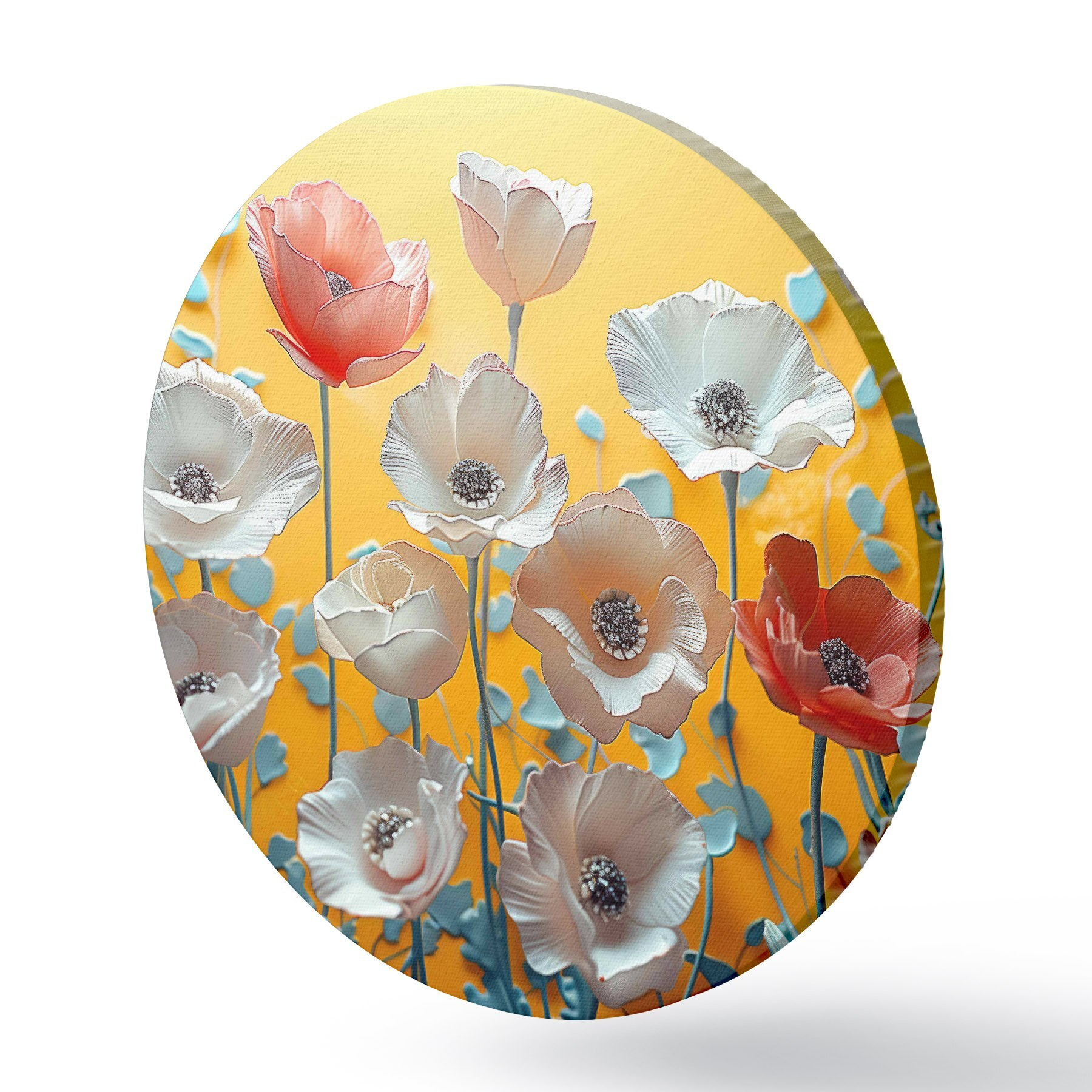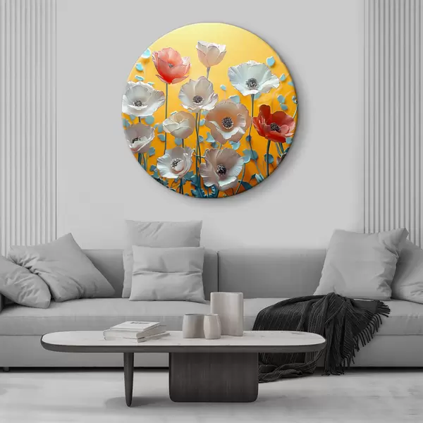 Runde Gemälde Weiße und rote Pfingstrosen auf gelbem Hintergrund r40975