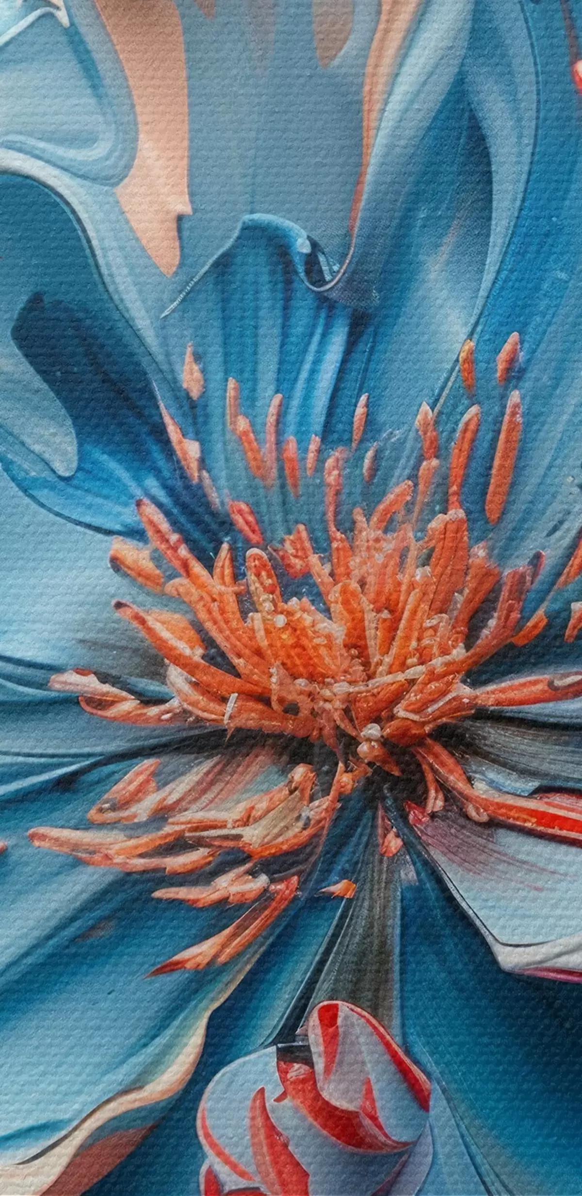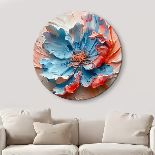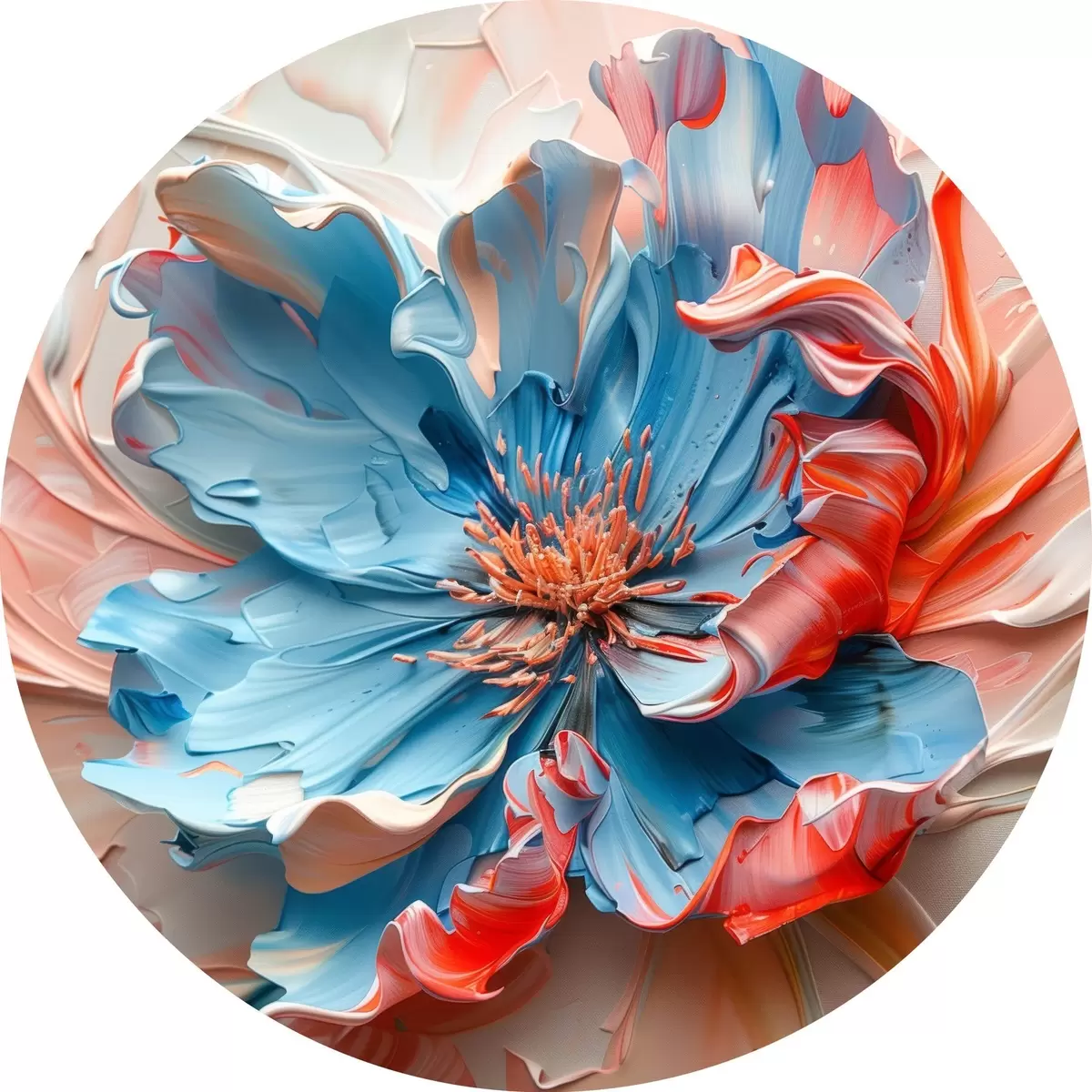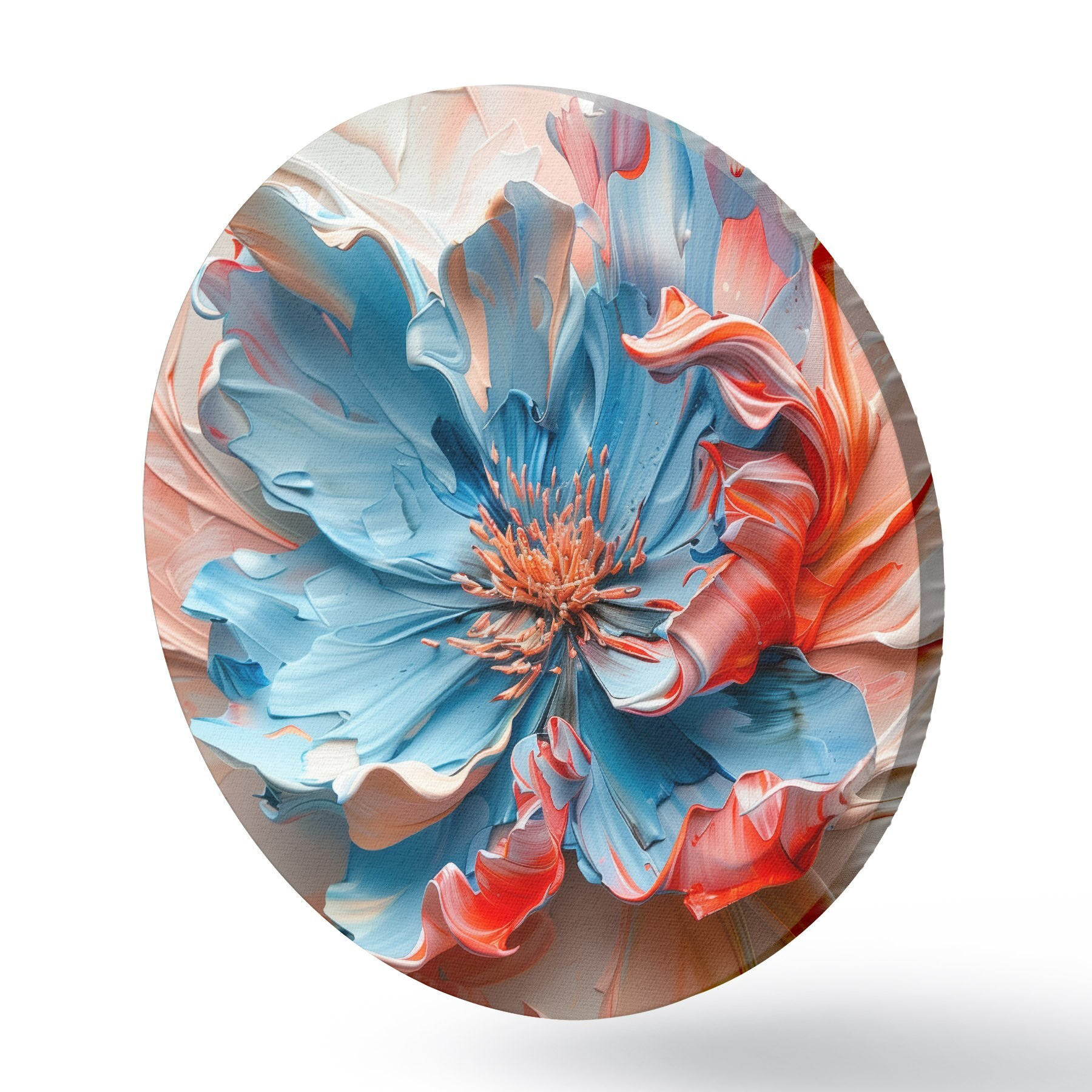 Runde Gemälde Zaubermohn mit voluminösen Blütenblättern in Pfirsich- und Blautönen r40992