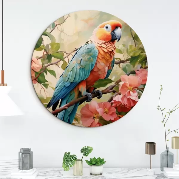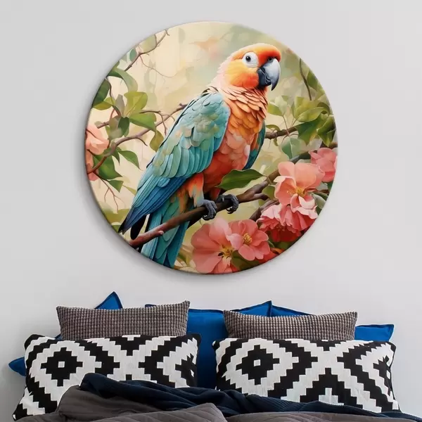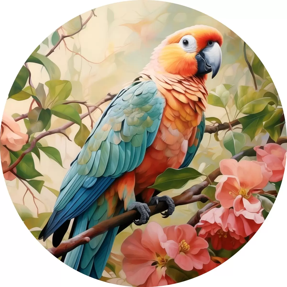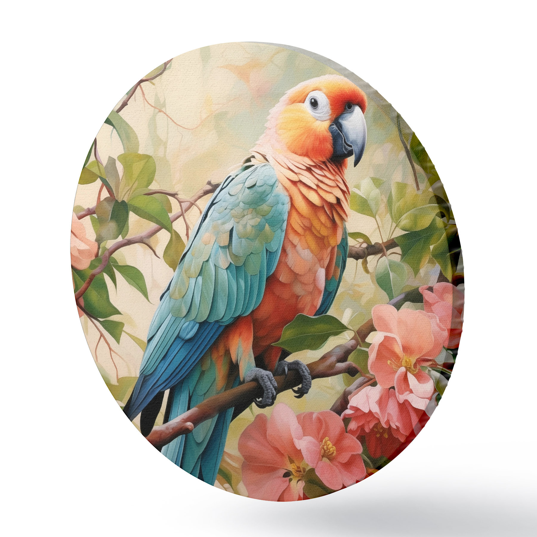 Runde Gemälde Hänflingspapagei auf einem Zweig mit rosa Blüten sitzend r41018