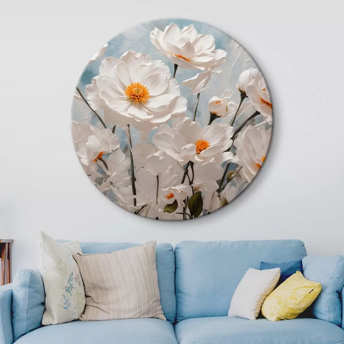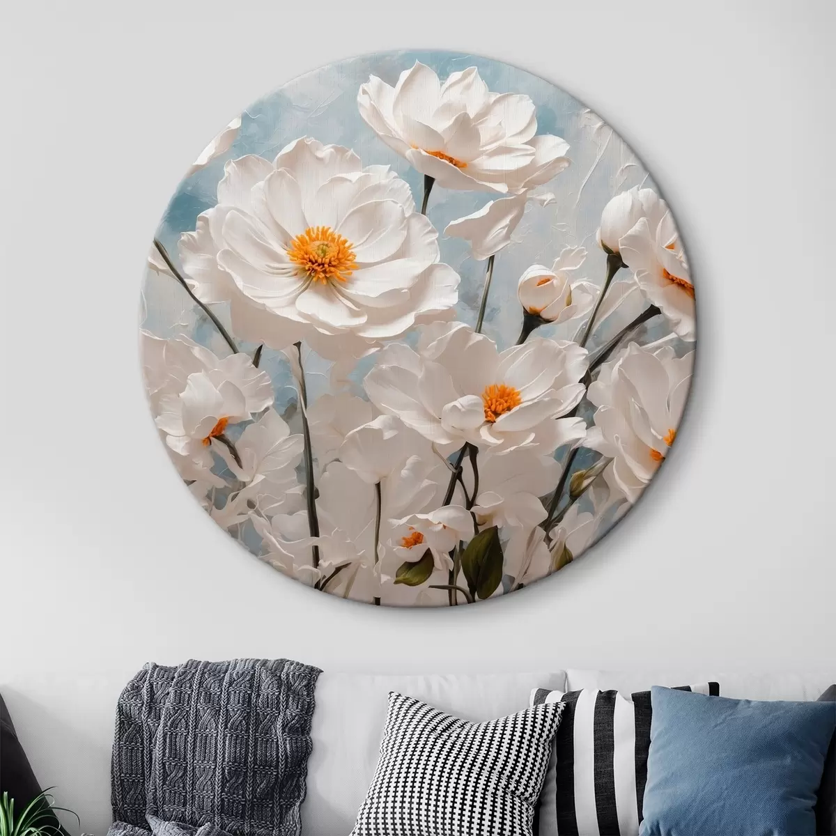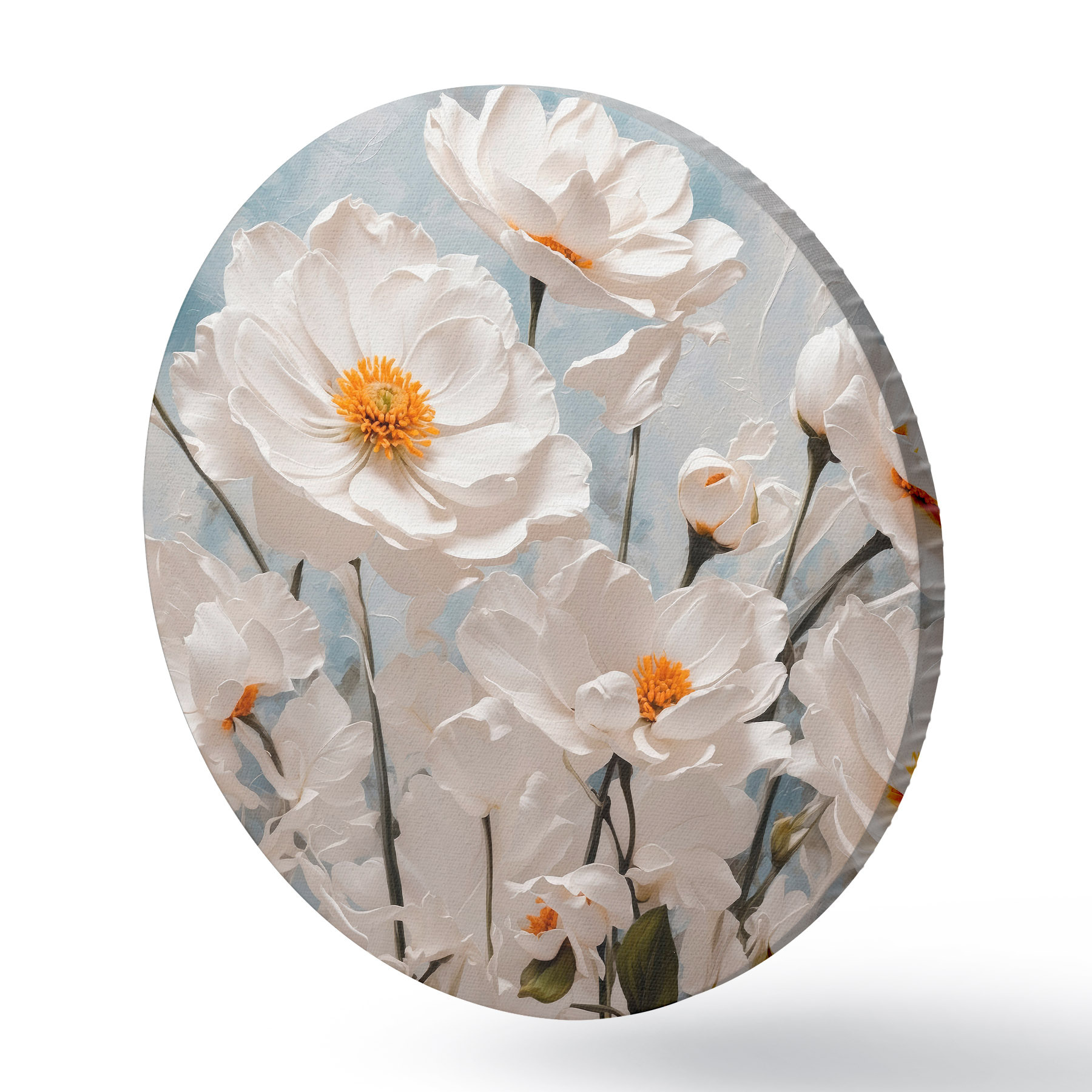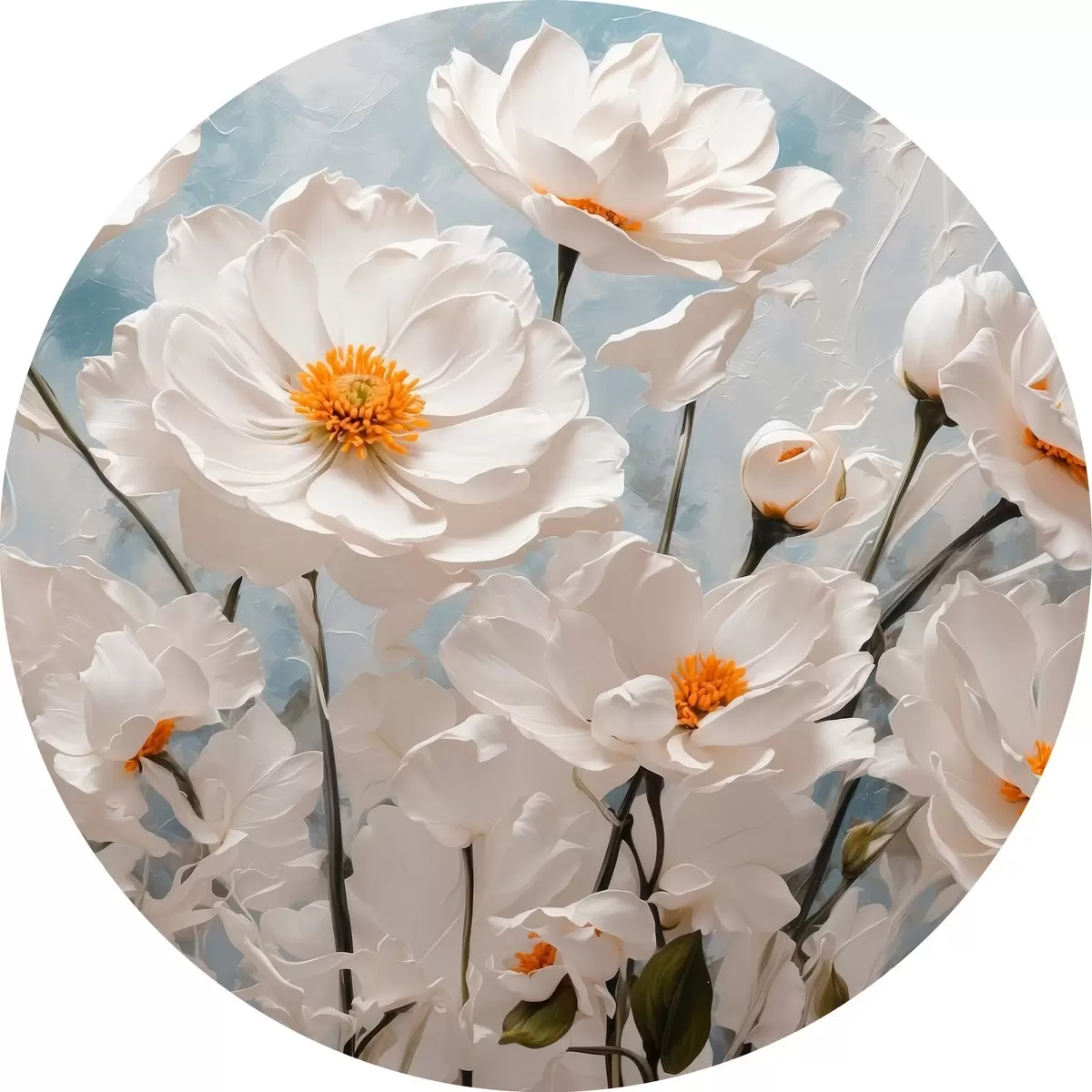 Runde Gemälde Weiße Blumen auf einem blauen und weißen Öl-Hintergrund r41041