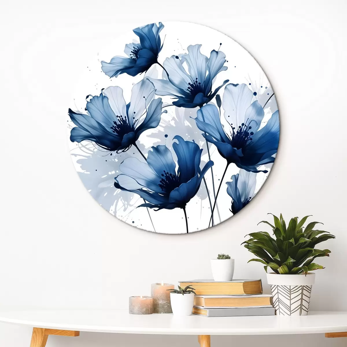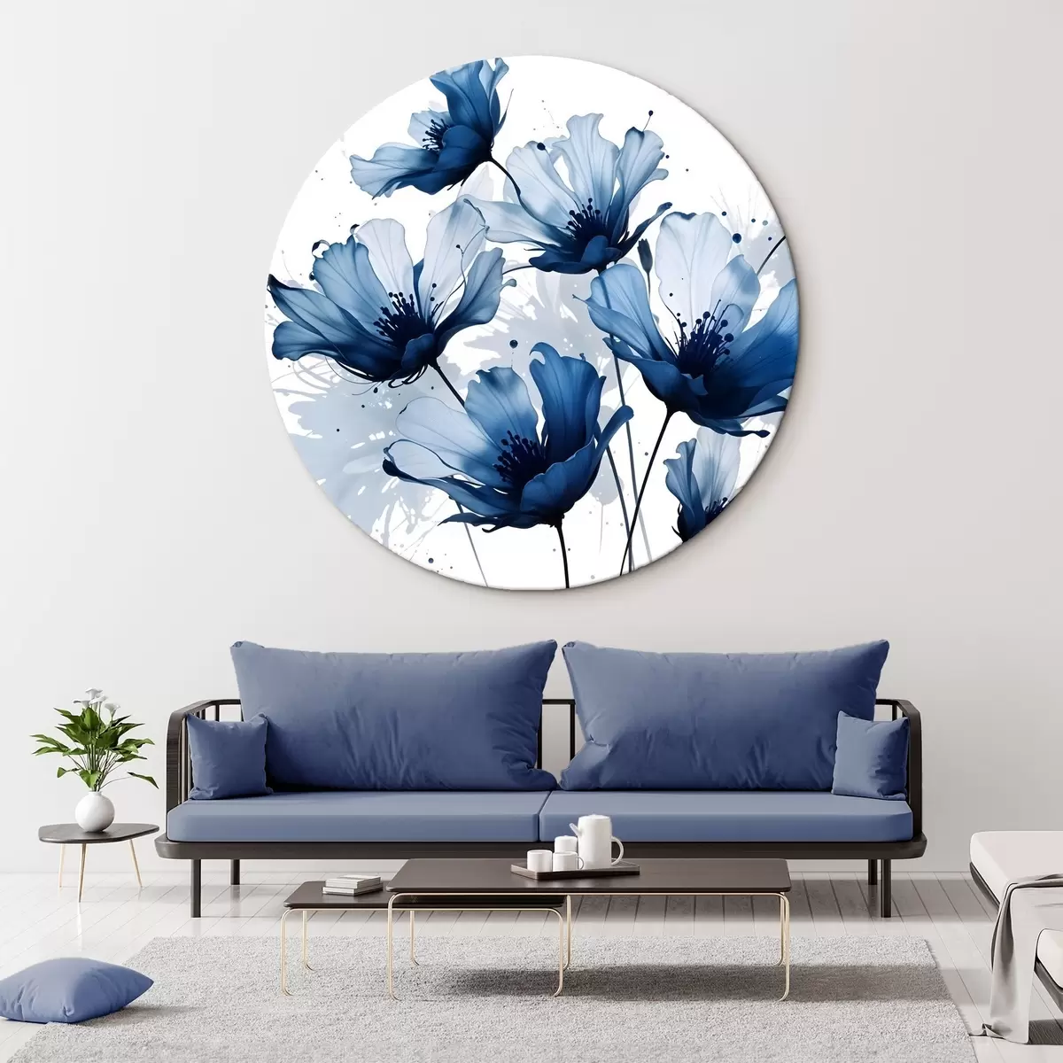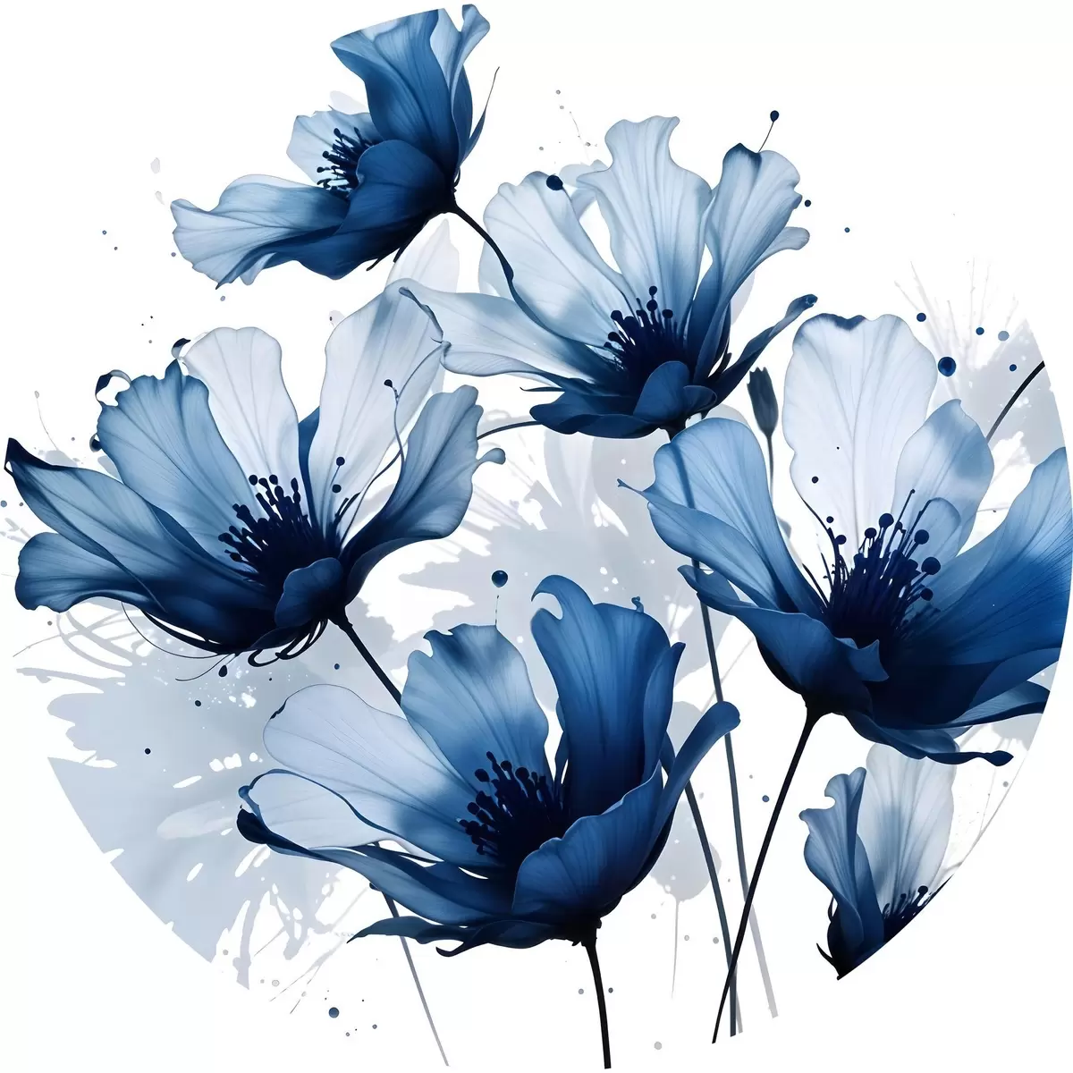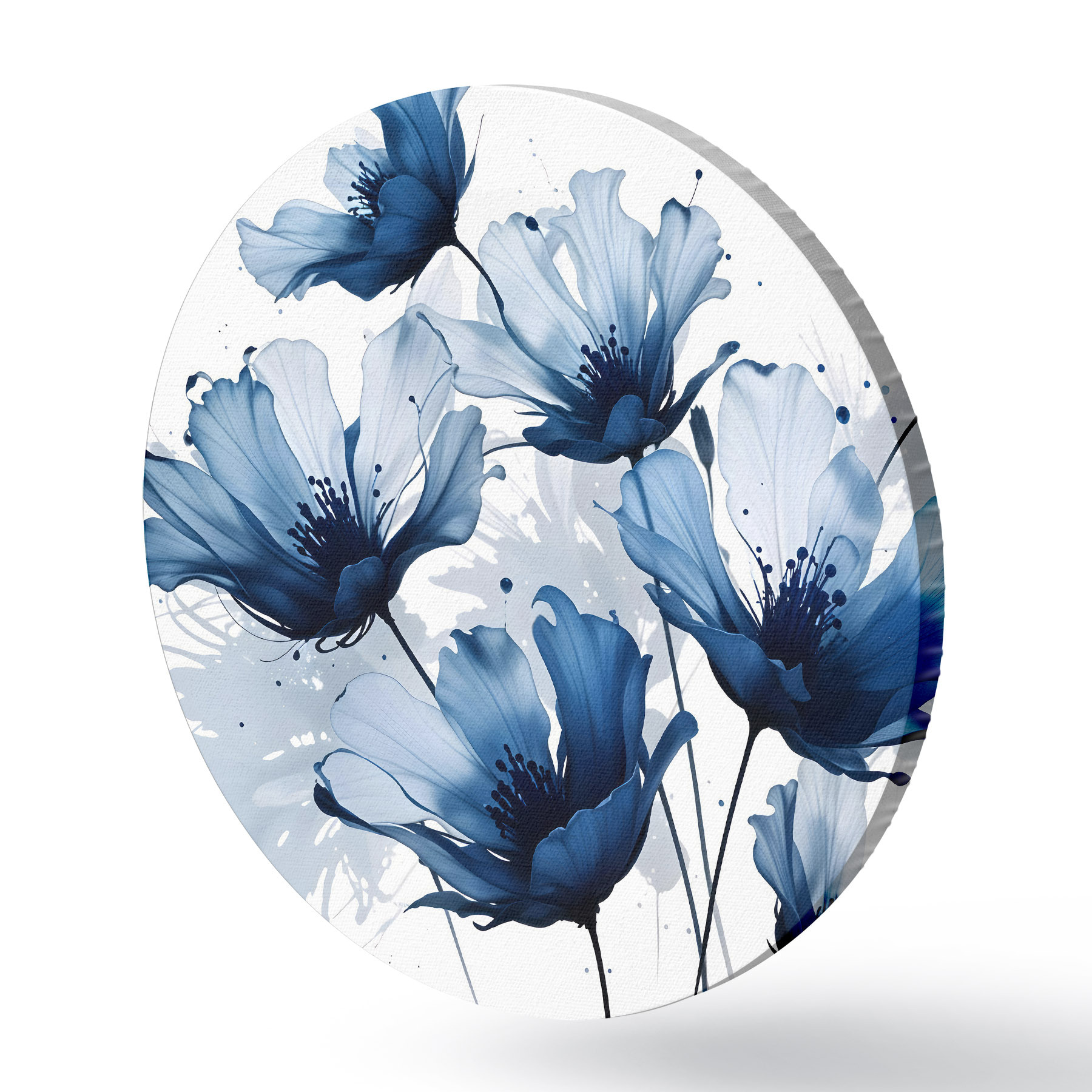 Runde Gemälde Abstrakte große blaue und weiße Blumen mit weichen verschwommenen Blütenblätter auf einem weißen Hintergrund r41082