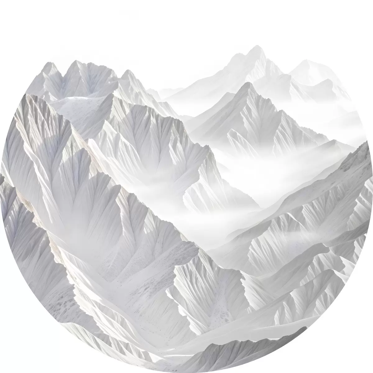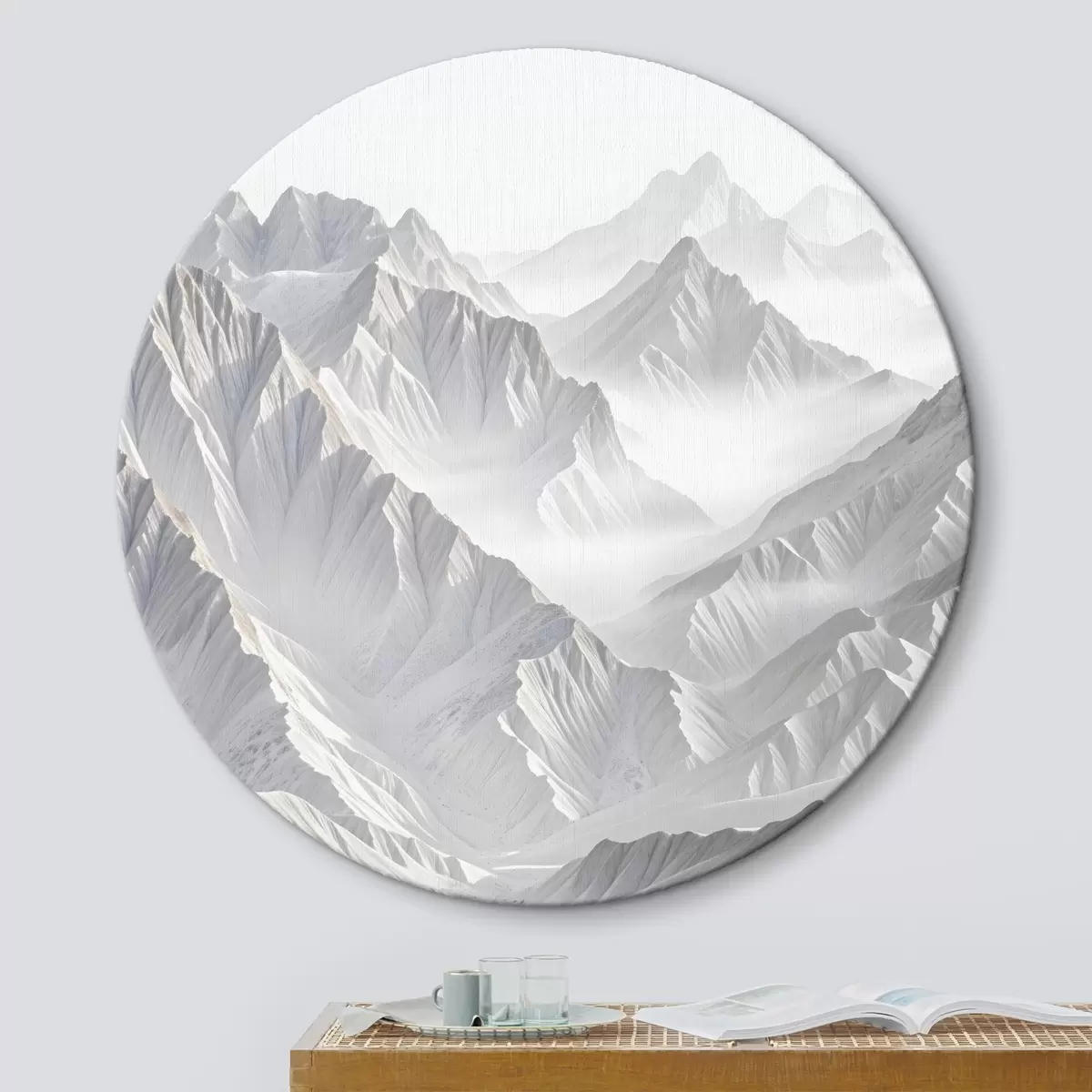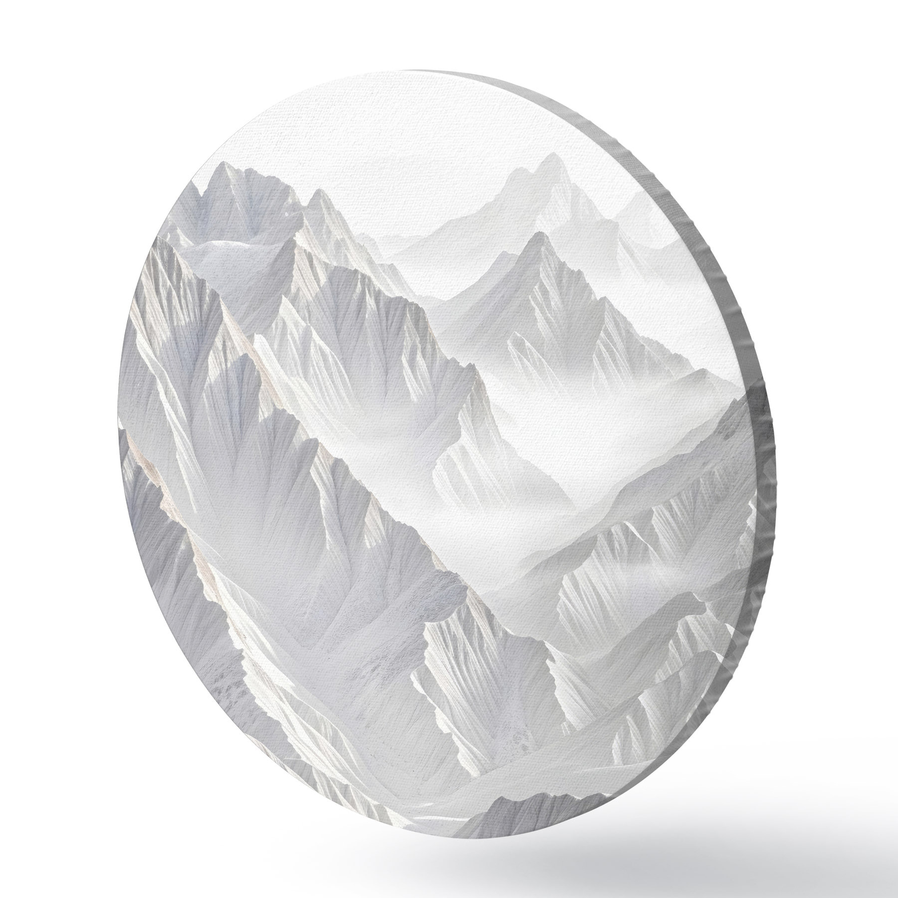 Runde Gemälde Verschneite minimalistische Berggipfel in einer nebligen, nebligen Landschaft r41083