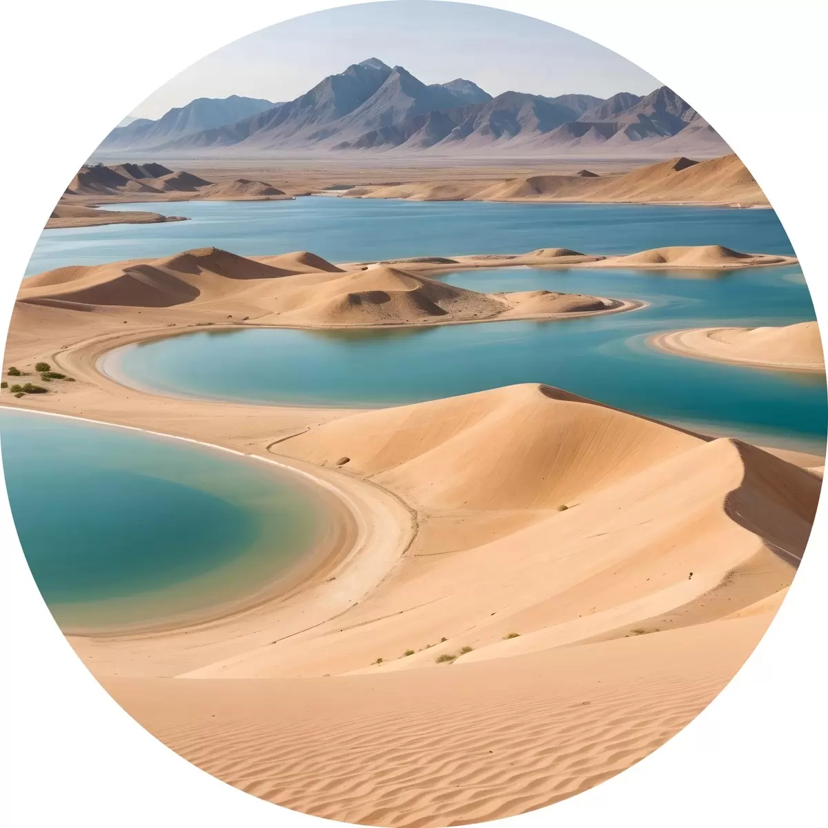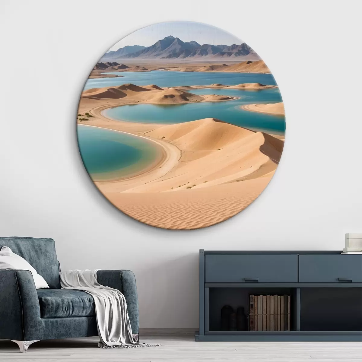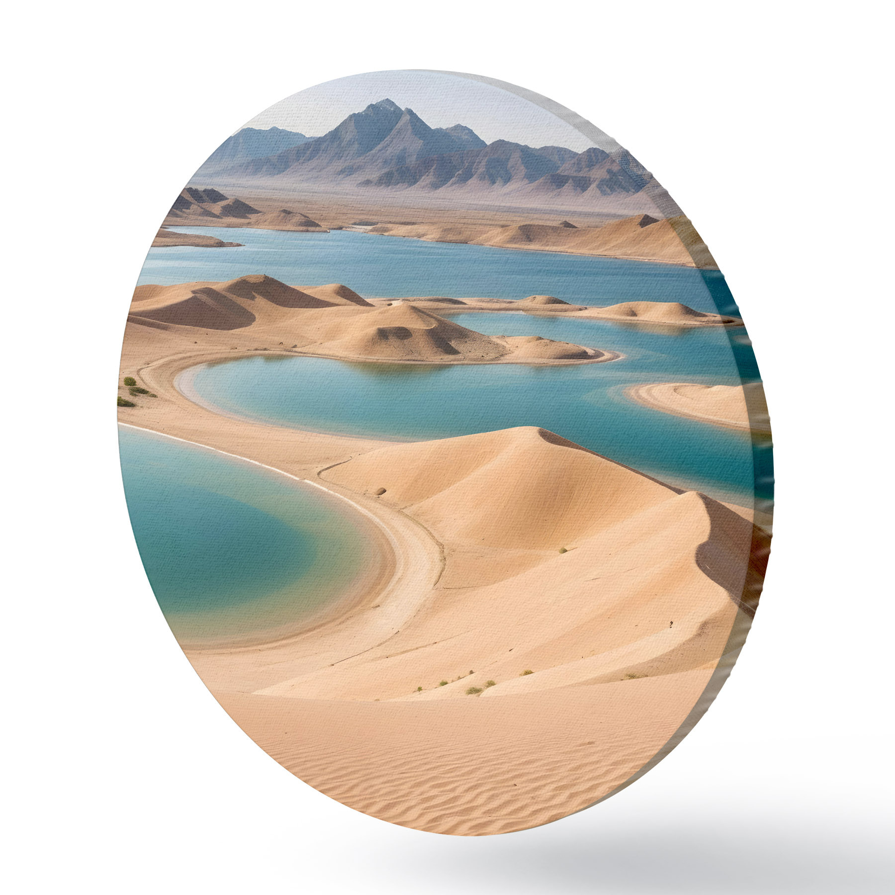 Runde Gemälde Eine weite Wüstenlandschaft mit sanften Dünen und türkisfarbenen Seen, umgeben von schroffen Bergen r41087