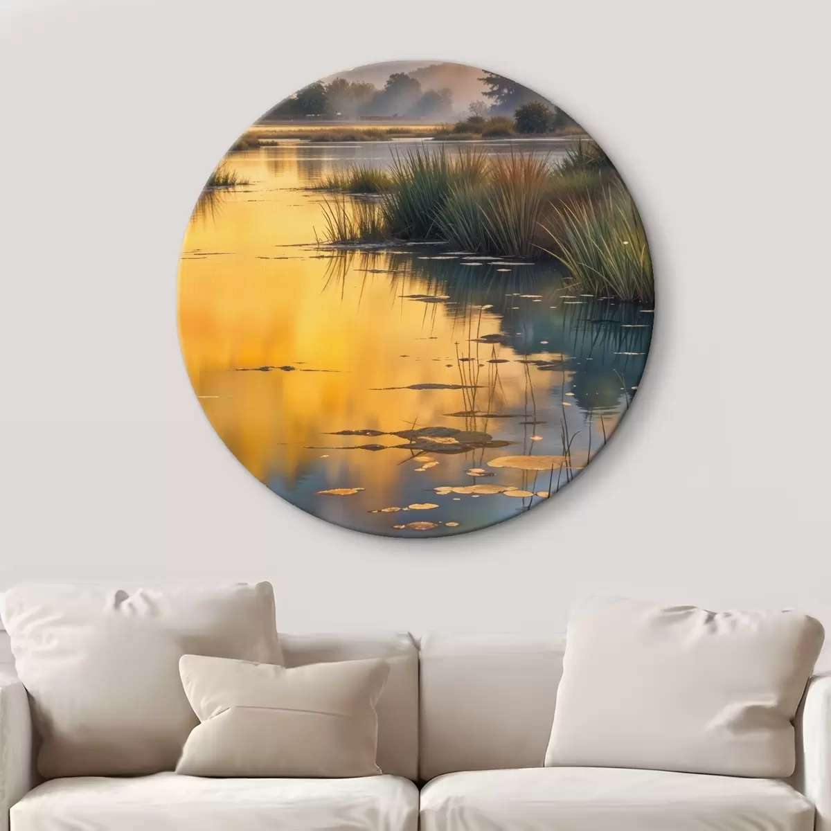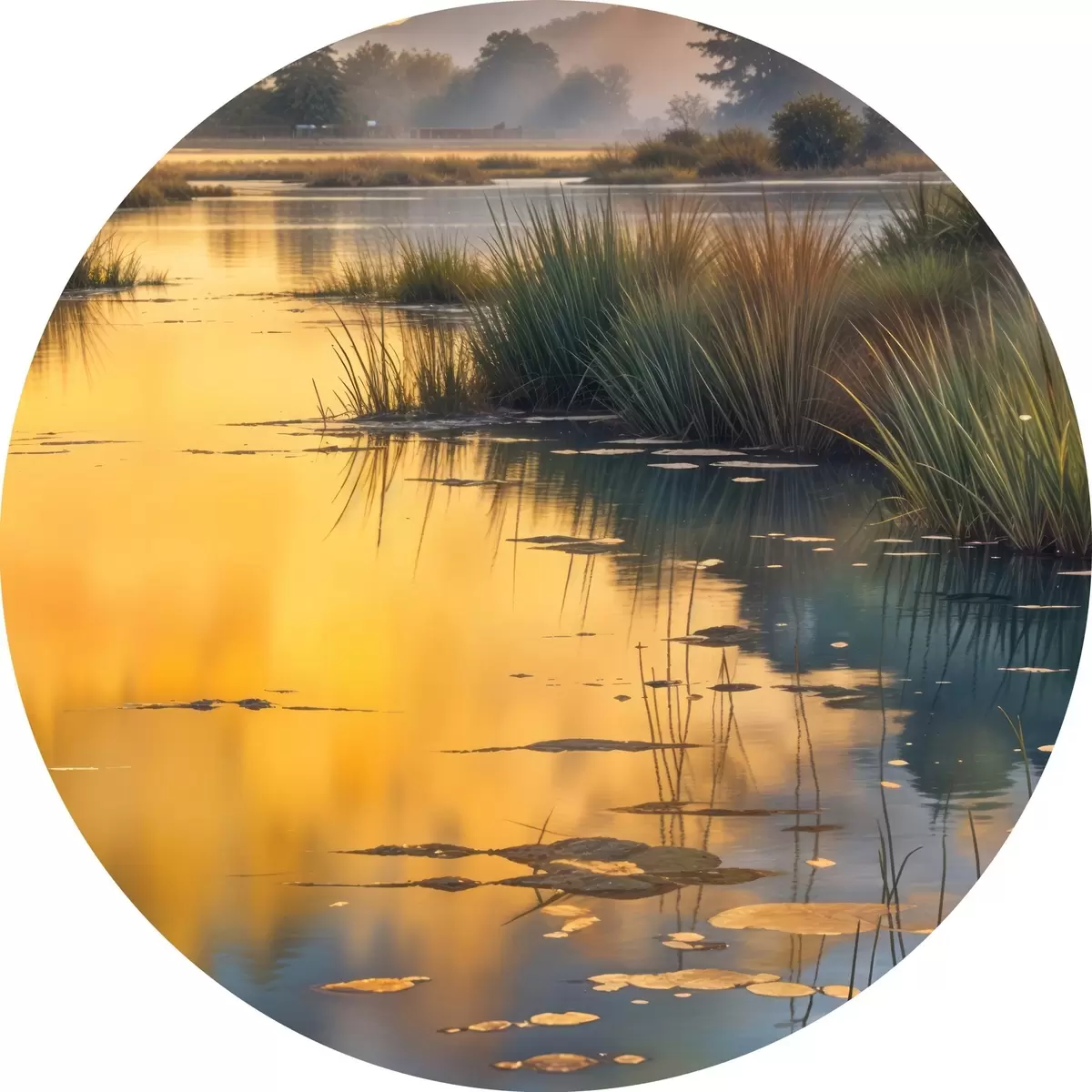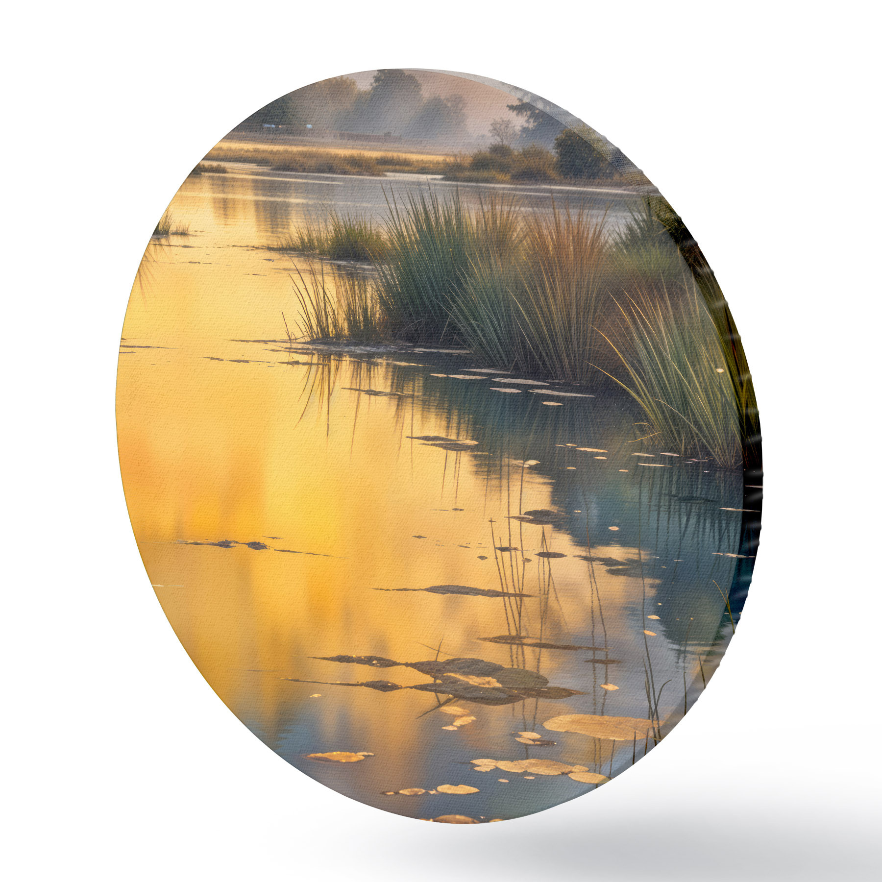 Runde Gemälde Ruhiger See, umgeben von Kiefern bei Sonnenuntergang, mit nebligem, ruhigem Wasser r41088