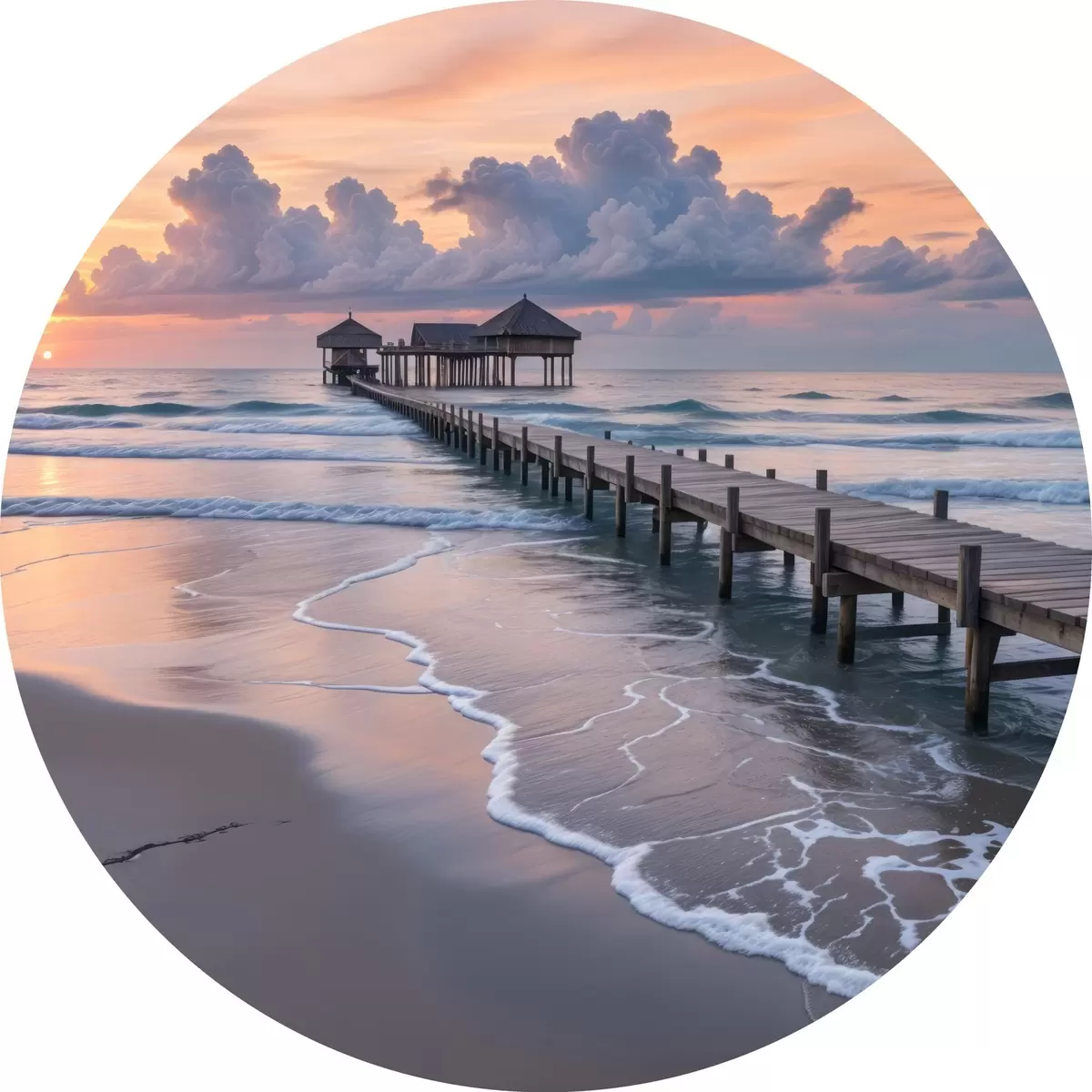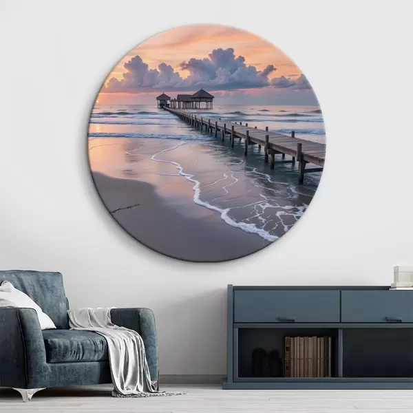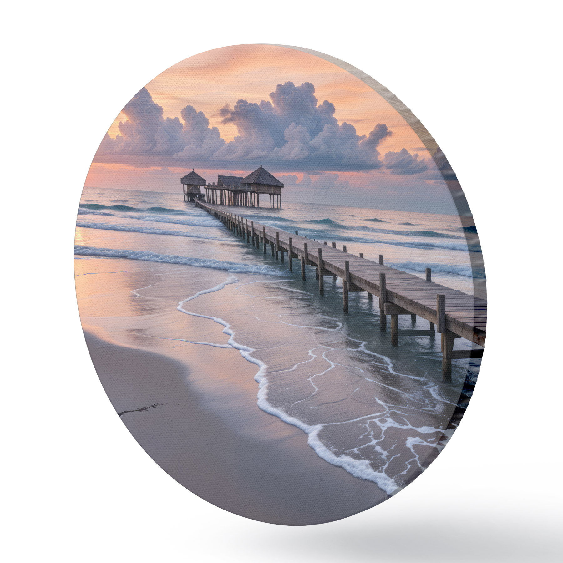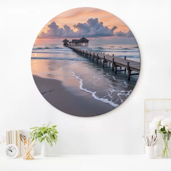 Runde Gemälde Holzsteg mit Blick auf den ruhigen Ozean bei Sonnenuntergang mit bunten Wolken r41091
