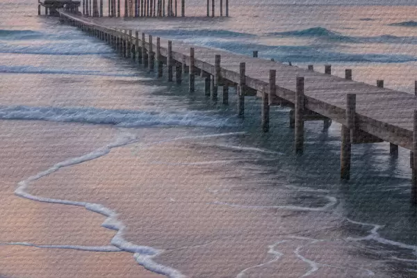 Bild Holzsteg mit Blick auf den ruhigen Ozean bei Sonnenuntergang mit bunten Wolken Nr r41091