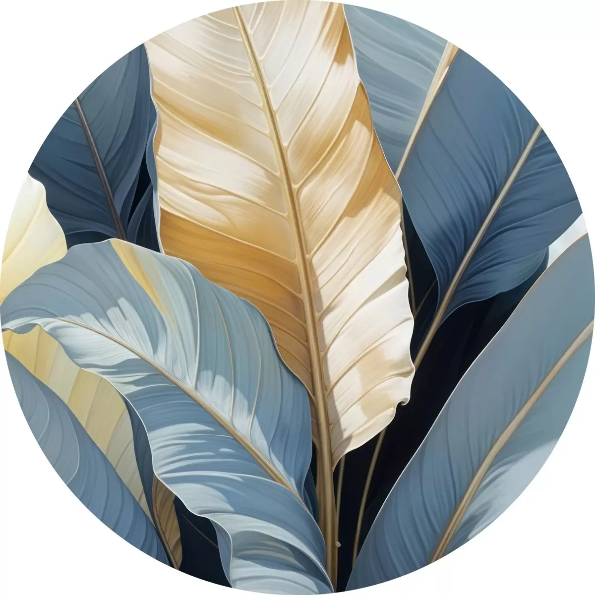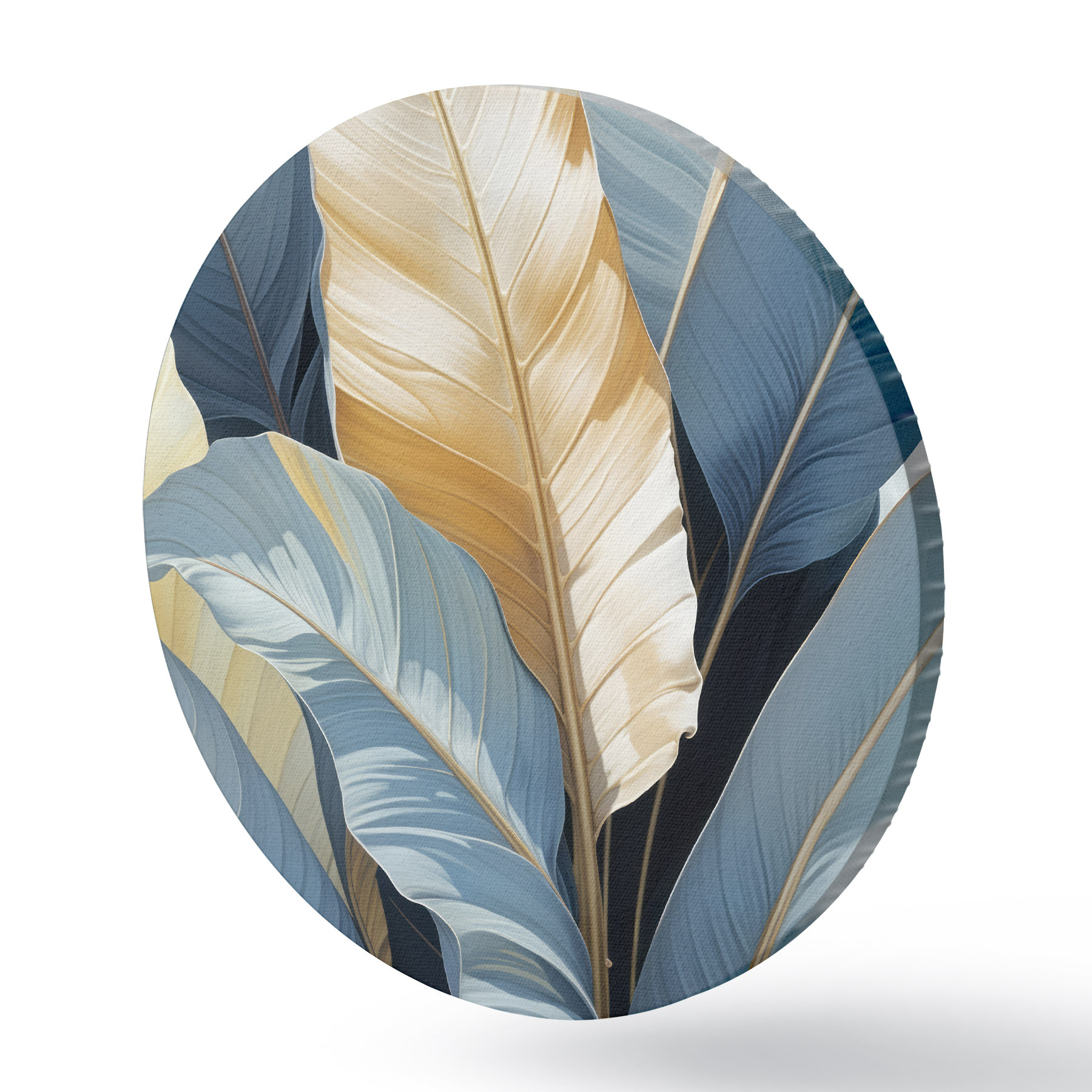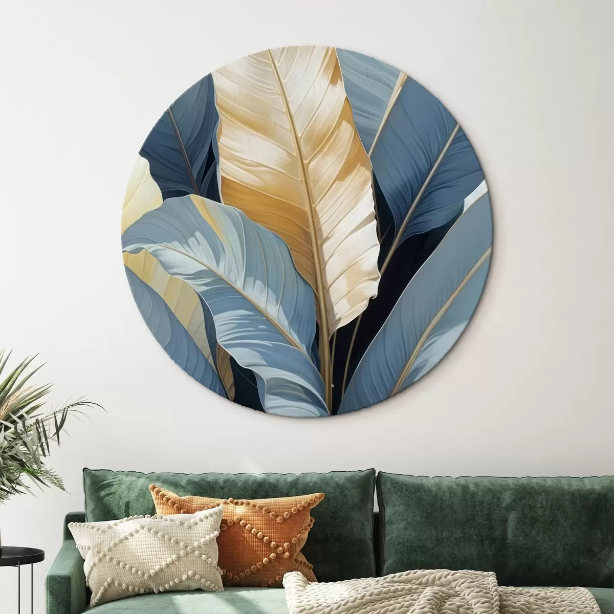 Runde Gemälde Tropische Blätter mit blauen und gelben Schattierungen, große Palmen- oder Bananenblätter mit üppigem natürlichen Hintergrund r41097