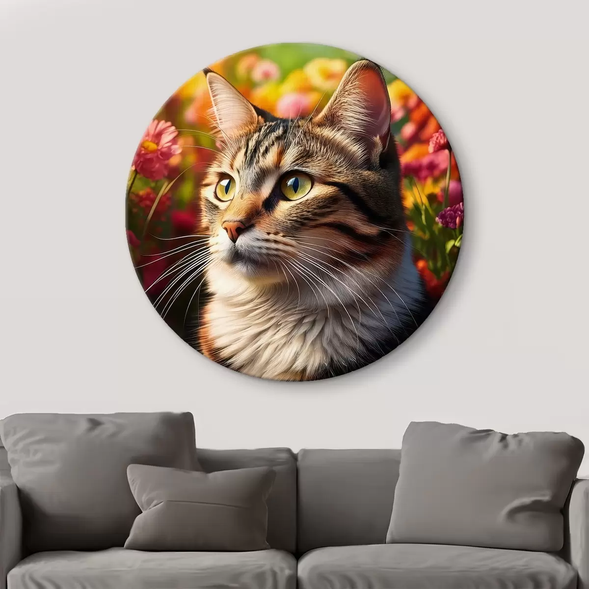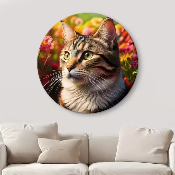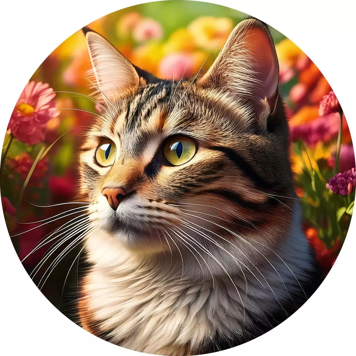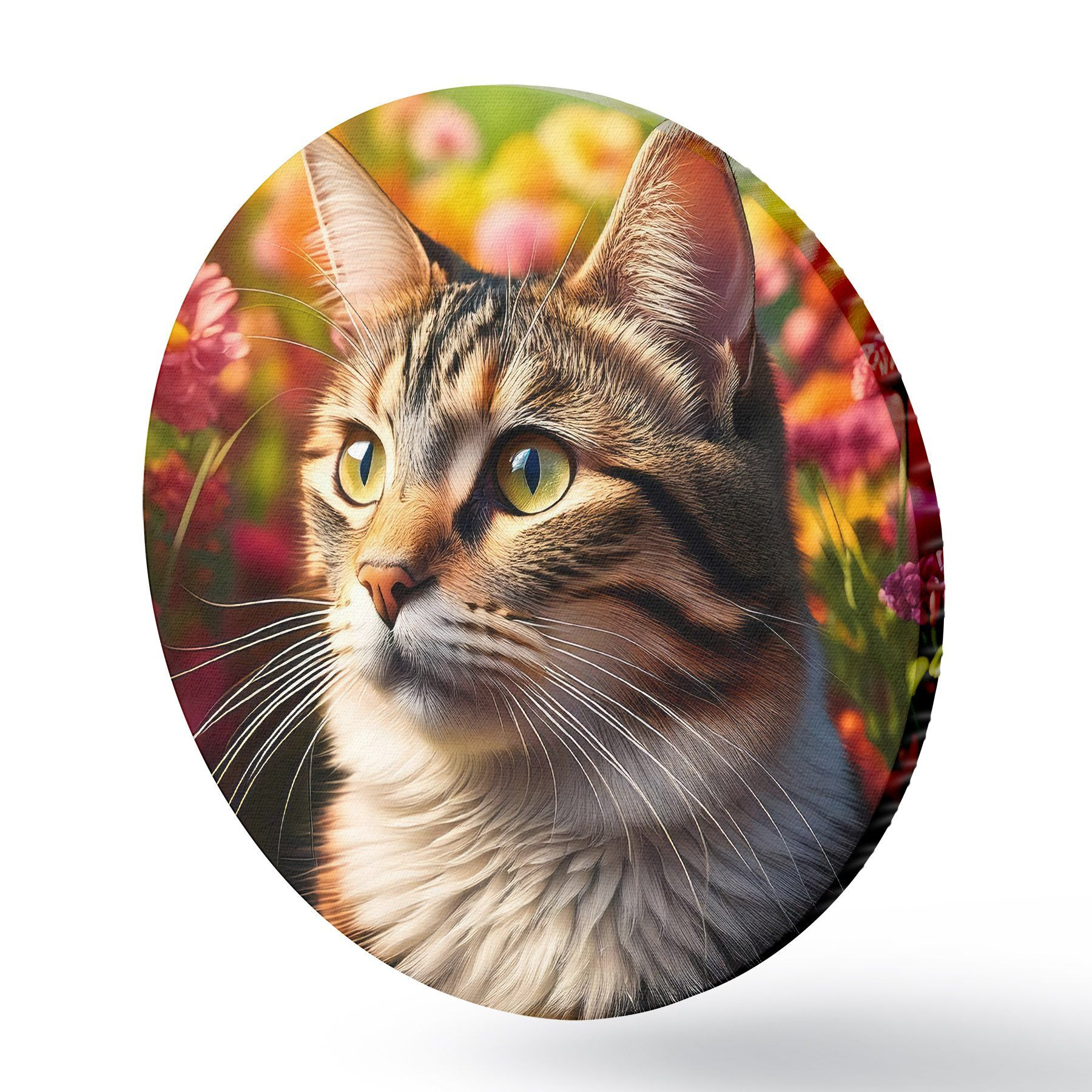 Runde Gemälde große Katze, Katzenporträt, Katze und Blumen r41106