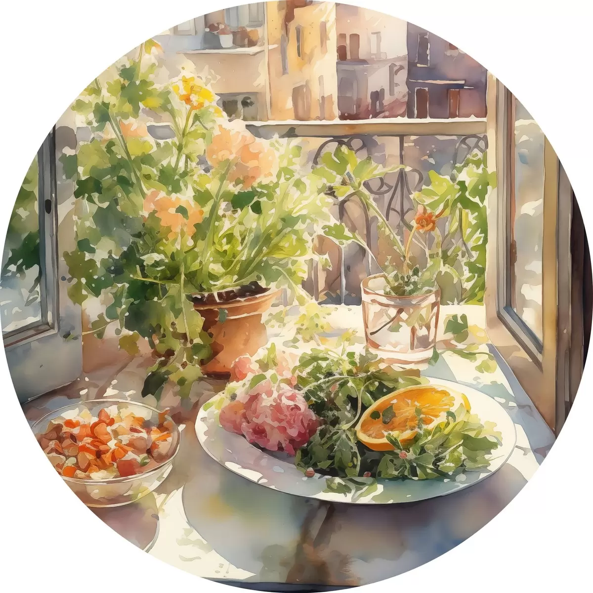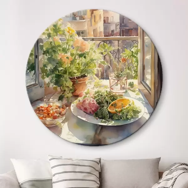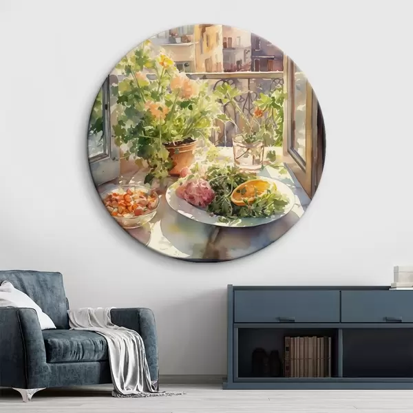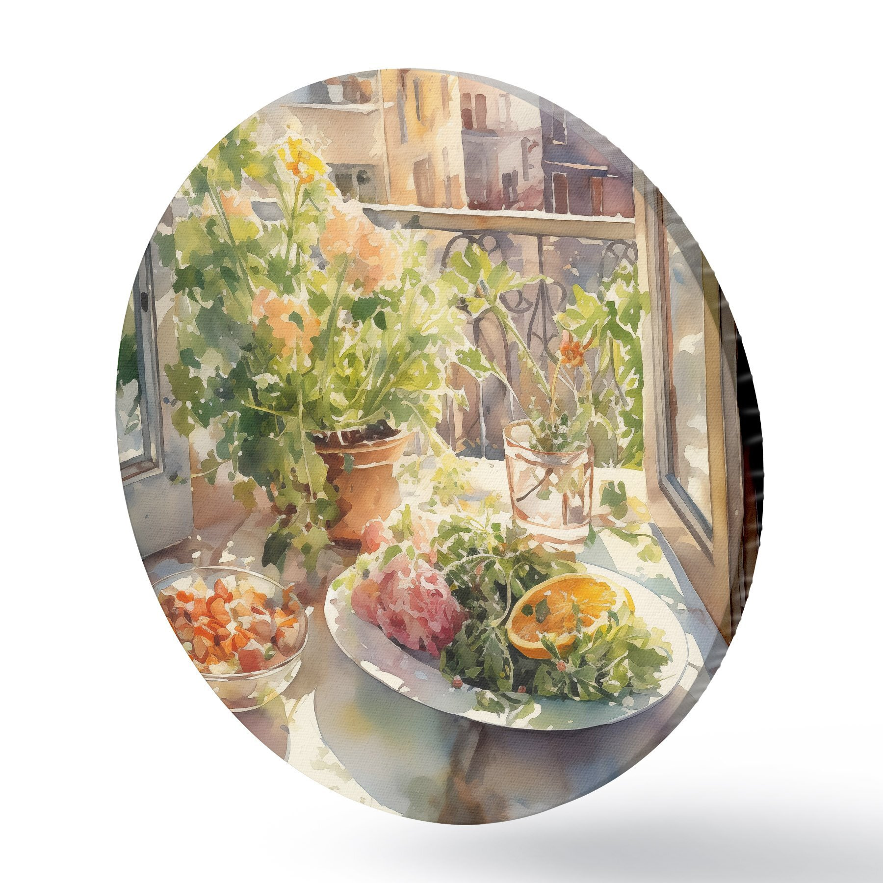Runde Gemälde Aquarell Abendessen, Stadtansicht, Blumen, Natur, grüner Salat r41166