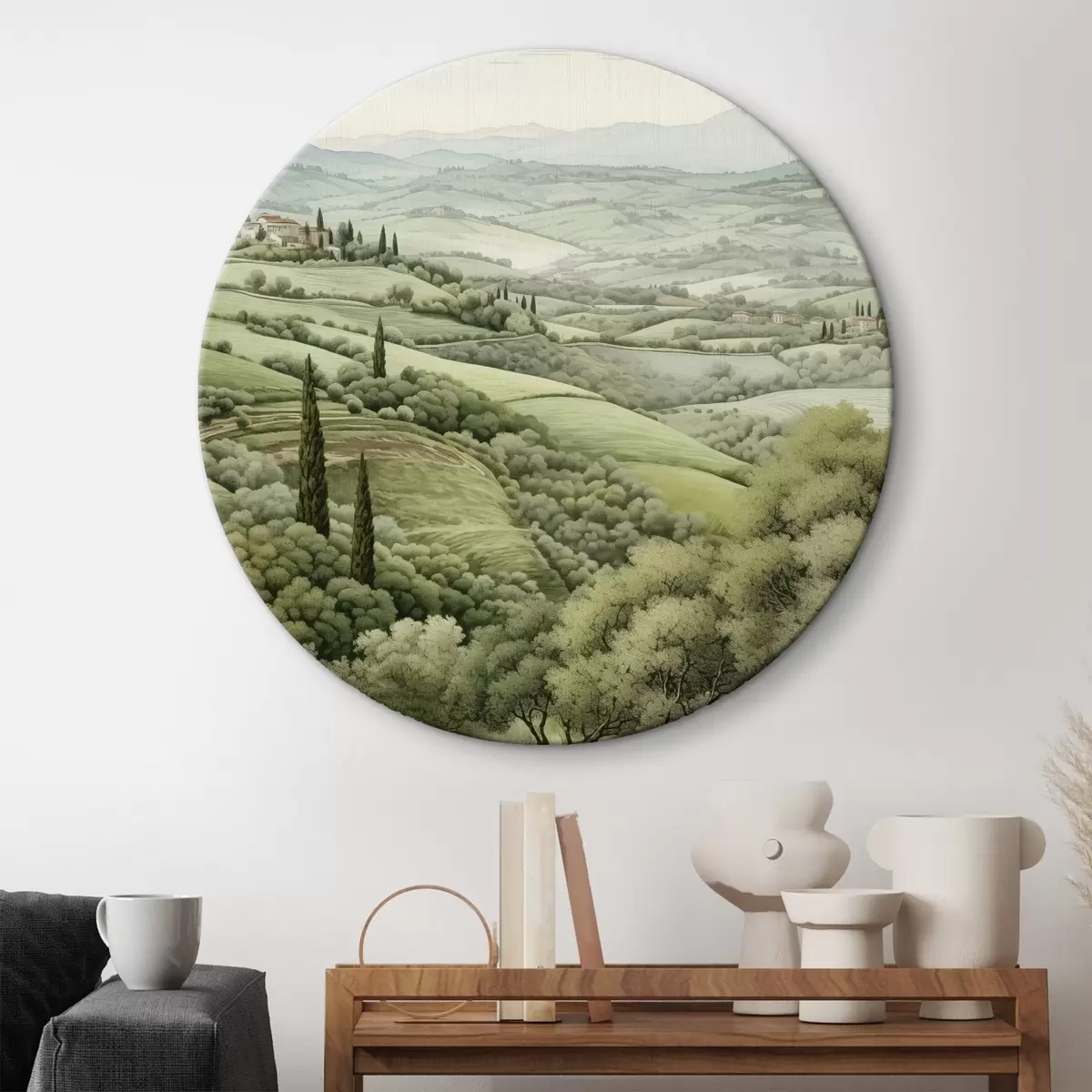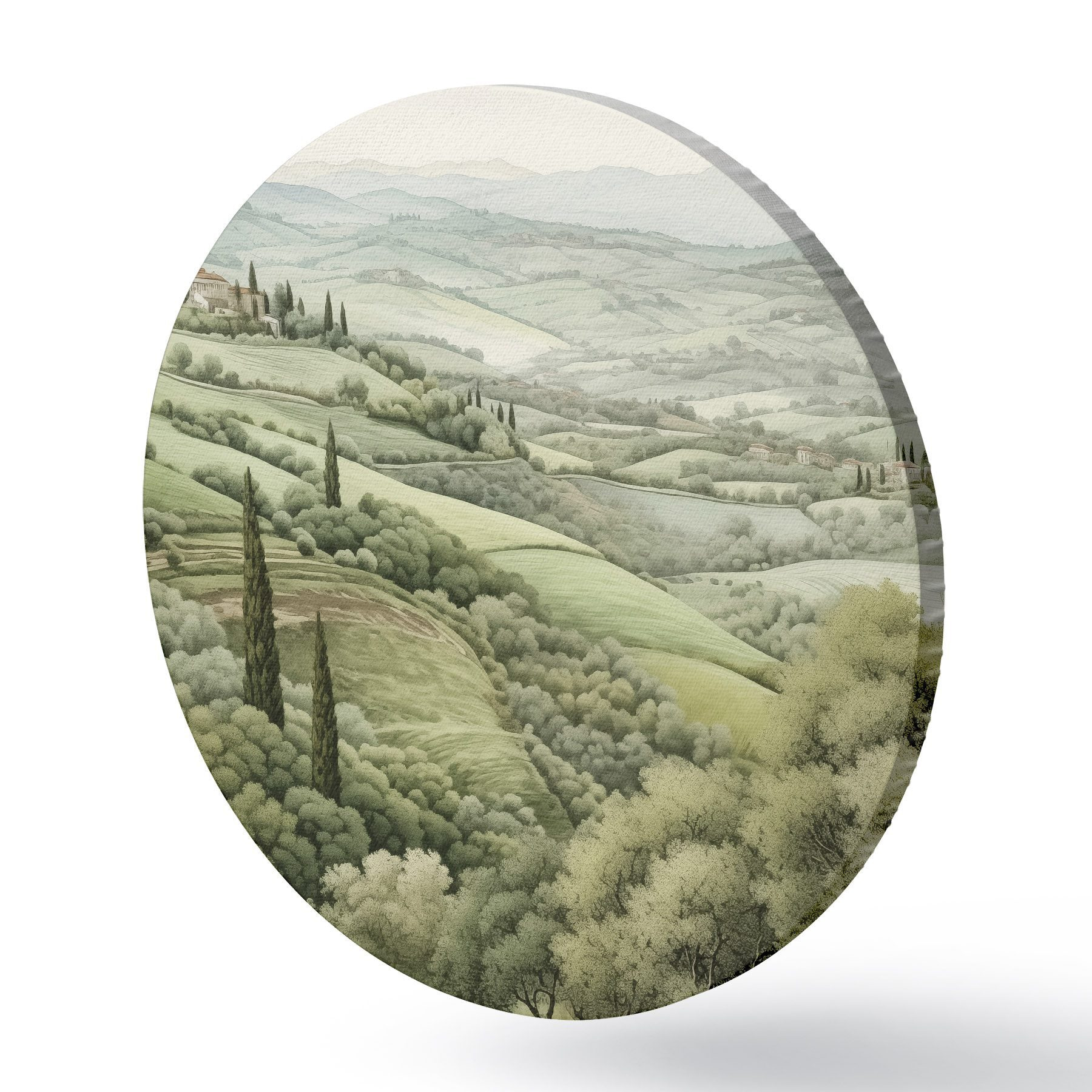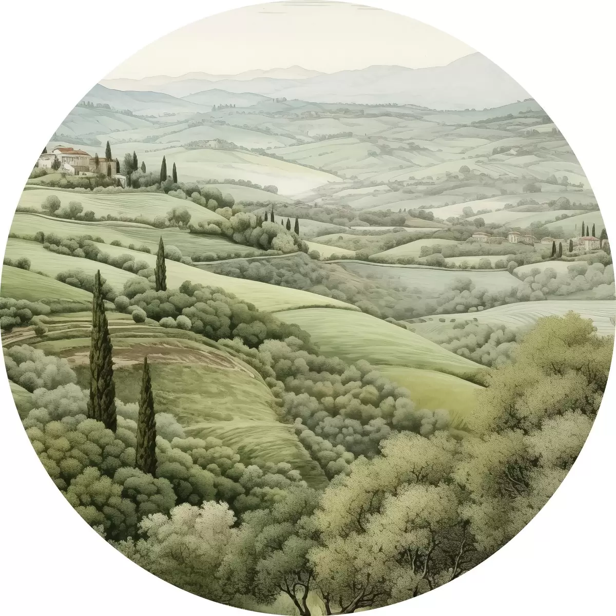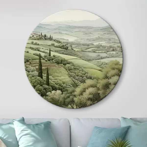 Runde Gemälde Aquarelllandschaften mit Bäumen und Bergen, Toskana, Sommer r41222