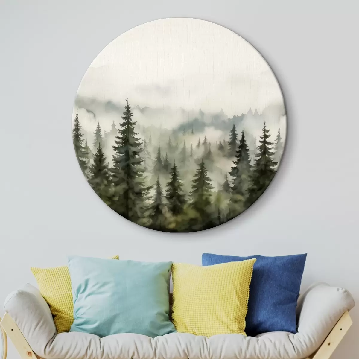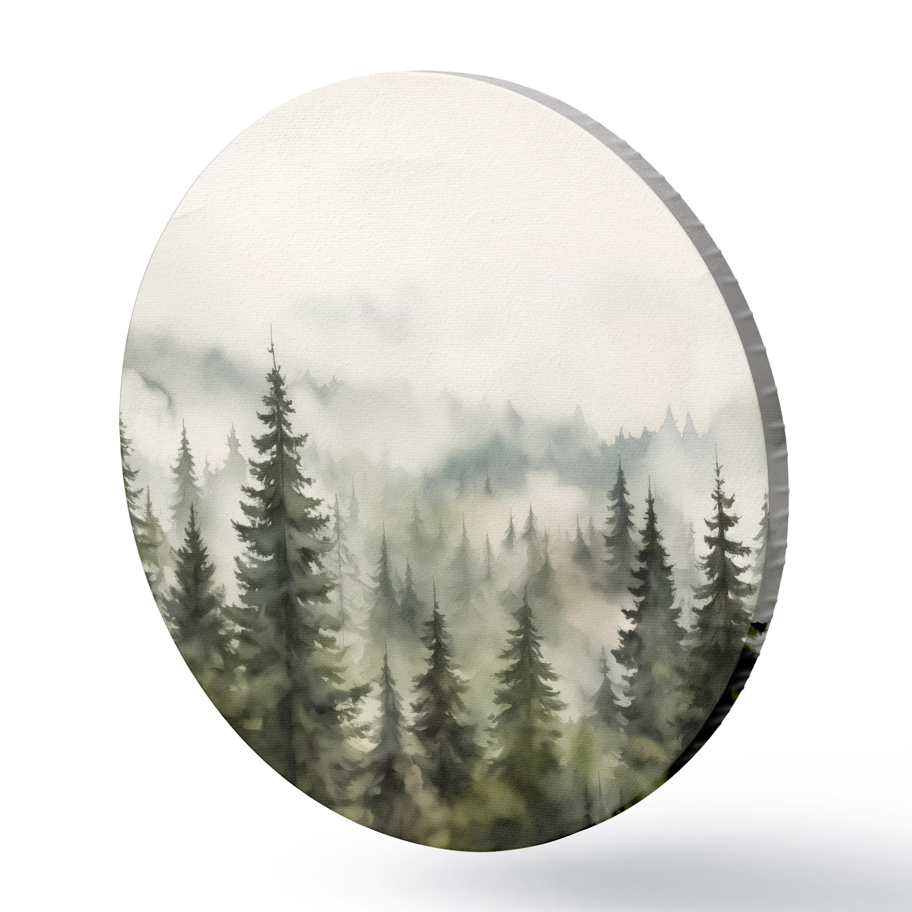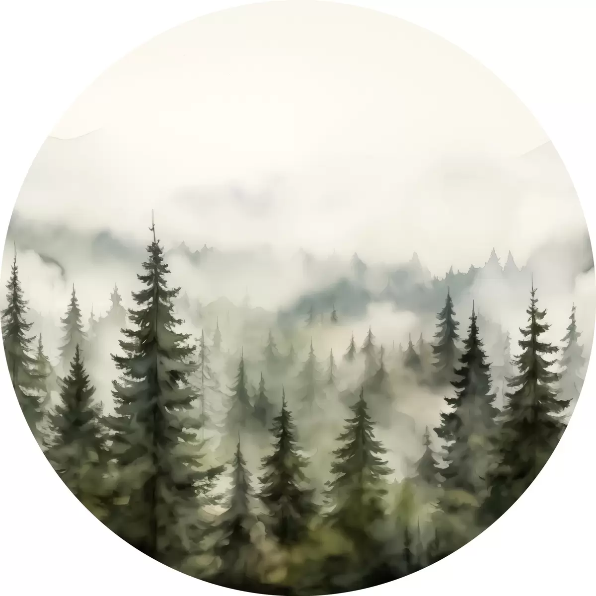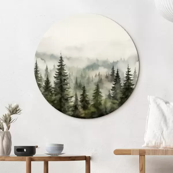 Runde Gemälde Grüner Wald auf dem Hintergrund von Bergen und Nebel Aquarell r41241