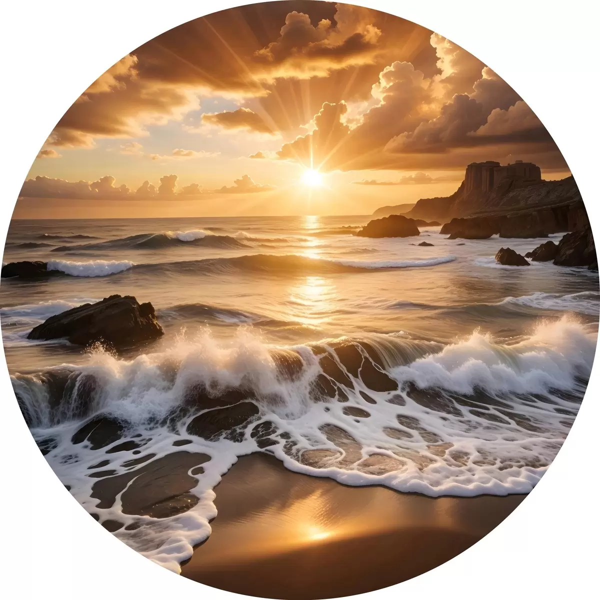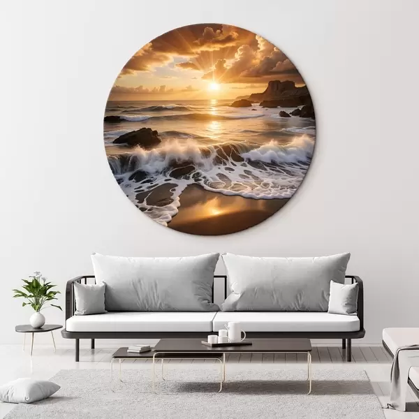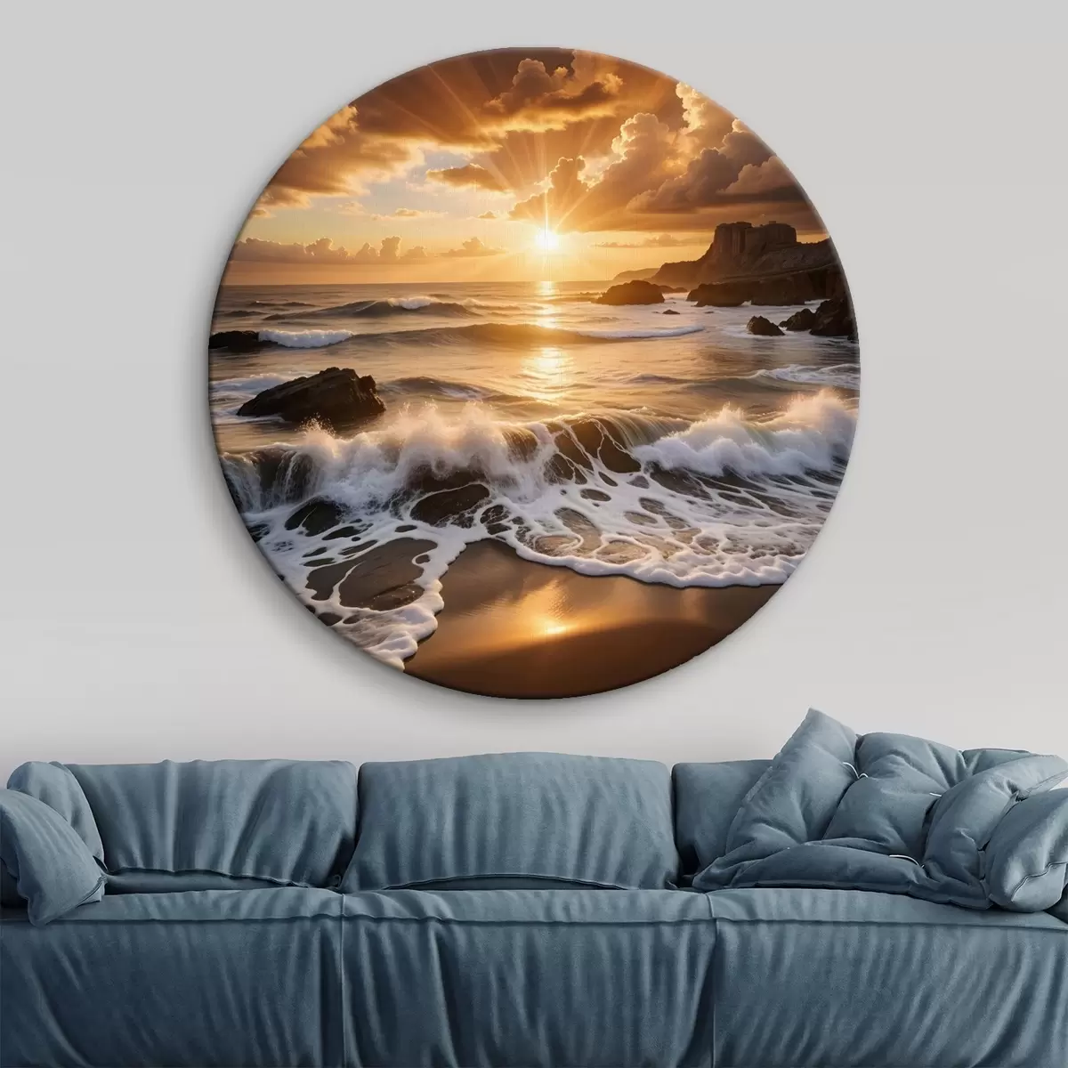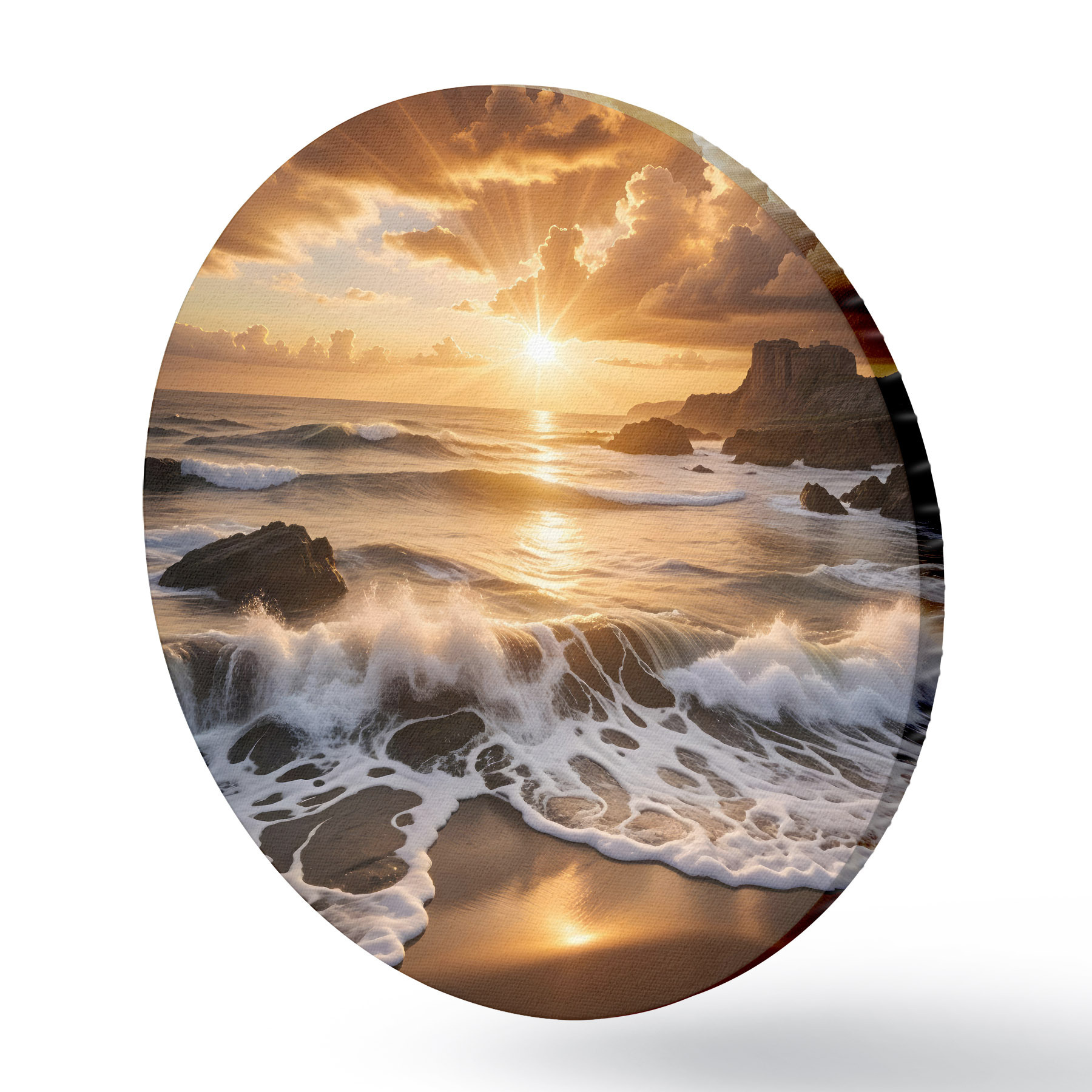 Runde Gemälde Dramatischer Sonnenuntergang über der felsigen Küste, mit krachenden Wellen und dramatischen Wolken am Himmel r41245