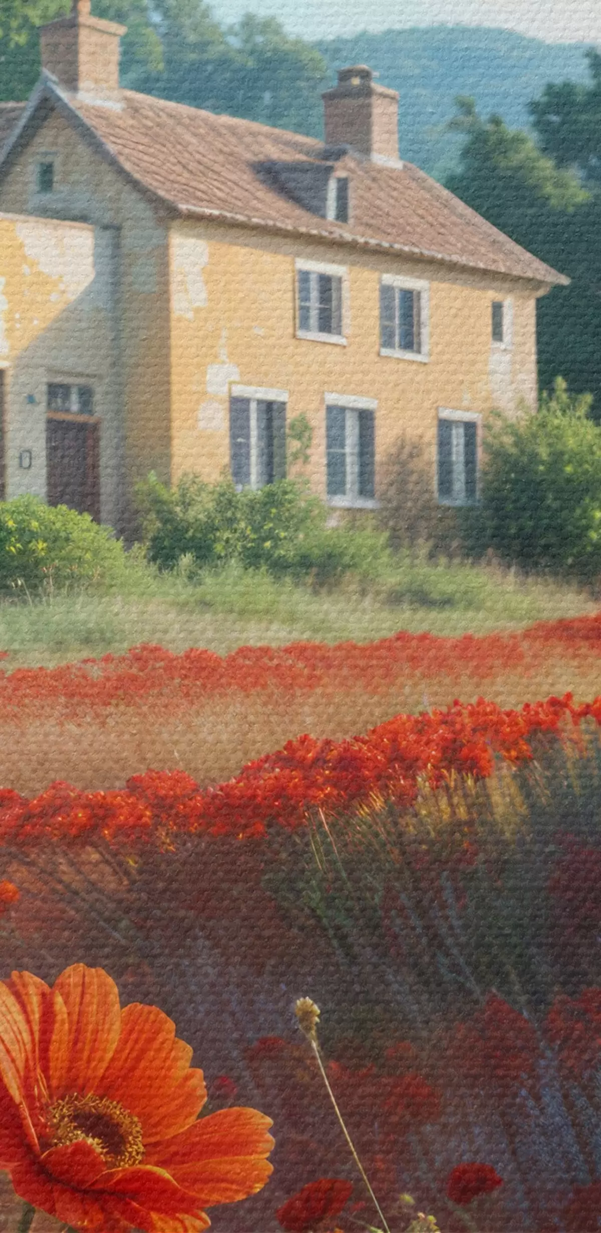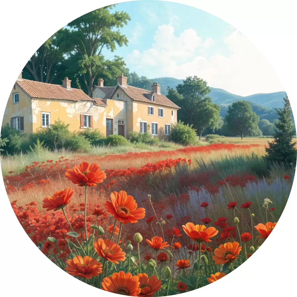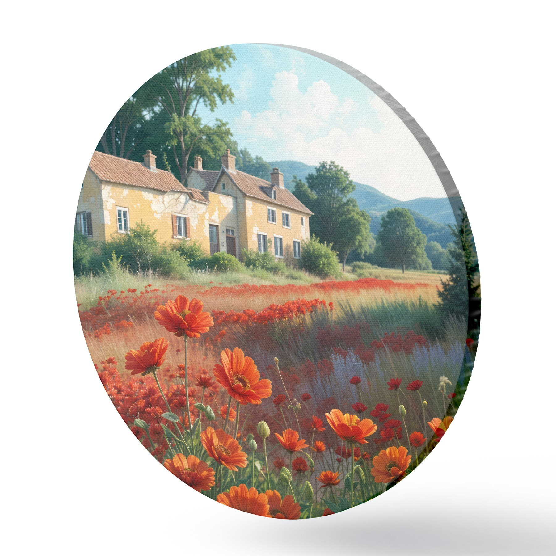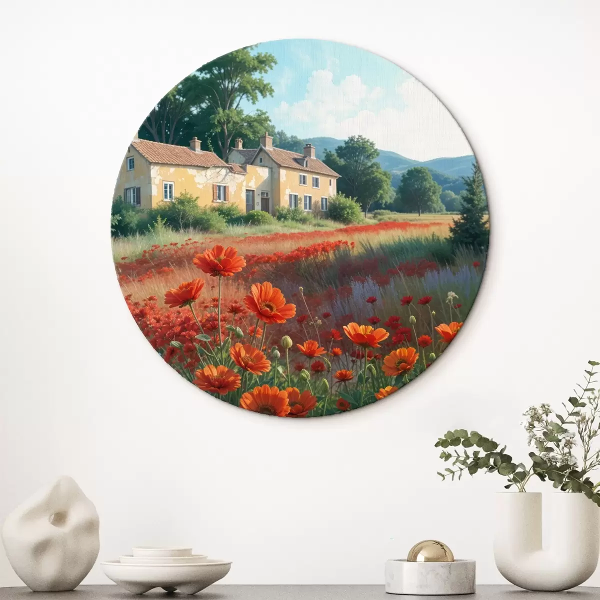 Runde Gemälde Ein Feld voller leuchtend roter Mohnblumen im Vordergrund, mit einer Reihe reizvoller gelber und weißer Häuser im Hintergrund r41260