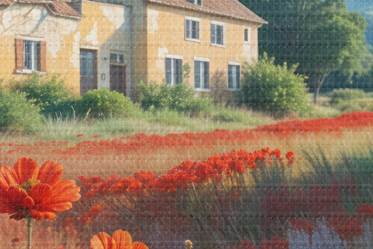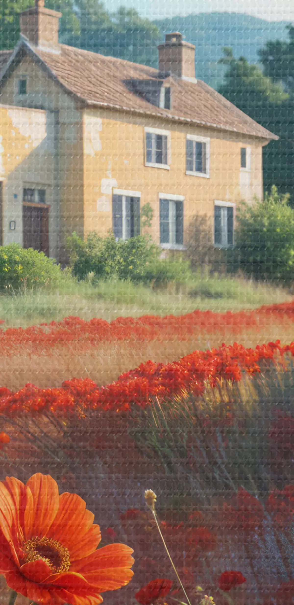 Bild Ein Feld voller leuchtend roter Mohnblumen im Vordergrund, mit einer Reihe reizvoller gelber und weißer Häuser im Hintergrund Nr r41260