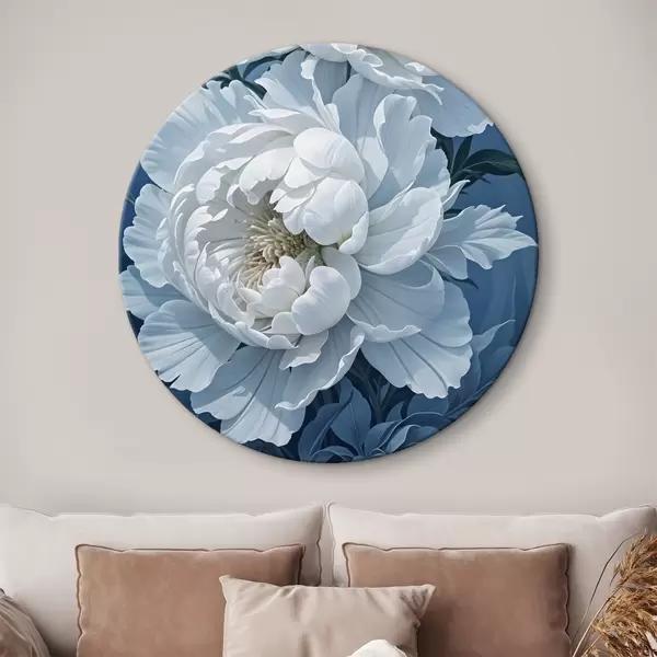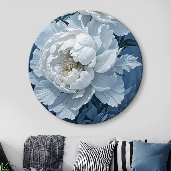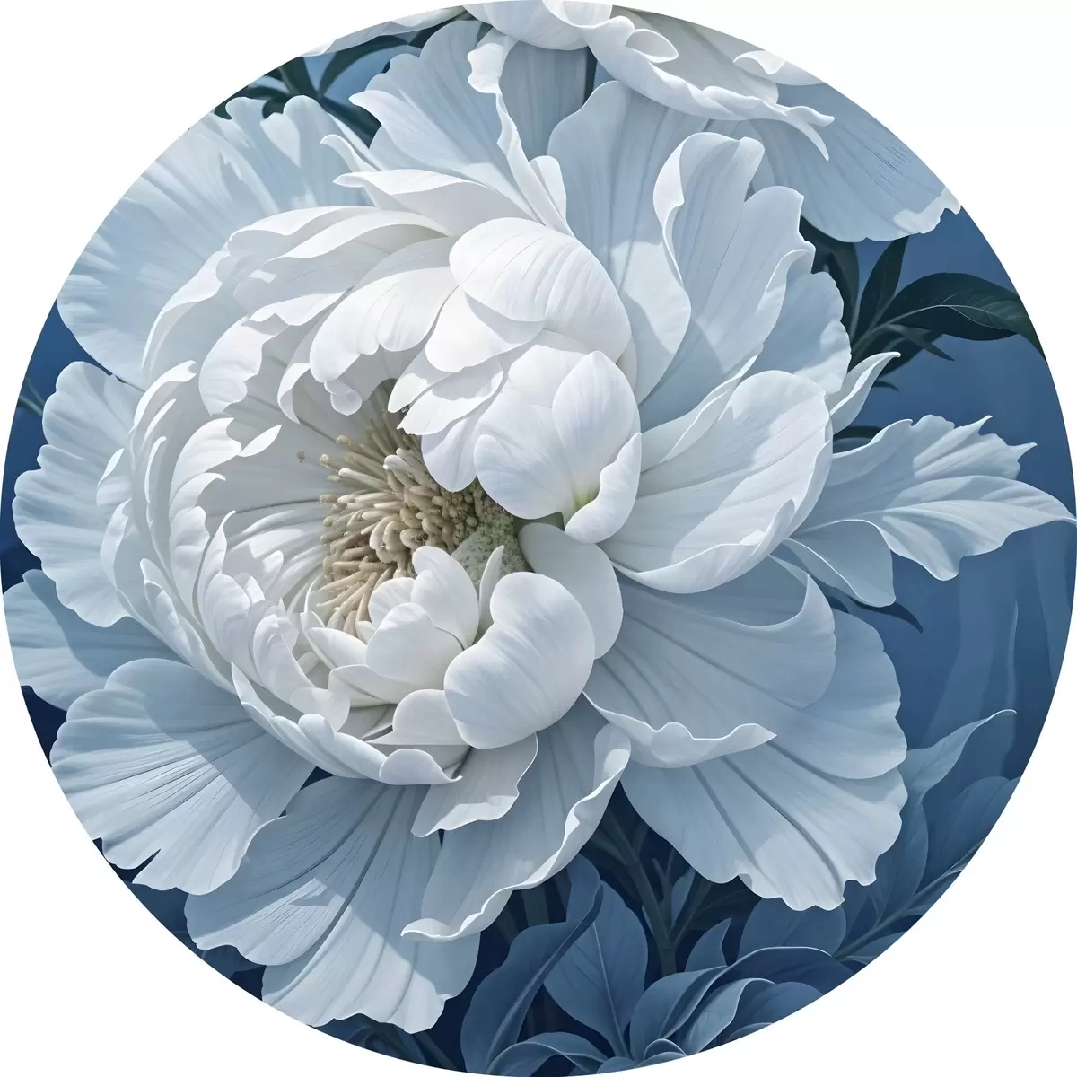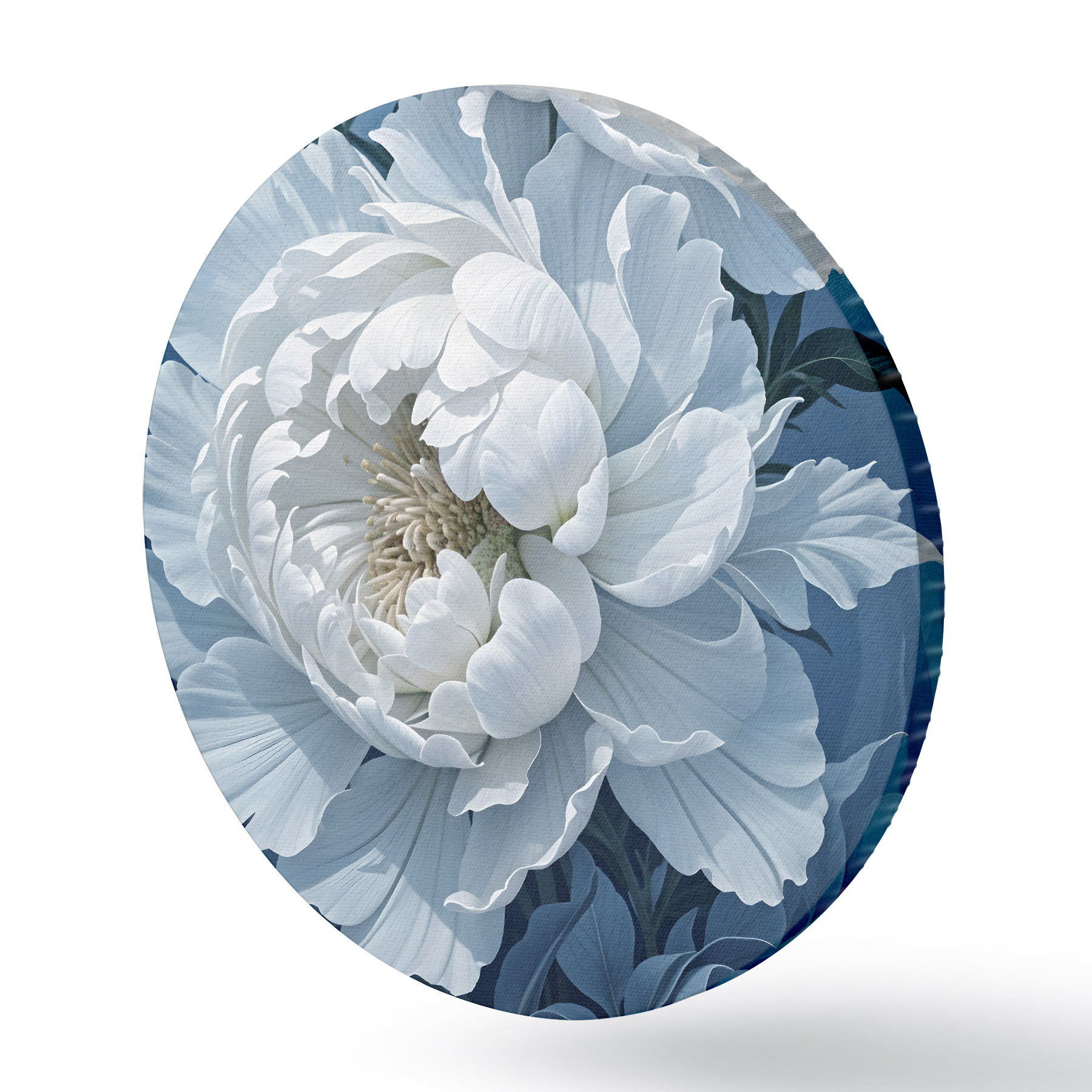 Runde Gemälde Weiße Pfingstrosen mit grünen Blättern auf dunkelblauem Hintergrund r41270