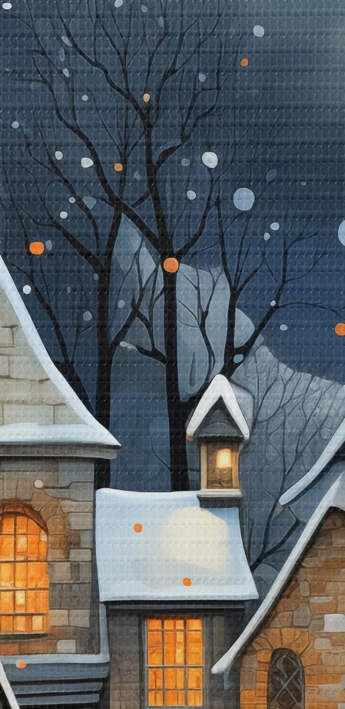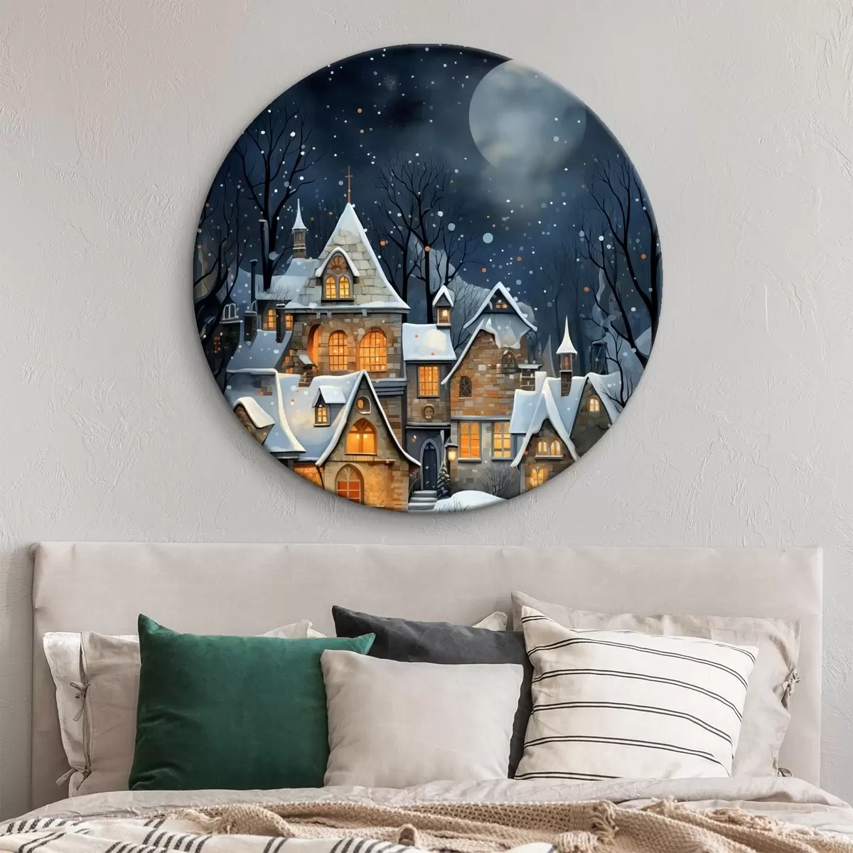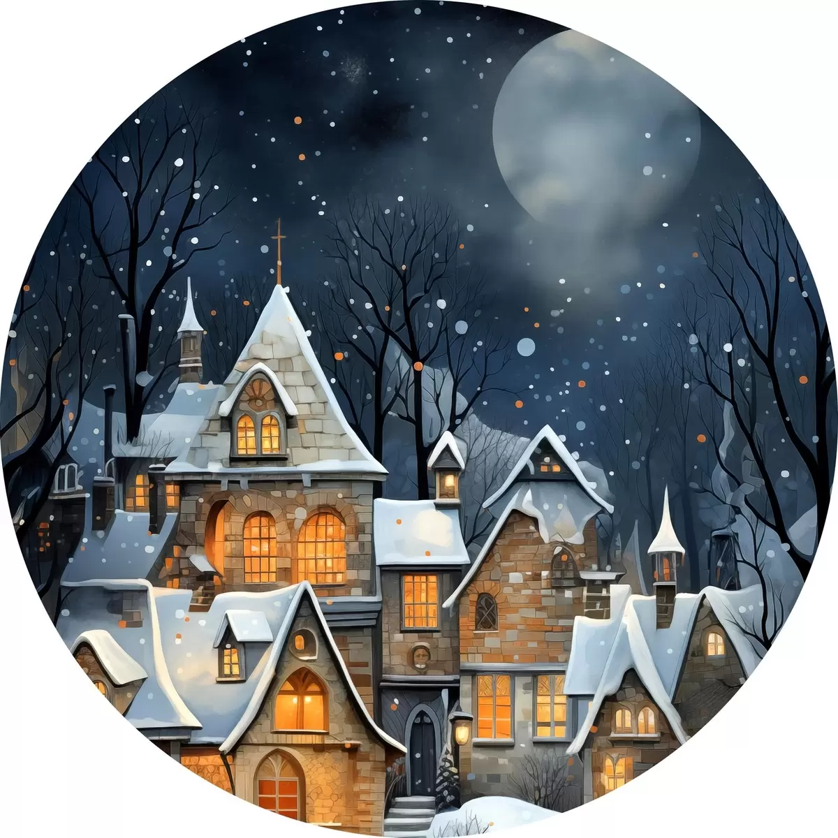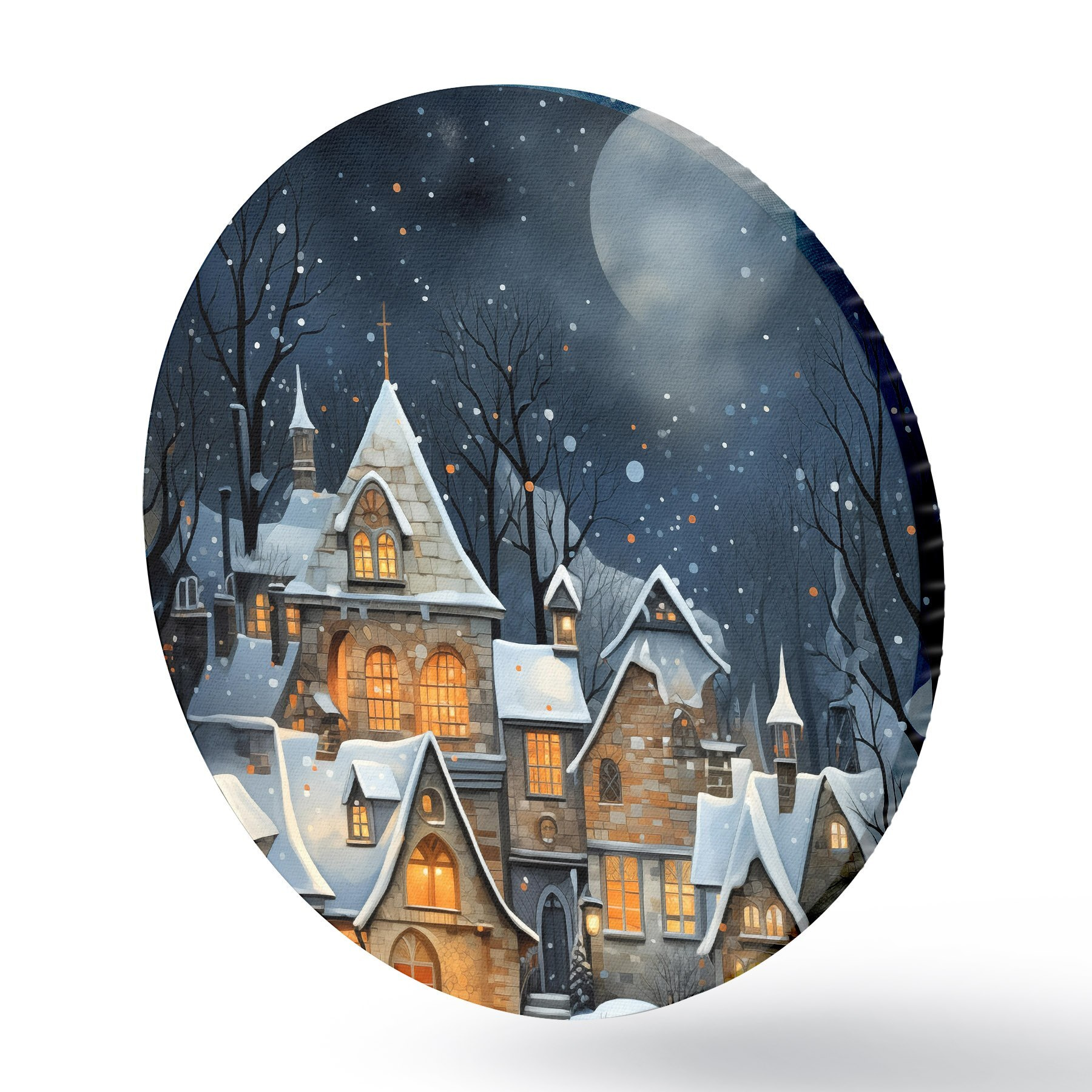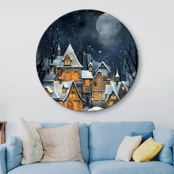 Runde Gemälde Häuser im Schnee vor dem nächtlichen Sternenhimmel r41276