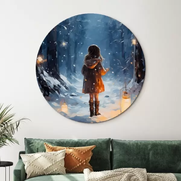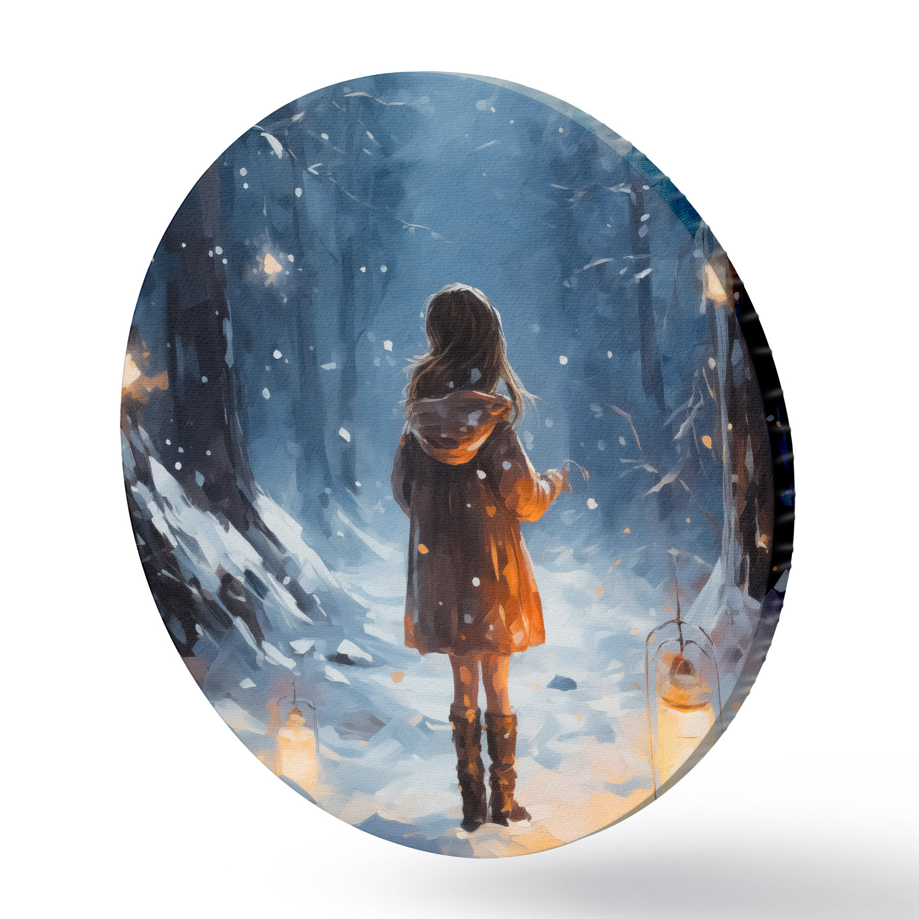 Runde Gemälde Mädchen im nächtlichen Winterwald zwischen Bäumen und Laternen r41277