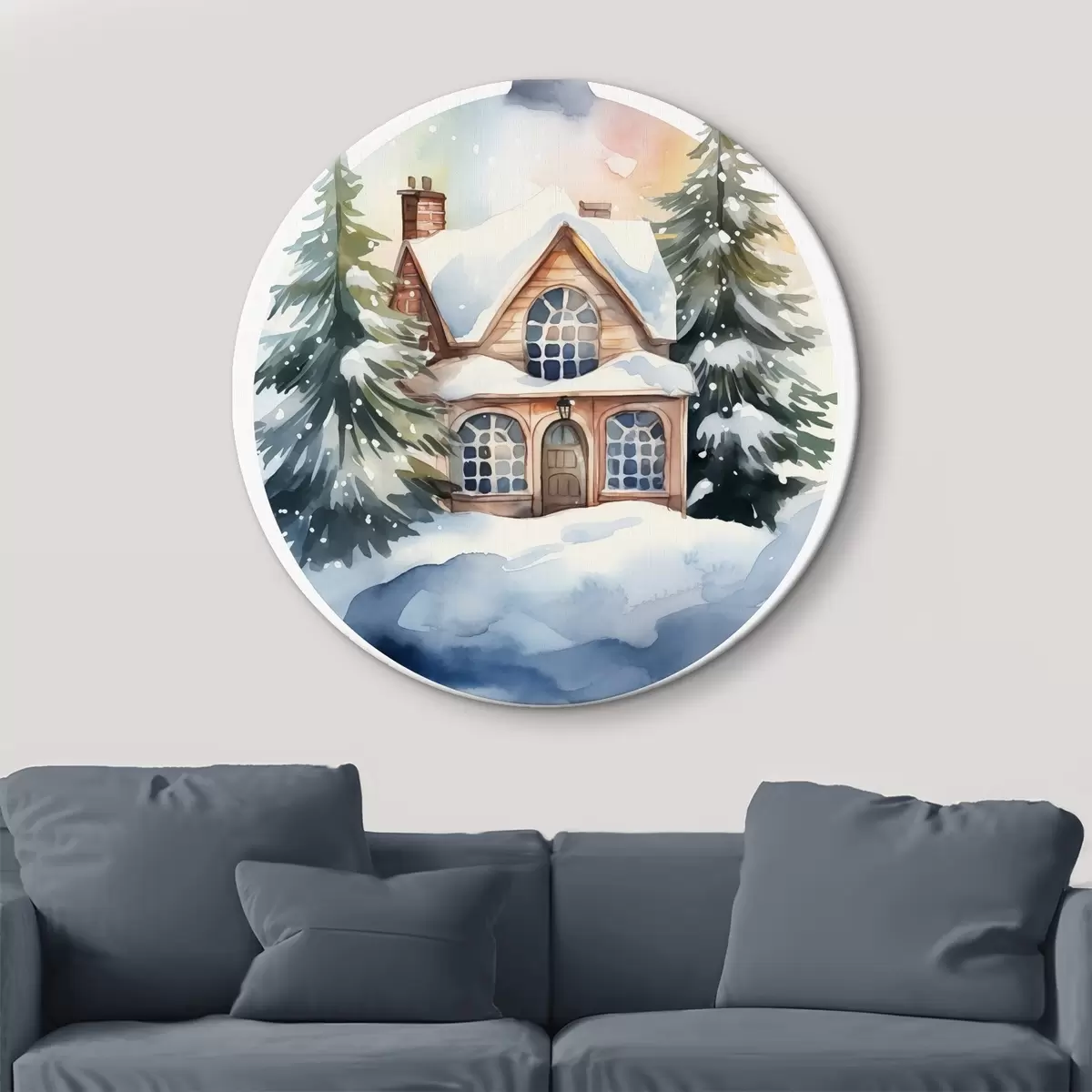 Runde Gemälde Weihnachtliche Dekokugel mit Aquarell-Schneehaus und Tannenbäumen r41363