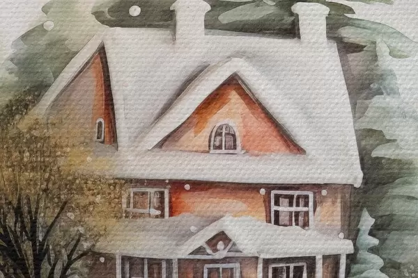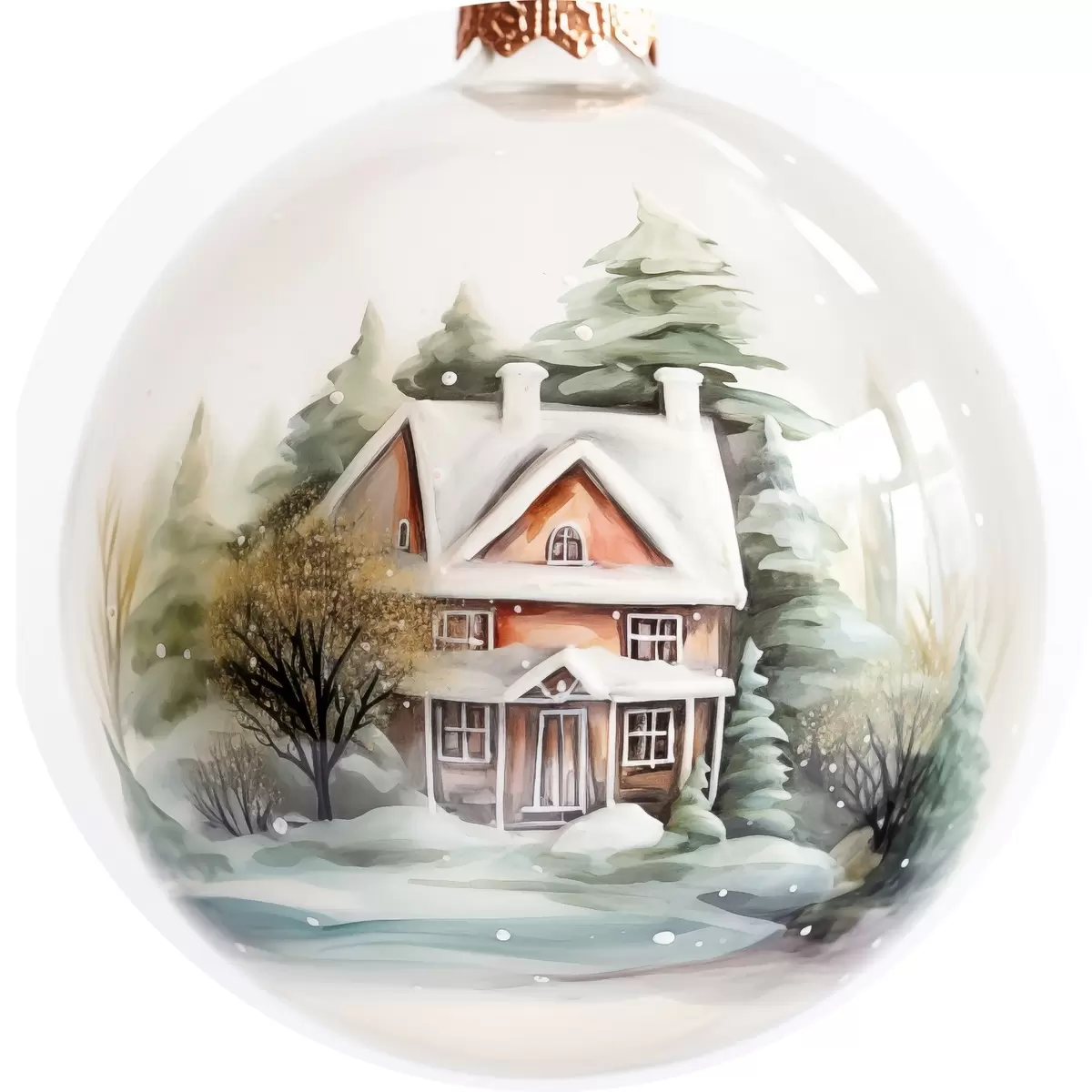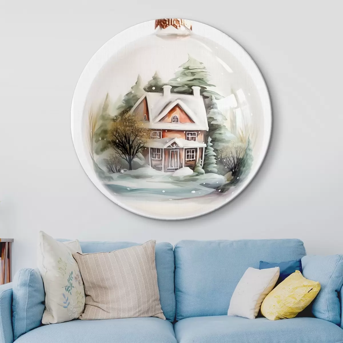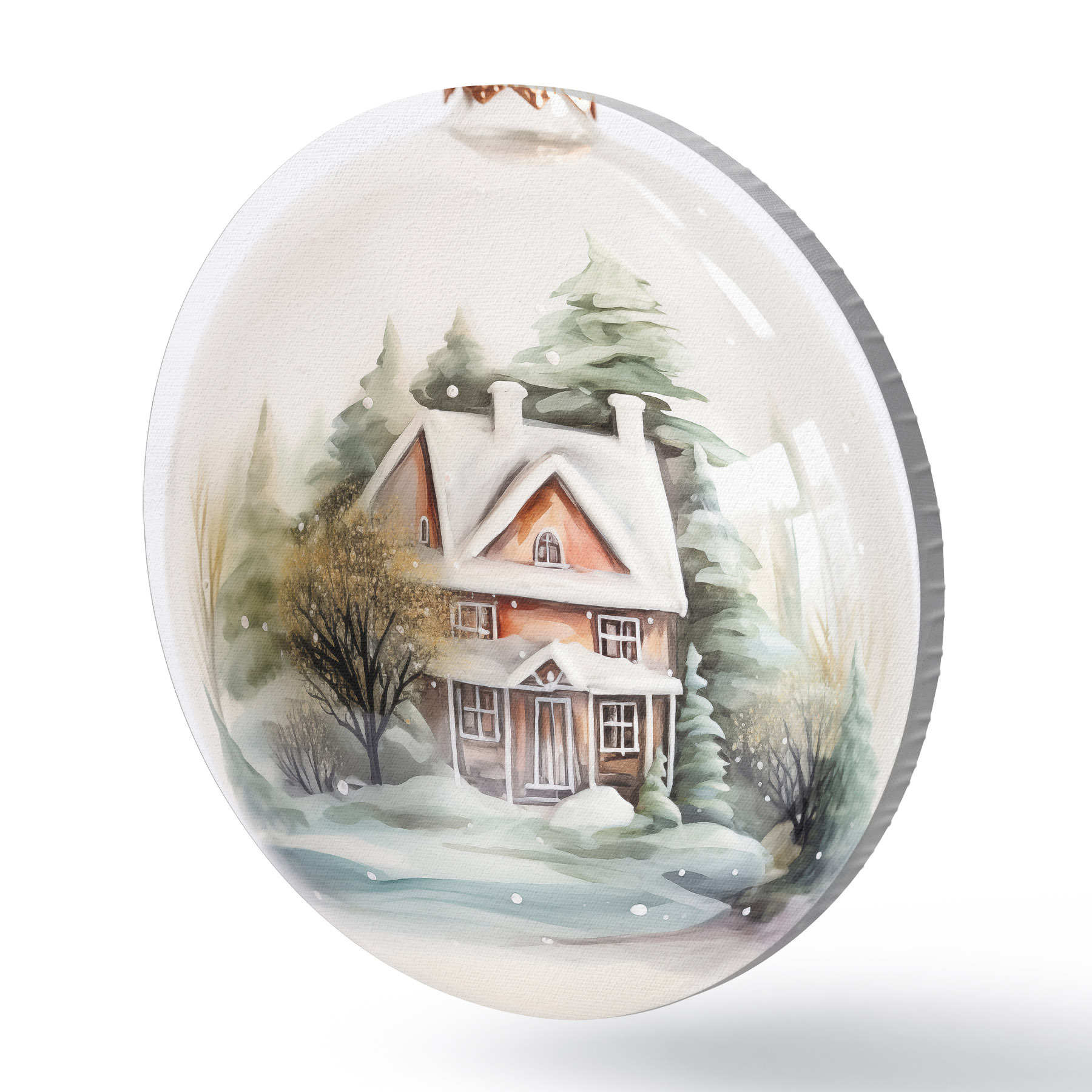 Runde Gemälde Kristallkugel mit Aquarellhaus und Bäumen im Schnee r41365