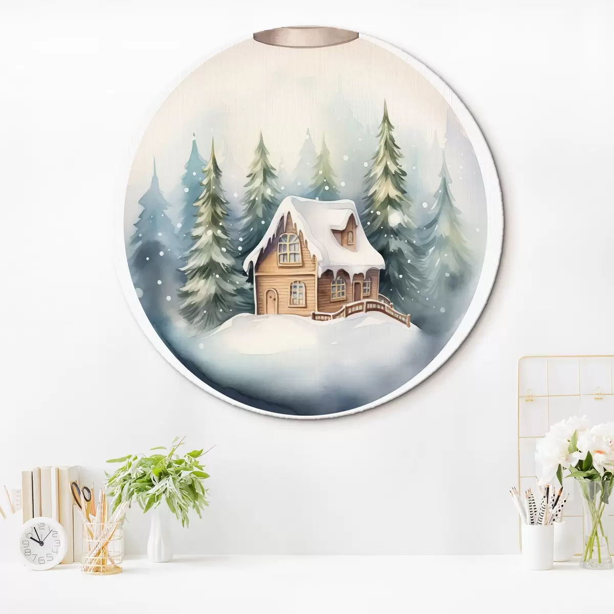 Runde Gemälde Aquarell Kristallkugel mit Winterlandschaft, Haus im Wald, Schnee r41366