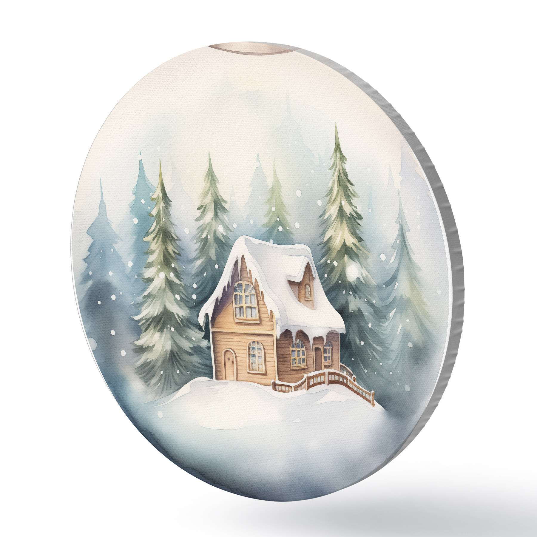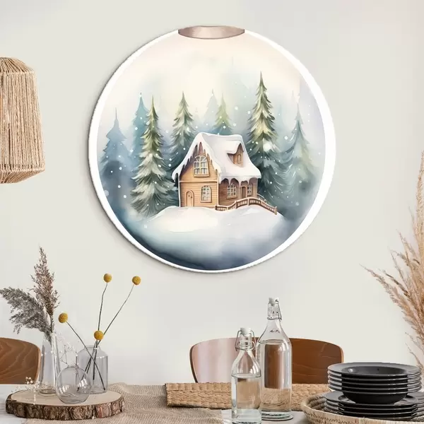 Runde Gemälde Aquarell Kristallkugel mit Winterlandschaft, Haus im Wald, Schnee r41366