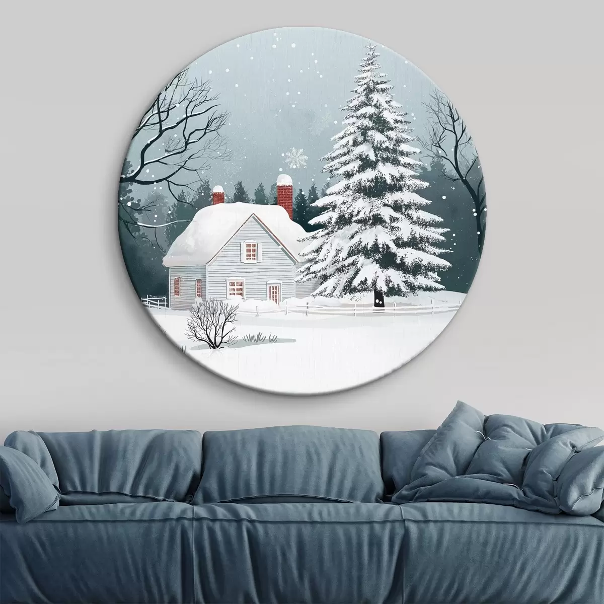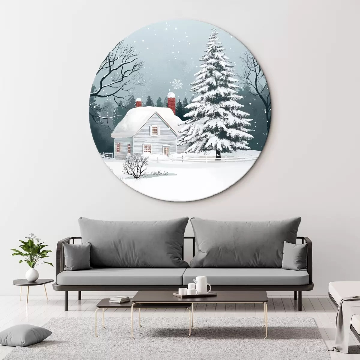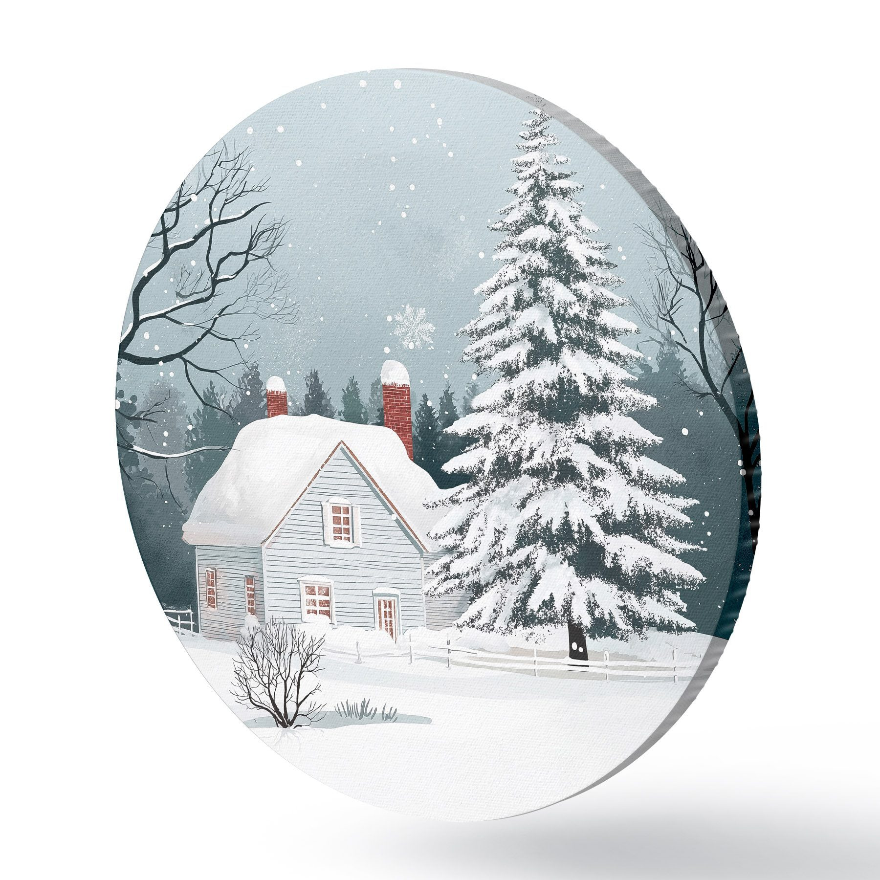 Runde Gemälde Winterszene mit Haus mit Schnee bedeckt, Wald, Kiefern r41369
