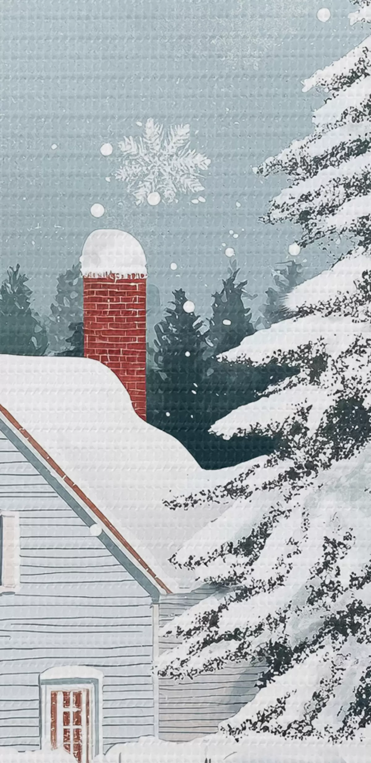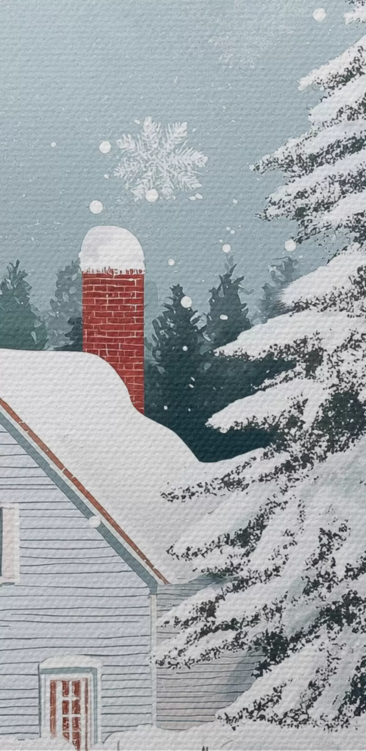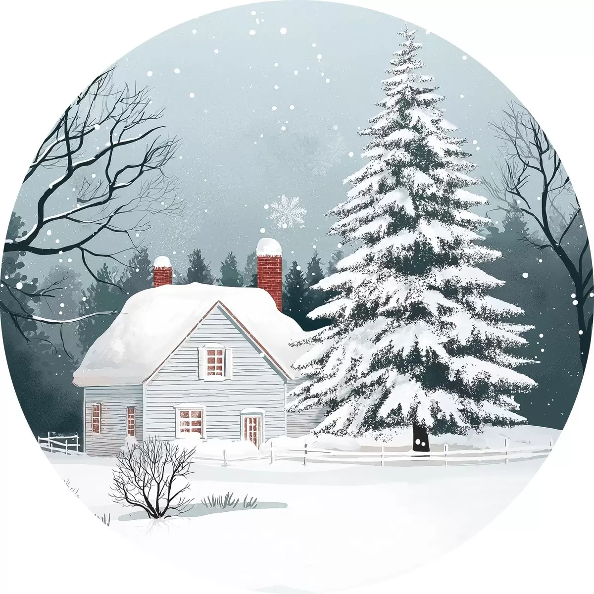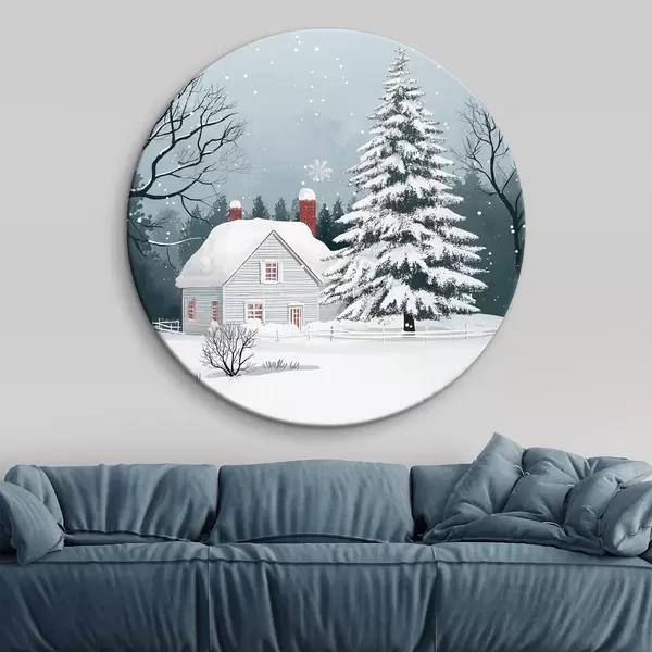 Runde Gemälde Winterszene mit Haus mit Schnee bedeckt, Wald, Kiefern r41369