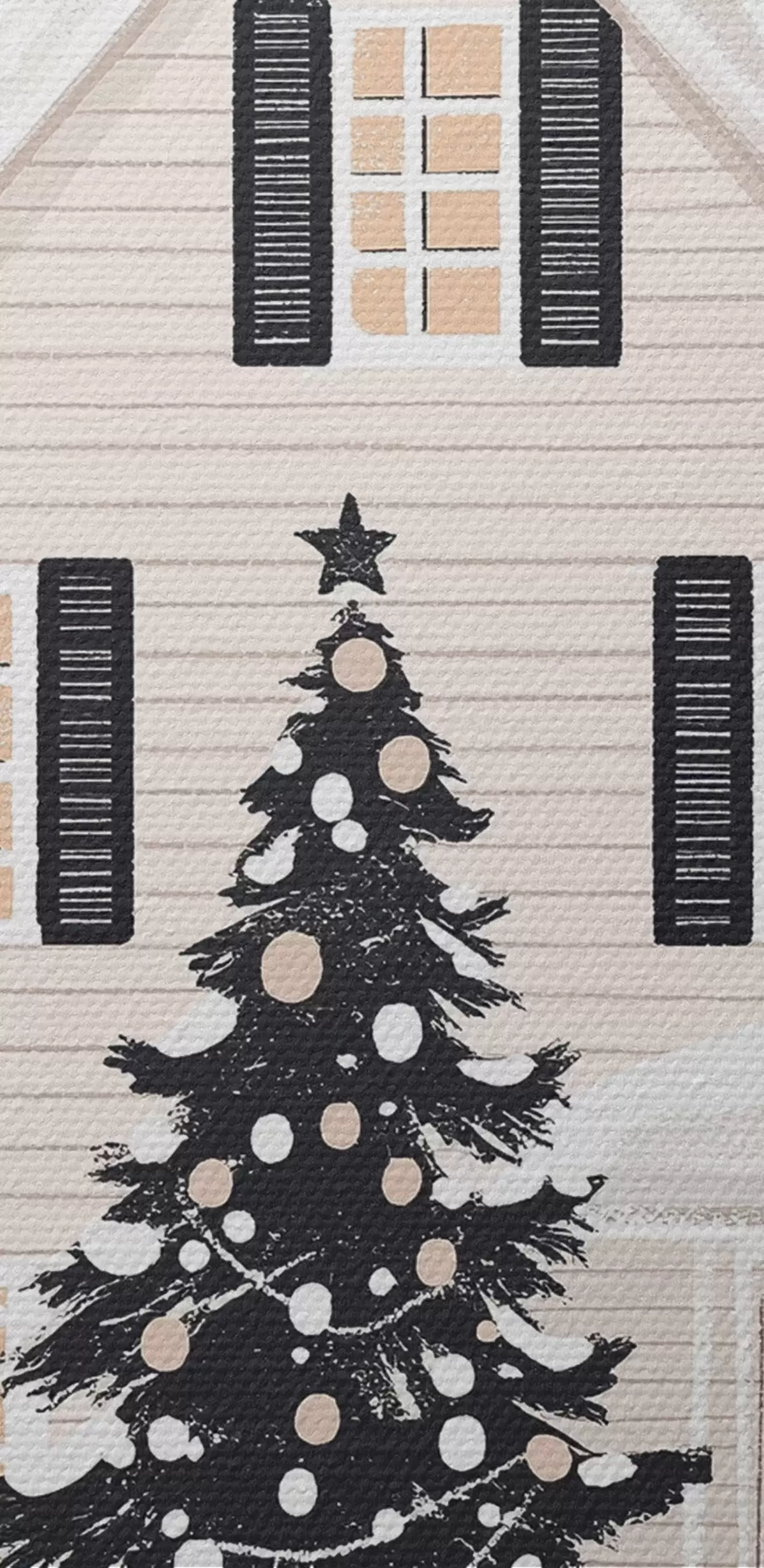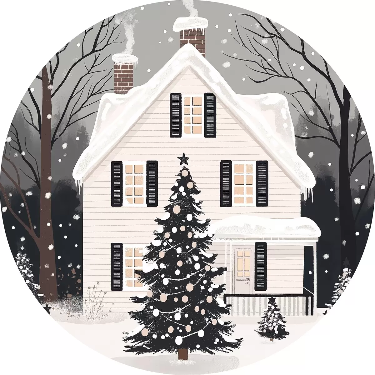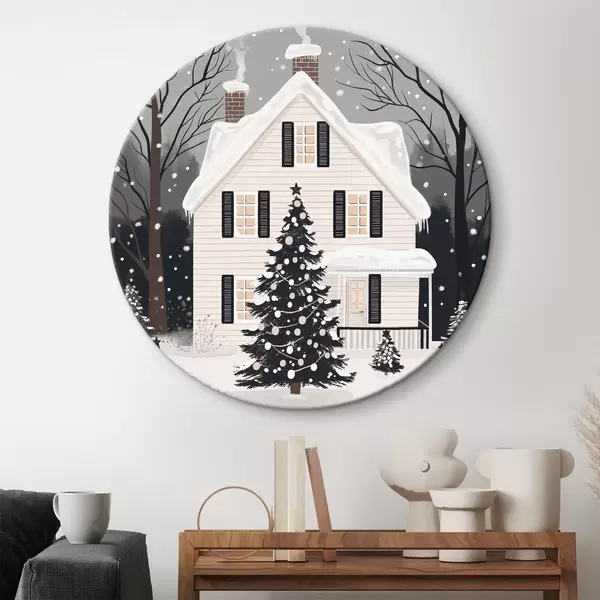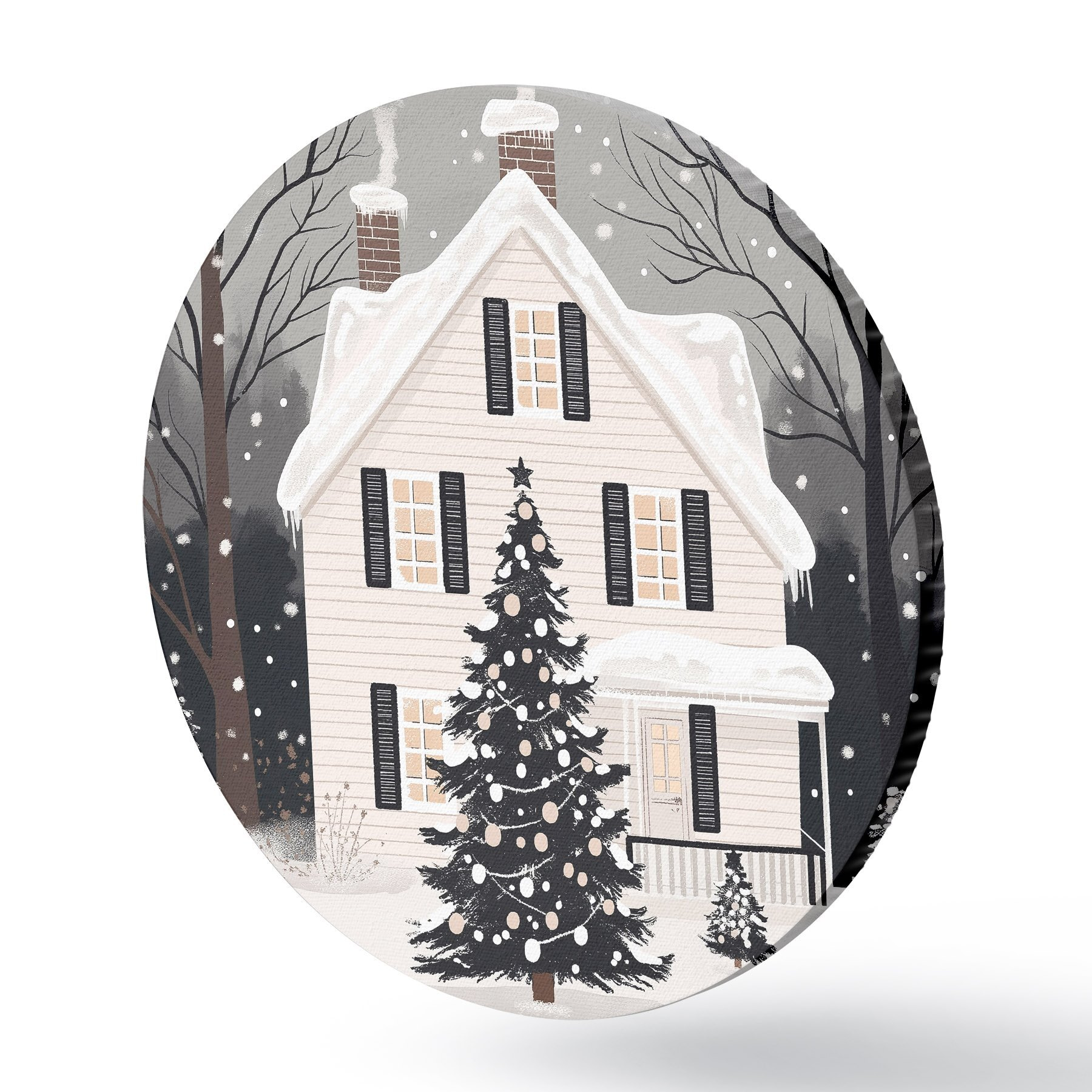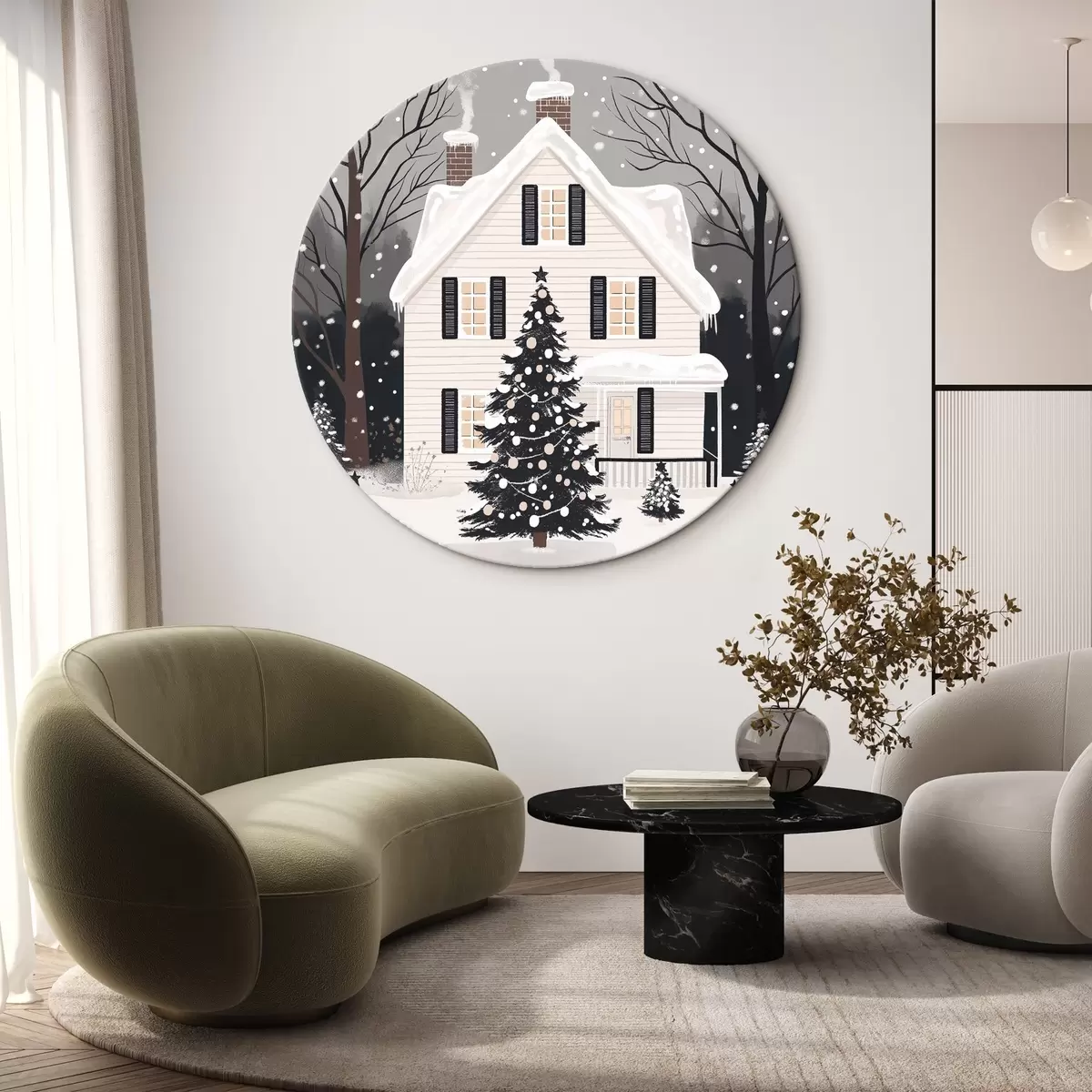 Runde Gemälde Winterstadt, geschmückter Tannenbaum, Weihnachten, Wald, schönes Haus r41371