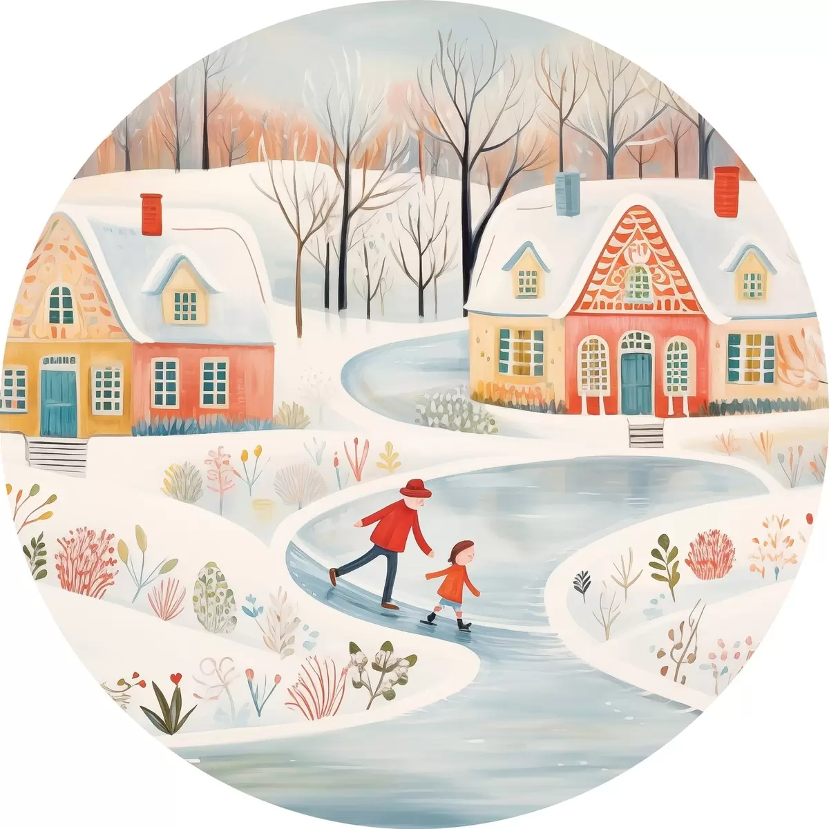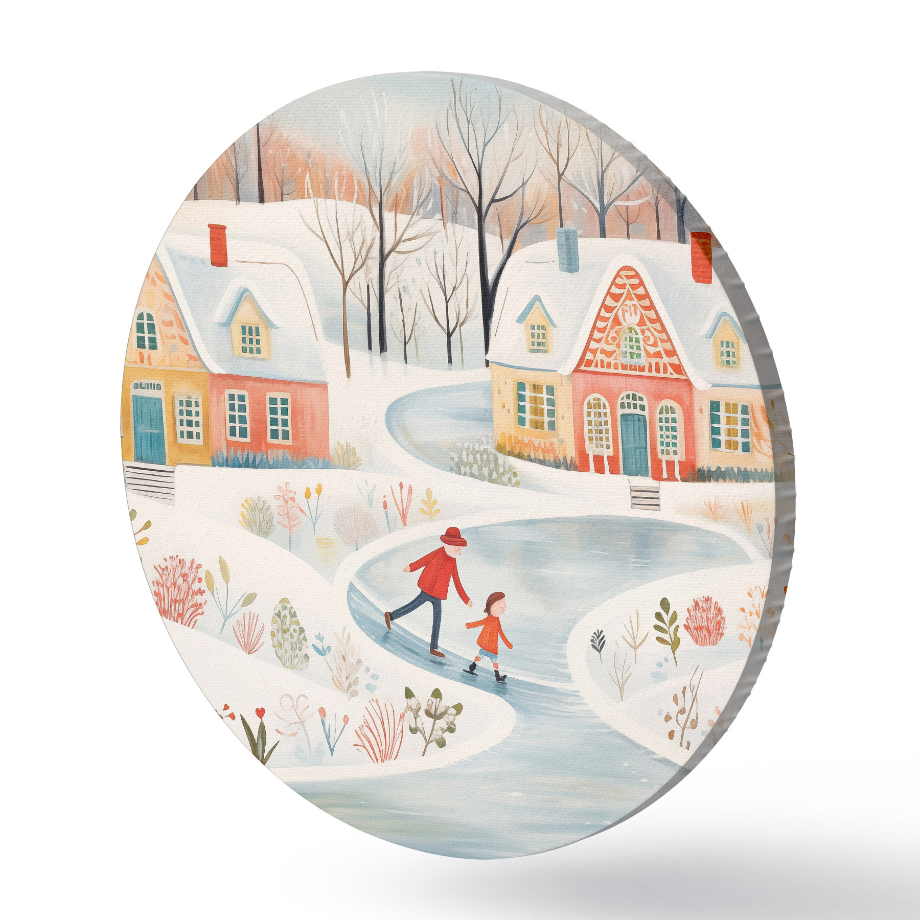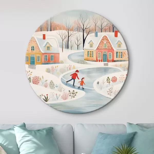 Runde Gemälde Winterdorf, Wald, Blumen, Schlittschuhe, bunte Häuser r41378