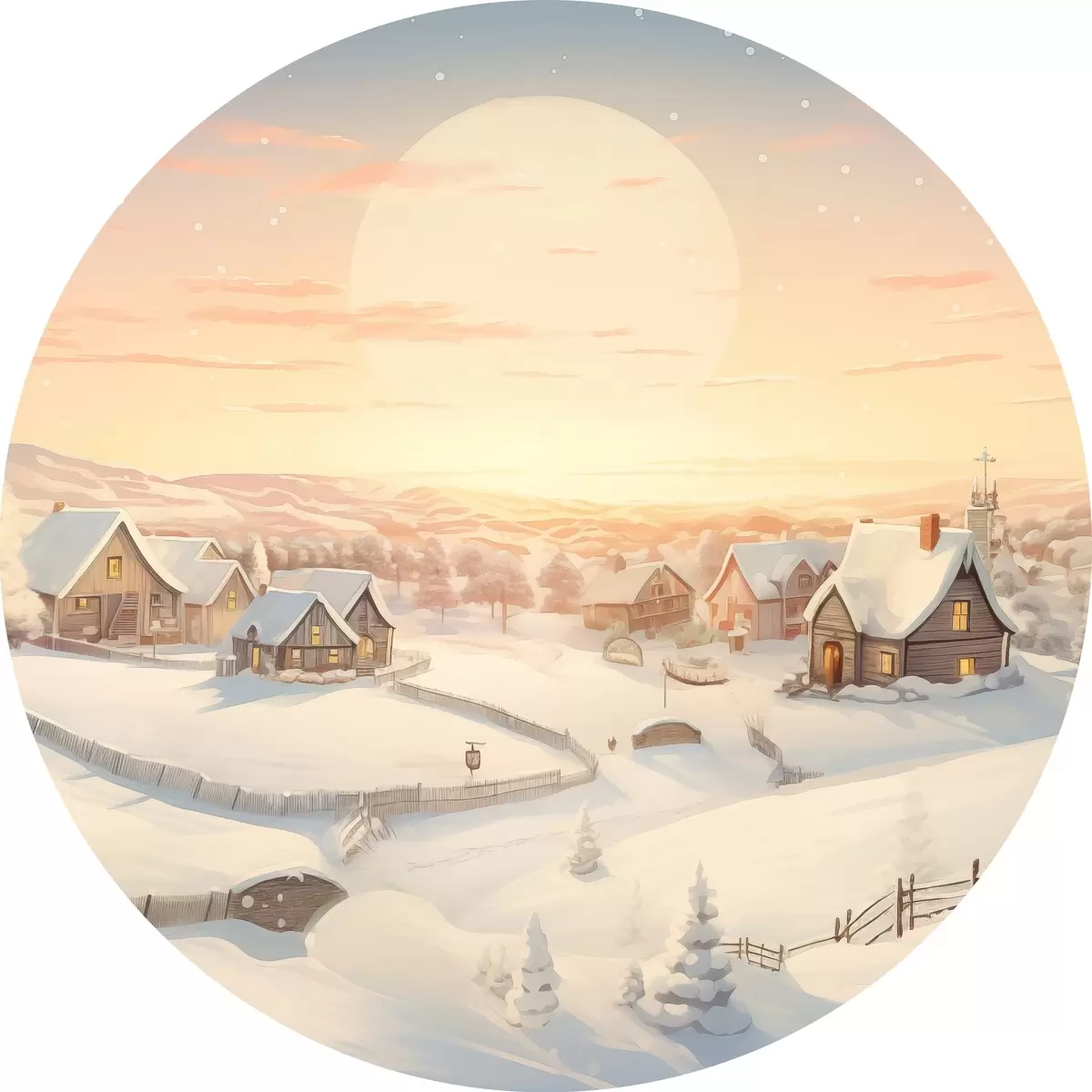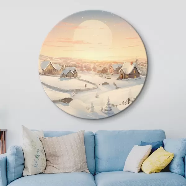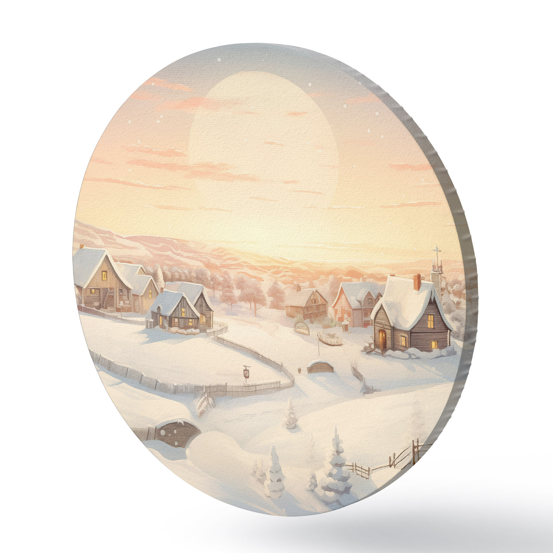Runde Gemälde Winterdorf bei Sonnenuntergang, Häuser mit Schnee bedeckt, Kiefern r41380