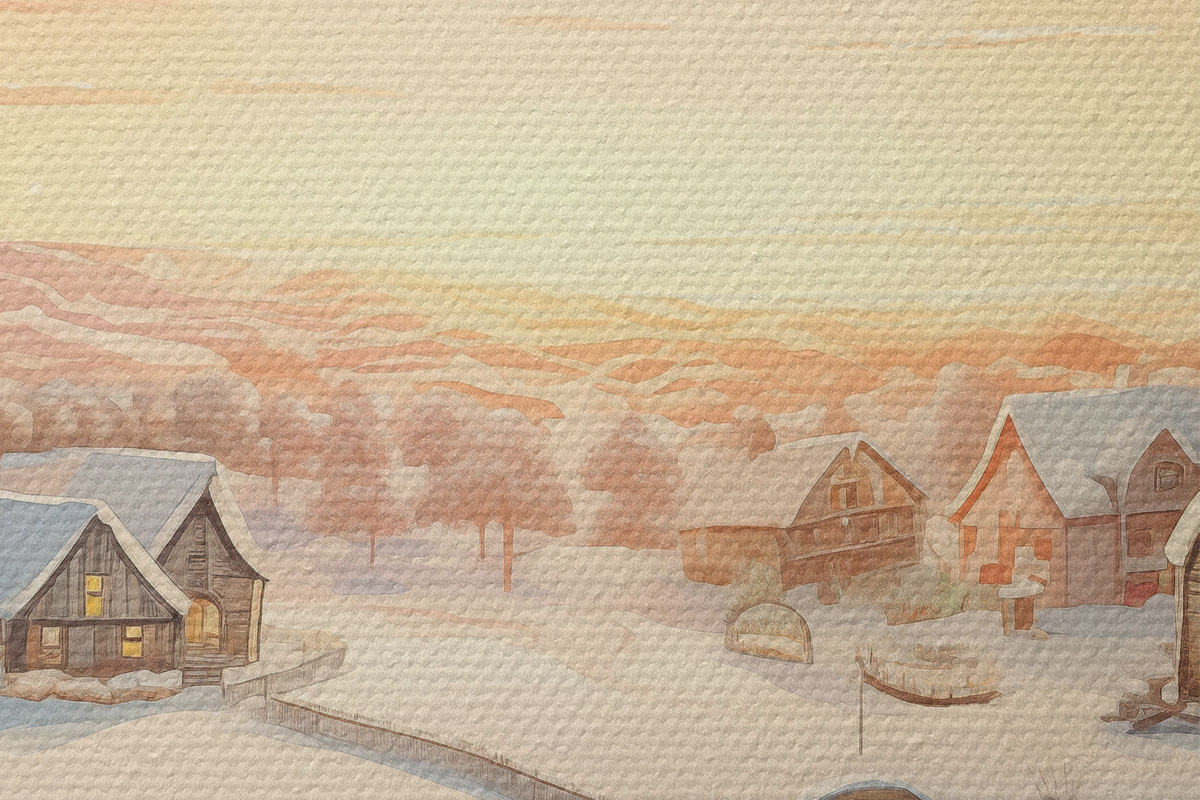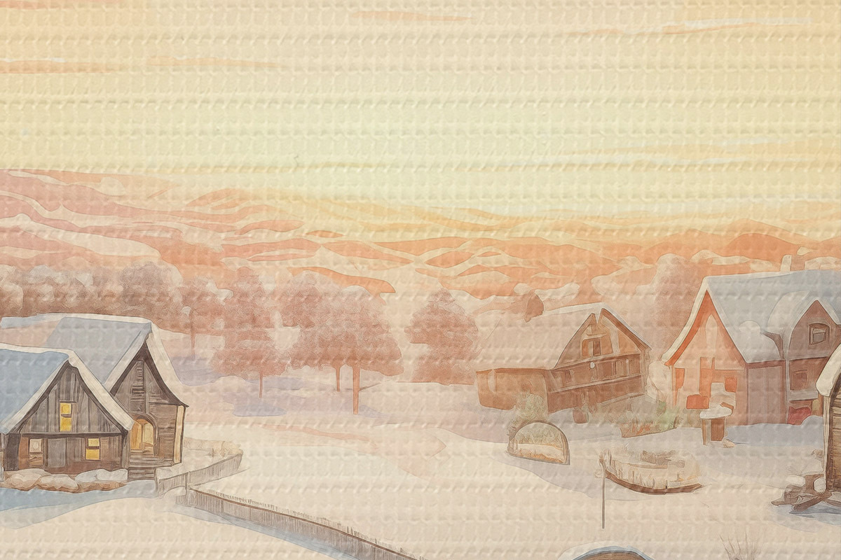Bild Winterdorf bei Sonnenuntergang, Häuser mit Schnee bedeckt, Kiefern Nr r41380