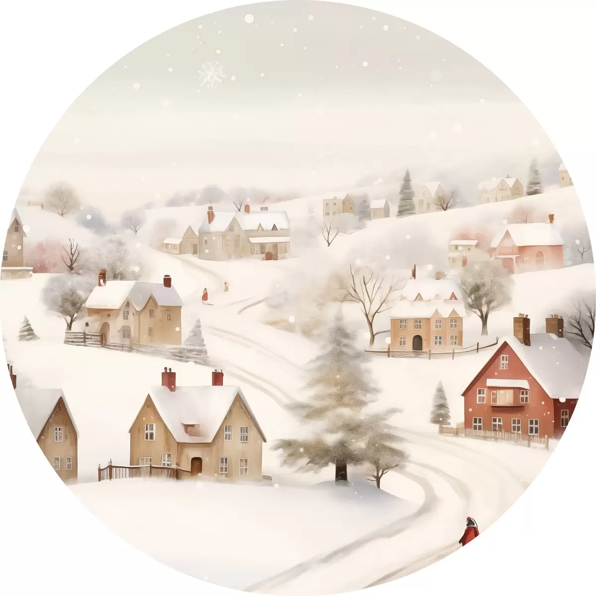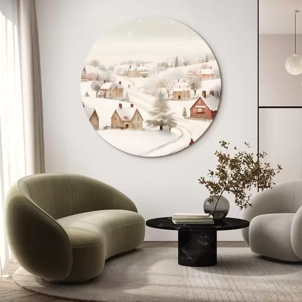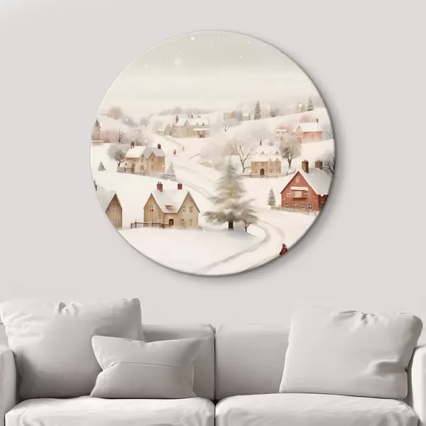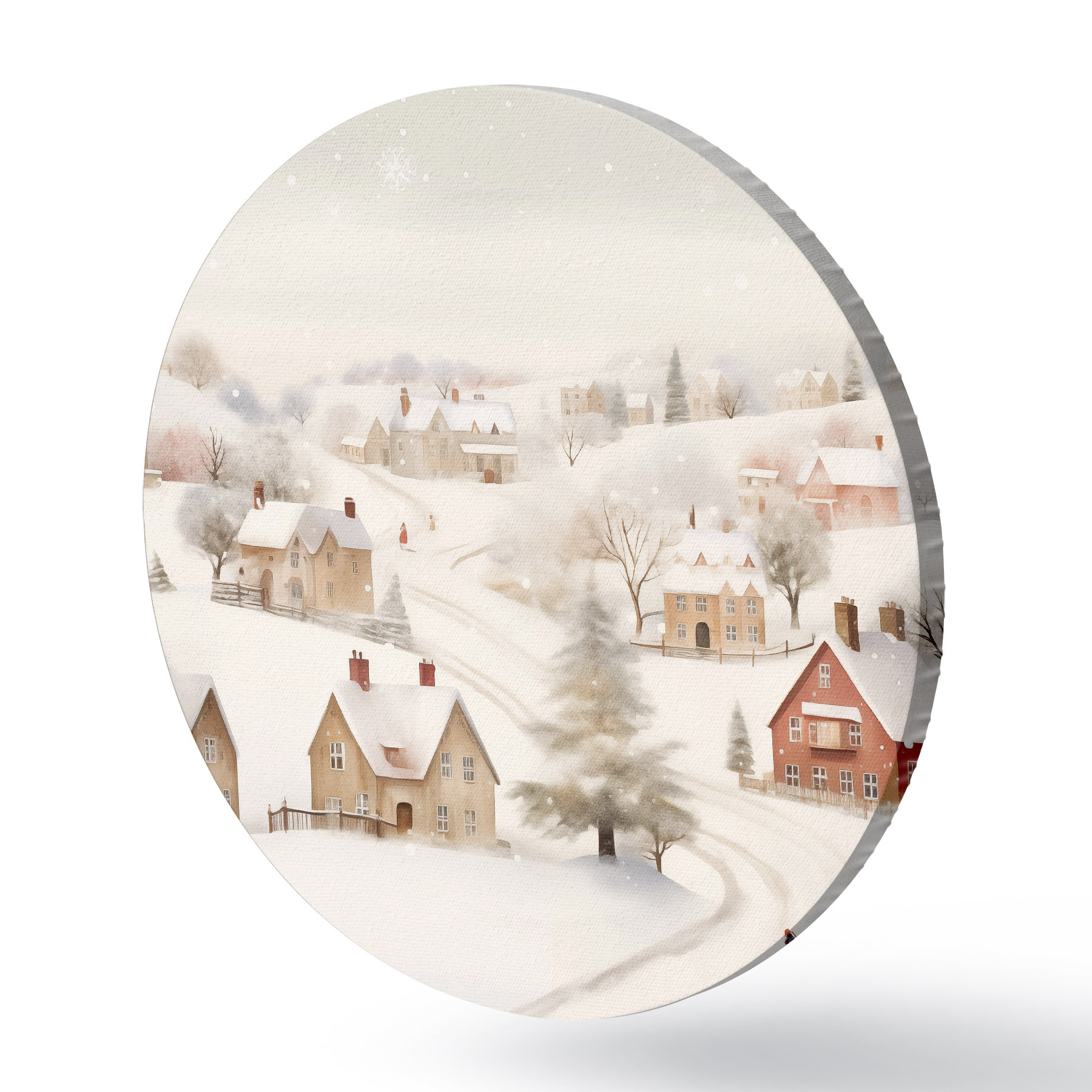 Runde Gemälde Winterdorf, Aquarell, Schneeflocken, weiche Farben, Bäume, Landschaft r41381