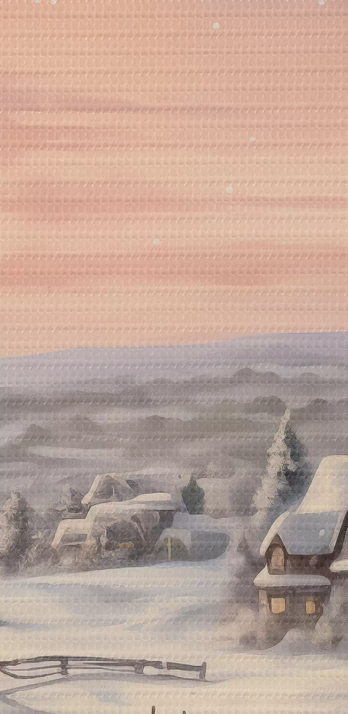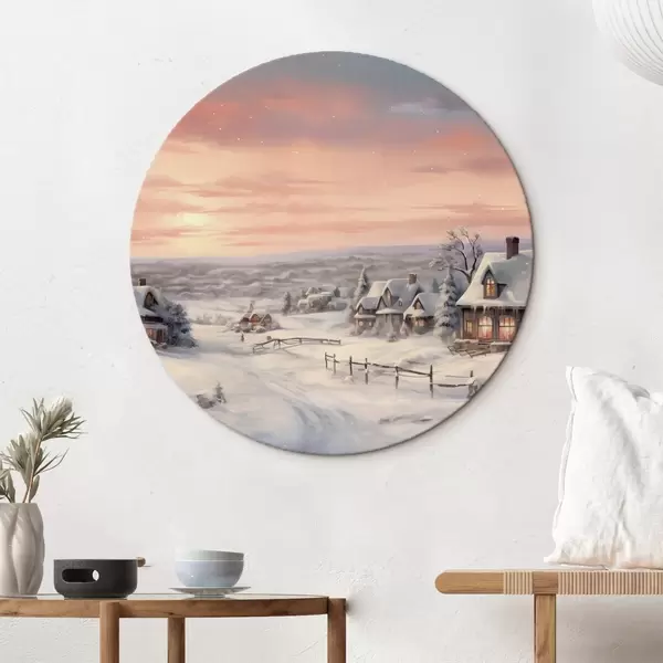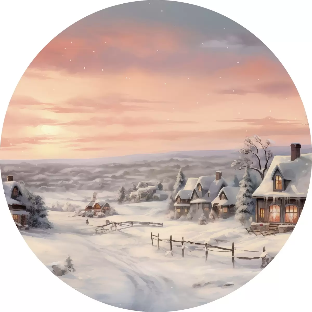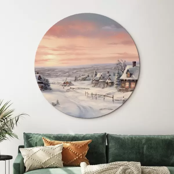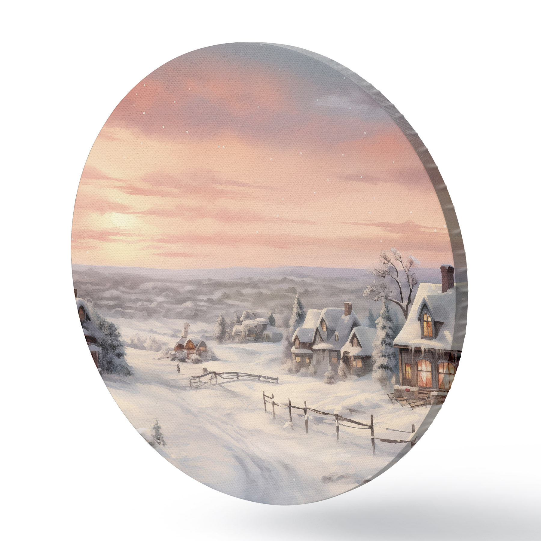 Runde Gemälde Sonnenuntergang im Winterdorf, rustikal, Aquarell, Schneeflocken r41386